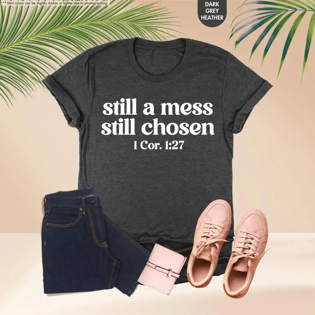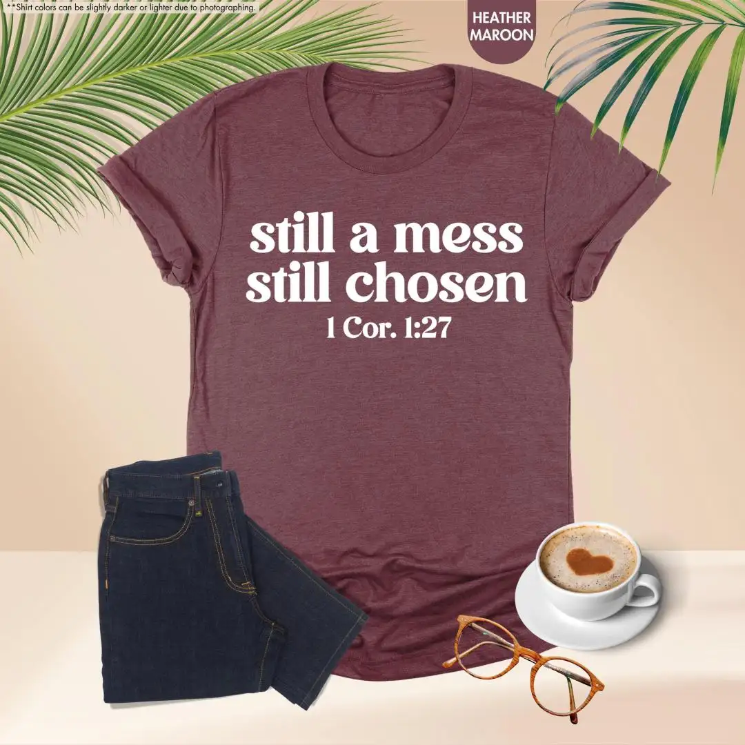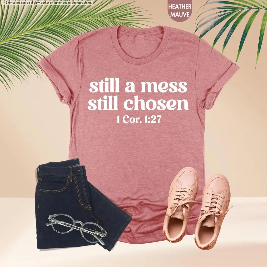 Bible Verse Christian Shirt, Religious Christmas Shirt, Christian Mom Gift, Faith Tee, Still a Mess Still Chosen Distressed Minimalistic Tee