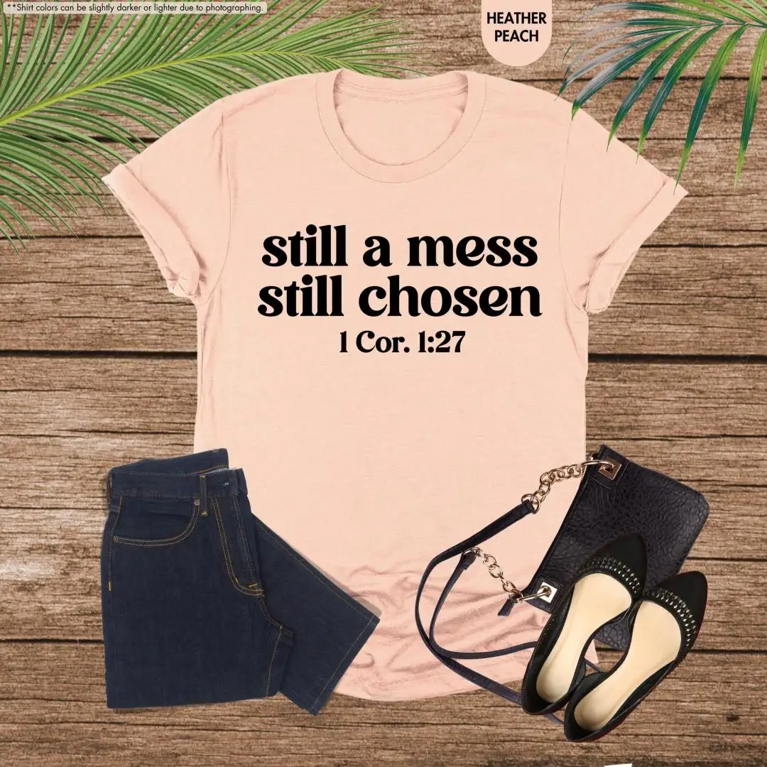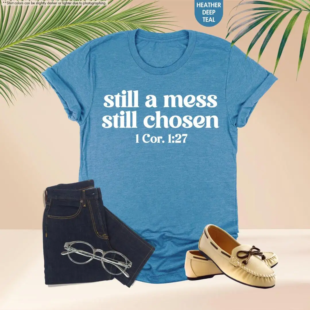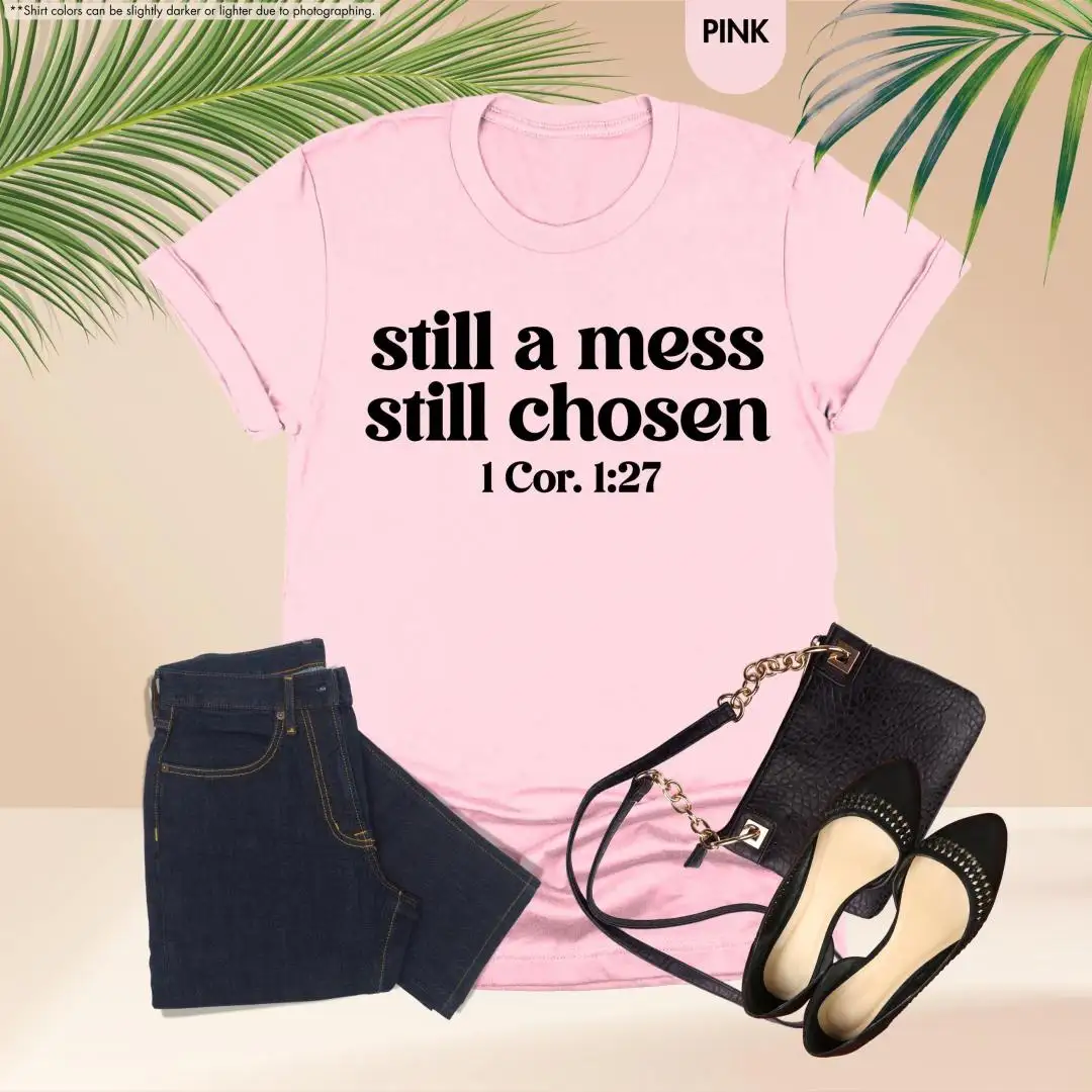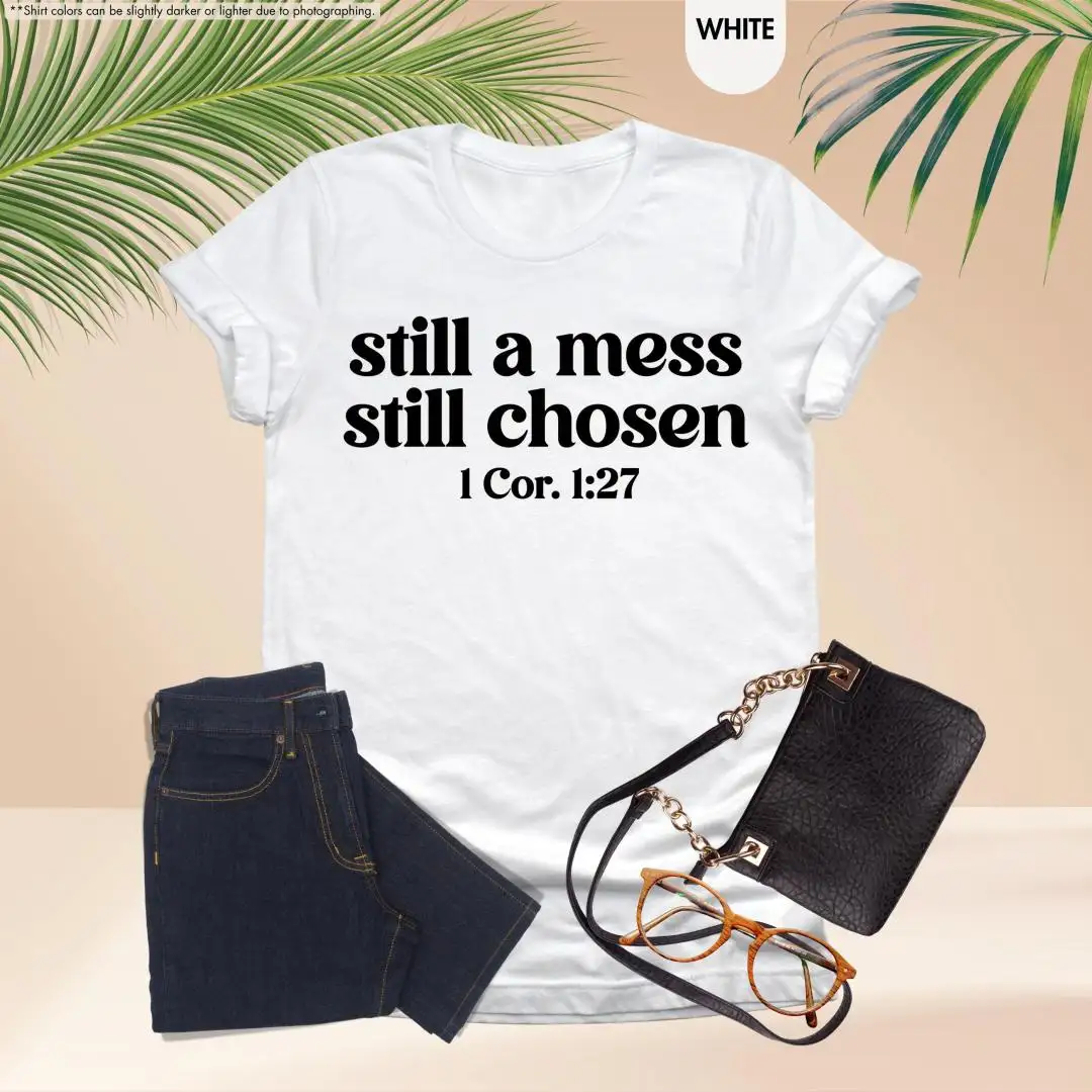 Bible Verse Christian Shirt, Religious Christmas Shirt, Christian Mom Gift, Faith Tee, Still a Mess Still Chosen Distressed Minimalistic Tee