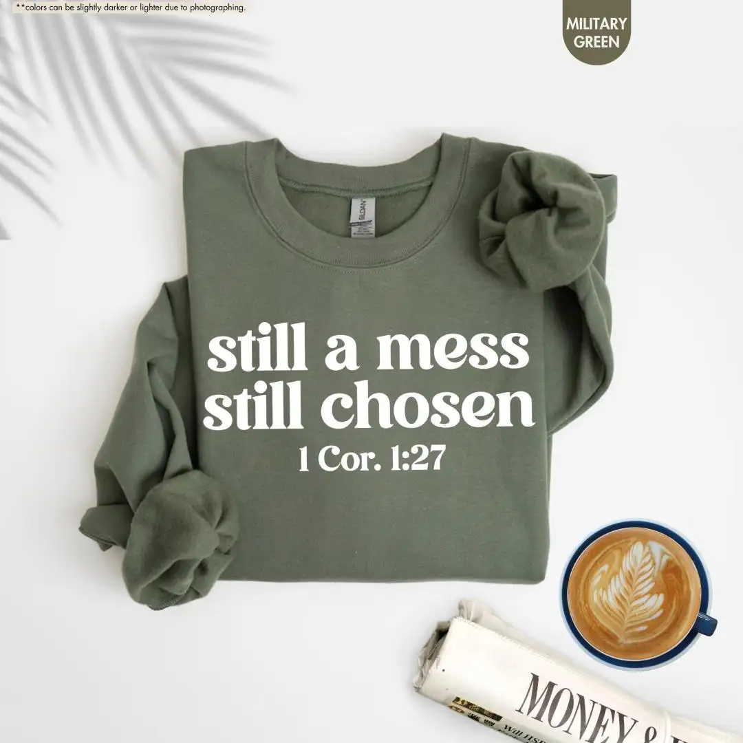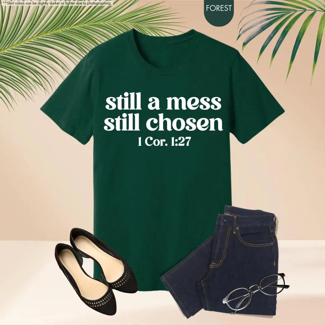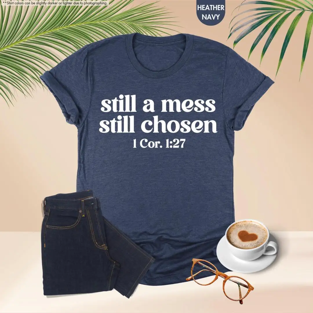 Review Bible Verse Christian Shirt, Religious Christmas Shirt, Christian Mom Gift, Faith Tee, Still a Mess Still Chosen Distressed Minimalistic Tee
