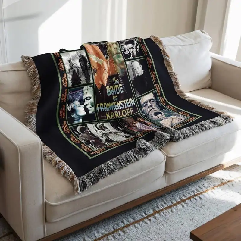 Bride of Frankenstein Woven Blanket, Frankenstein Vintage Horror Movie Blanket, Horror Christmas Decor Gift, Frankenstein Blanket