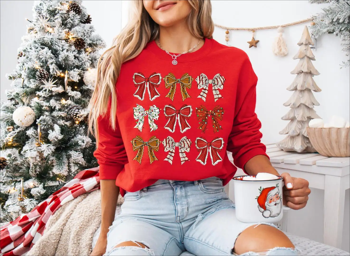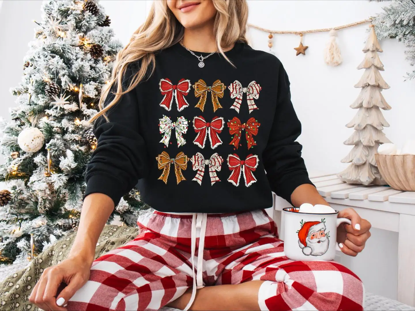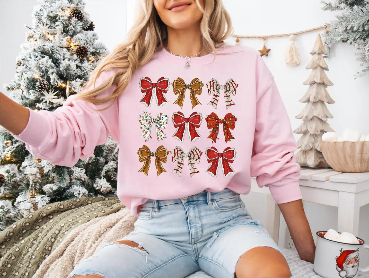 Review Christmas Bows Shirt, Merry Christmas Shirt, Christmas Lights Gingerbread Santa Bows Sweater, Christmas Coquette Bows Sweatshirt