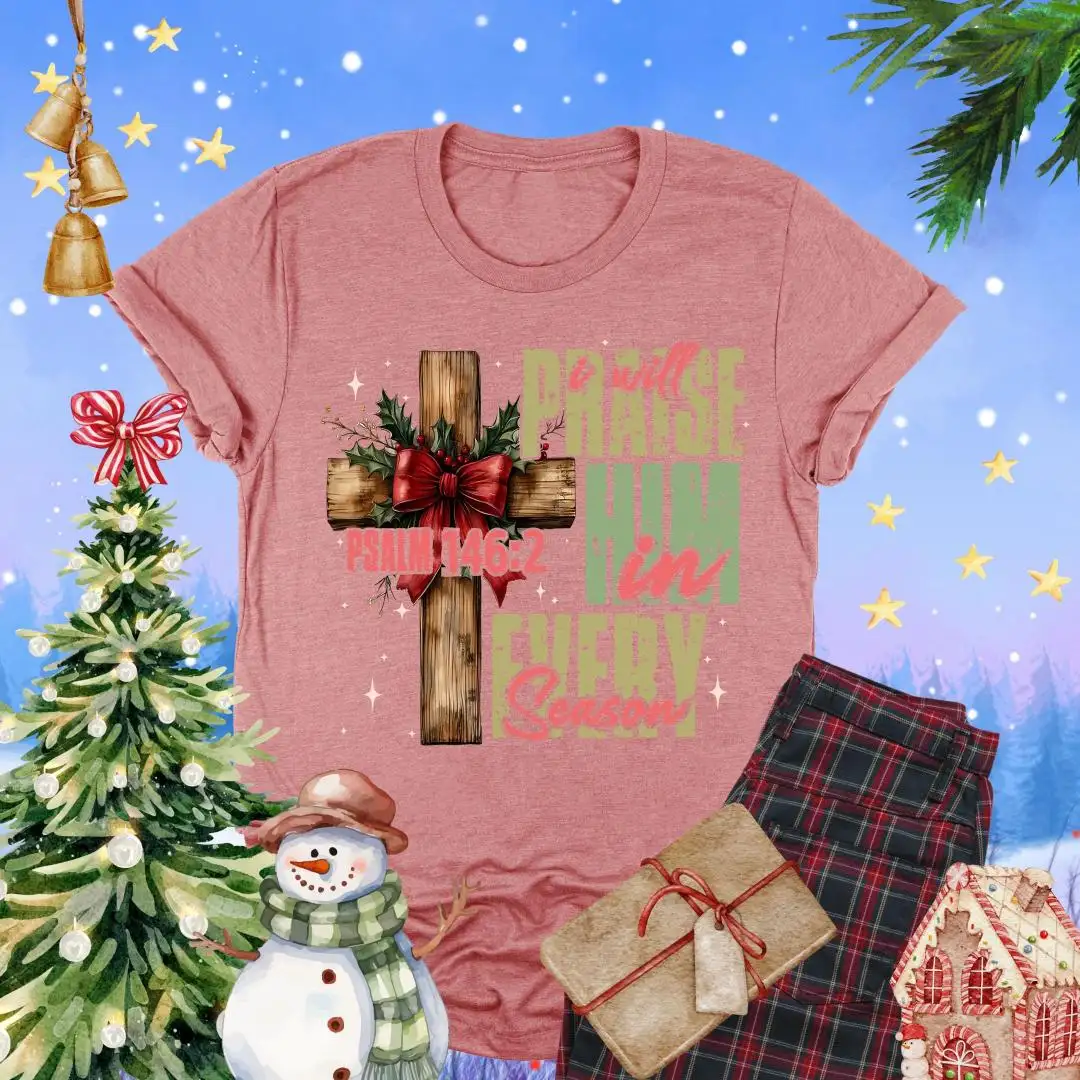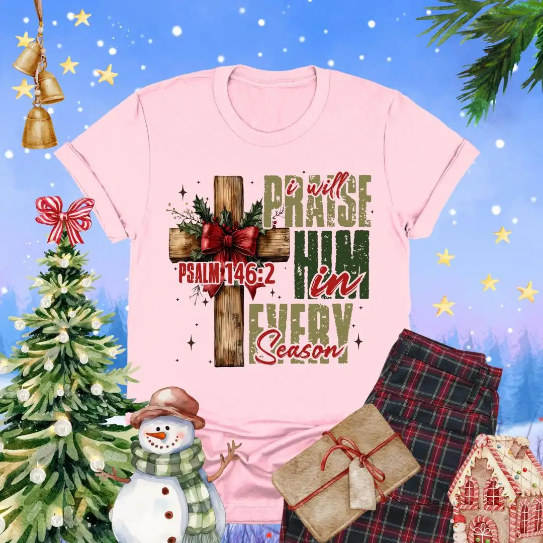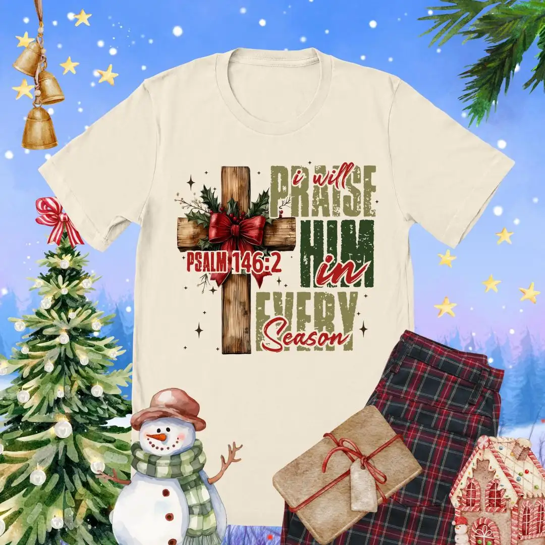 Christmas Christian Shirt, I Will Praise Him In Every Season Tee, Holiday Bible Verse Gift Women, Jesus Xmas Tee, Psalm 146:2 Cross Shirt