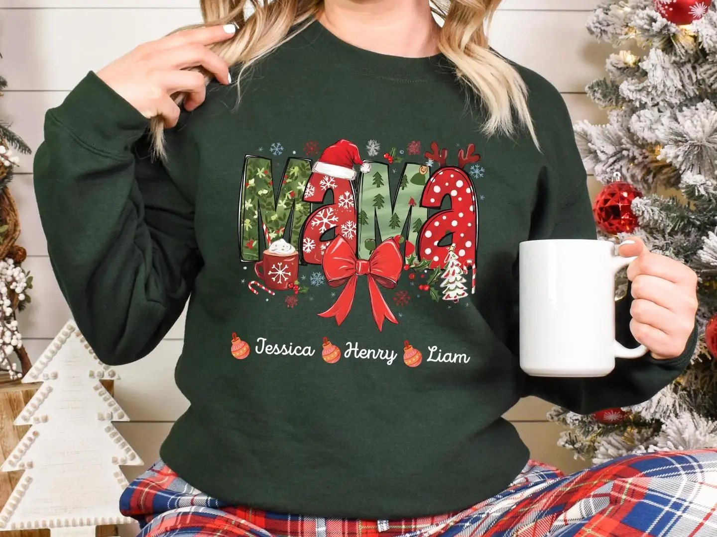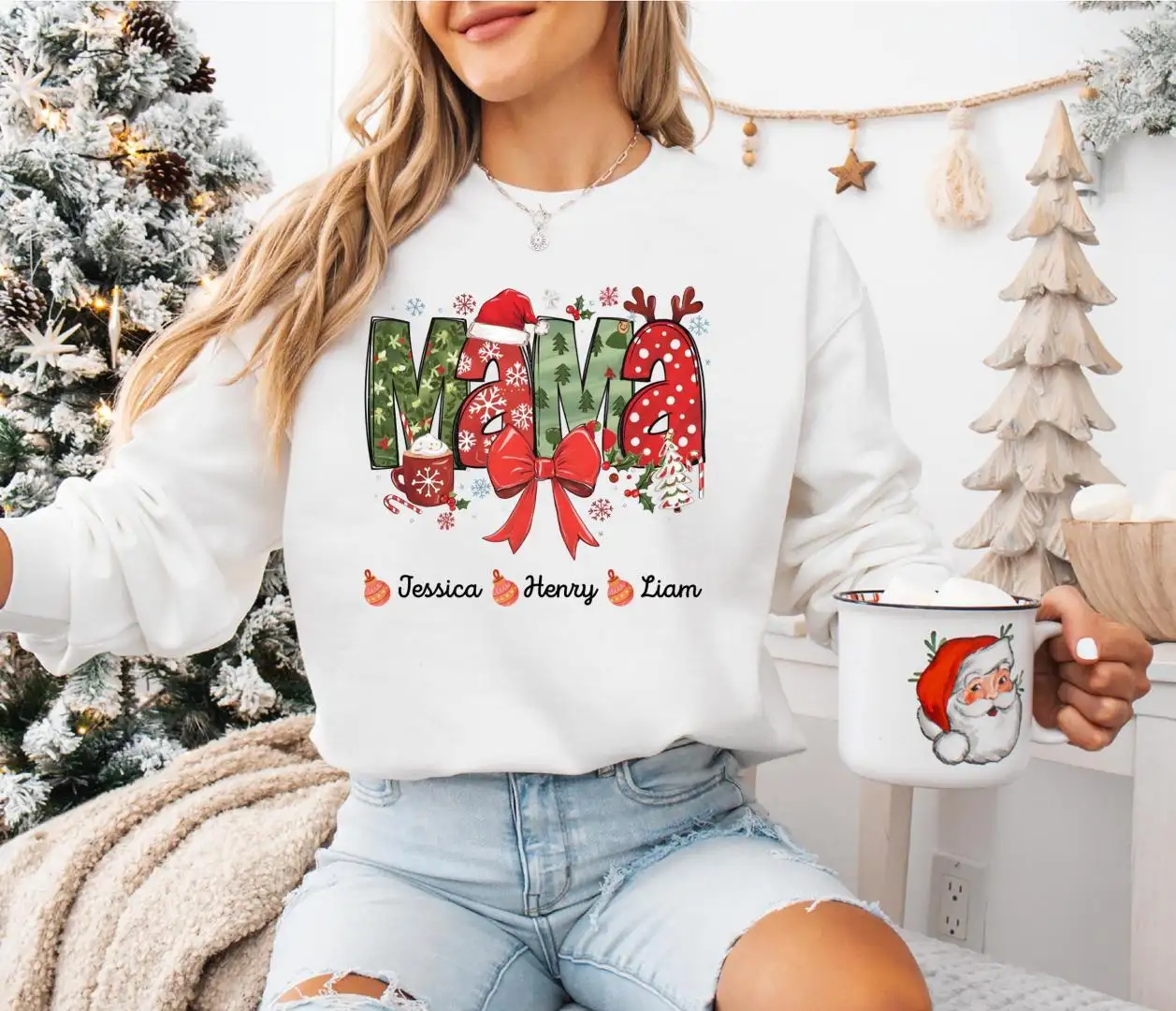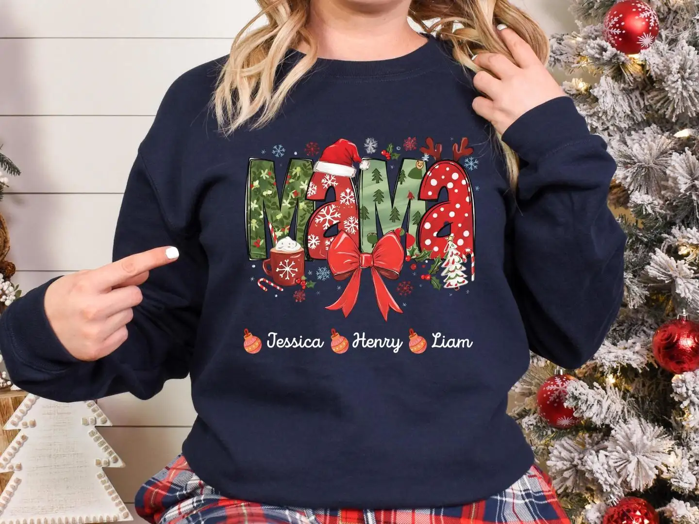 Christmas Mama Kids Name Shirt, Christmas Mom Gift, Coquette Bow Christmas Mama, Christmas Mama Claus Sweater., Custom Christmas Mama Shirt