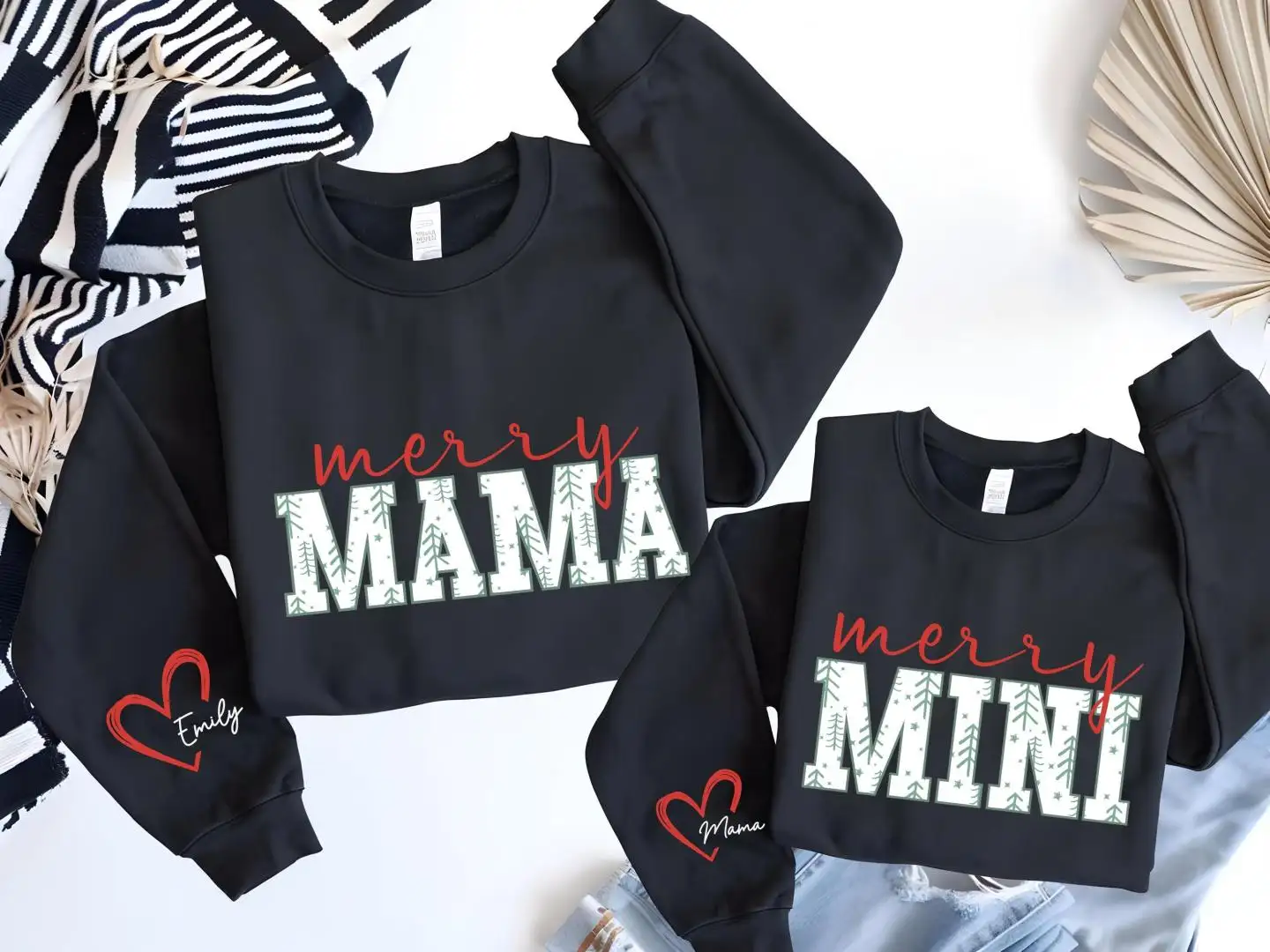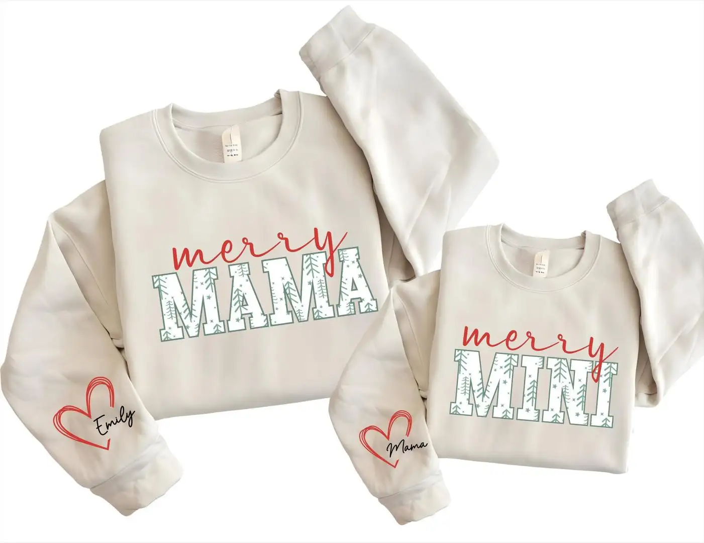 Christmas Merry Mama Mini Shirt, Personalized Mama Hoodie, Mama Mini Matching Crewneck, Mom Daughter Holiday Sweatshirt, Kids Name XMAS Tee