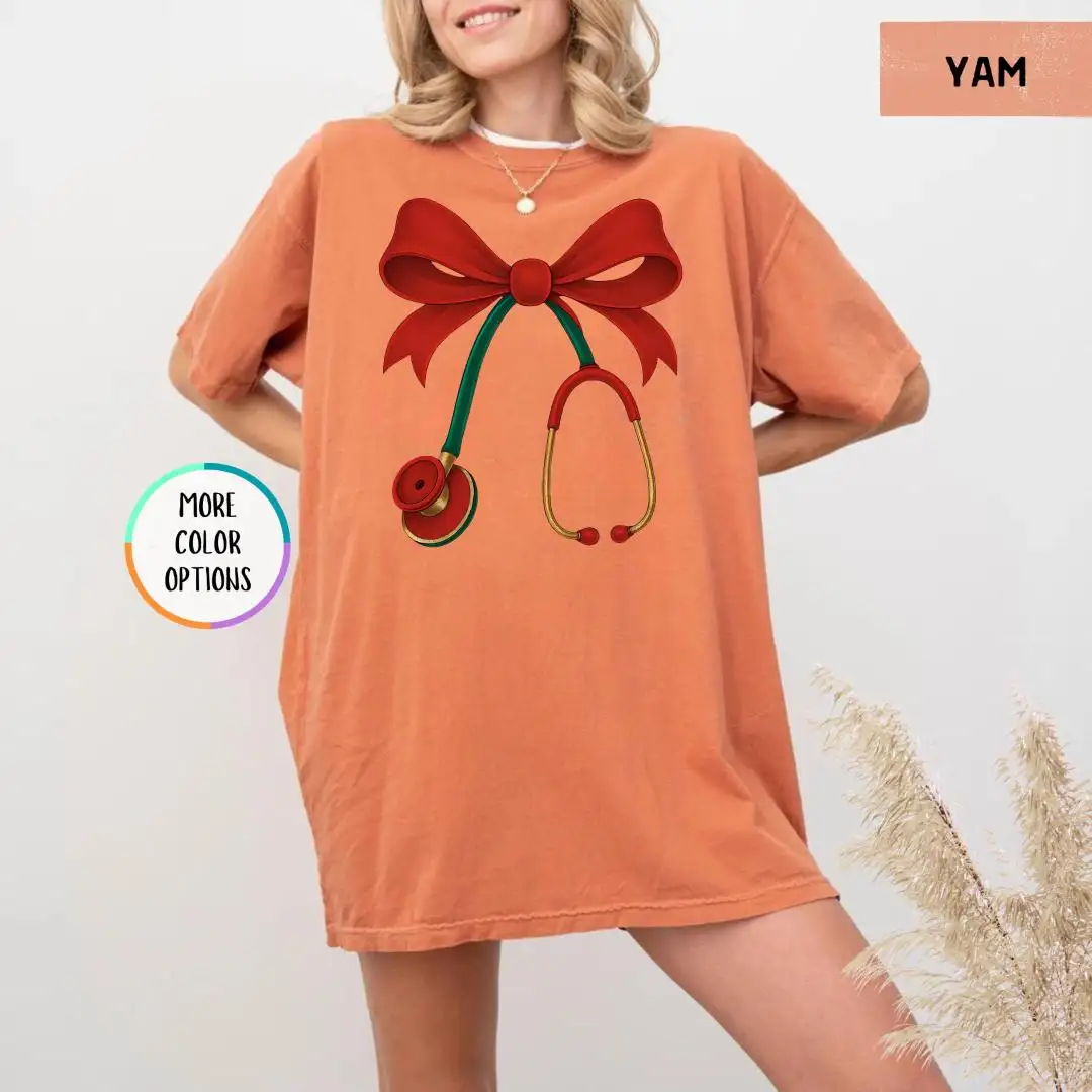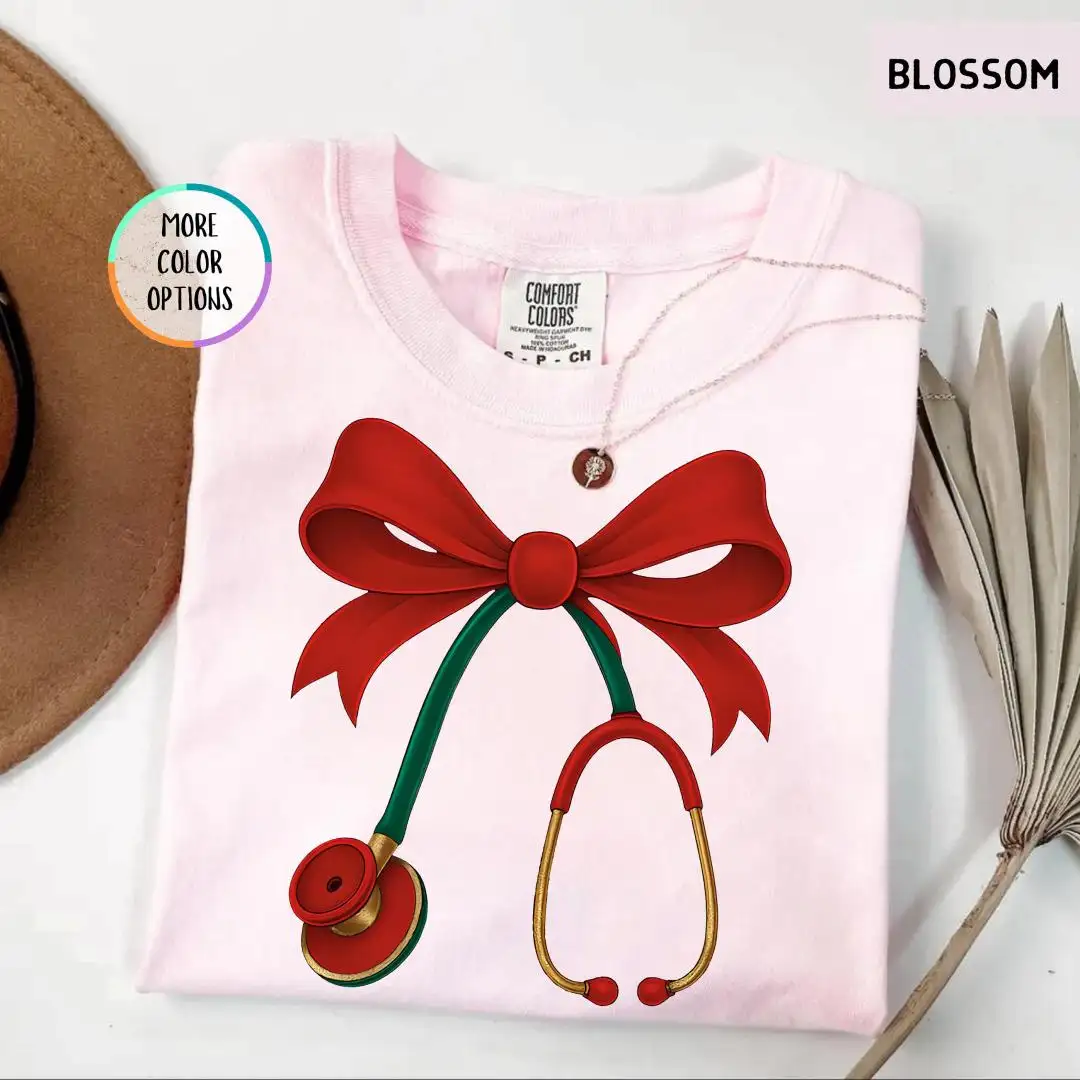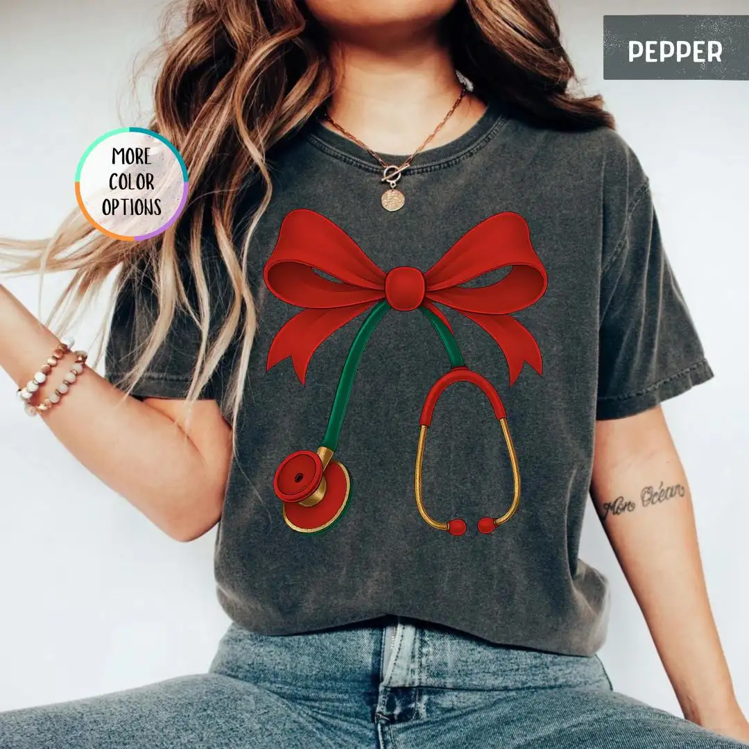 Review Christmas Nurse Comfort Colors Shirt, Red Bow Healthcare Top, Holiday Stethoscope Tee for Medical Workers, Cute Doctor Gift T Shirt