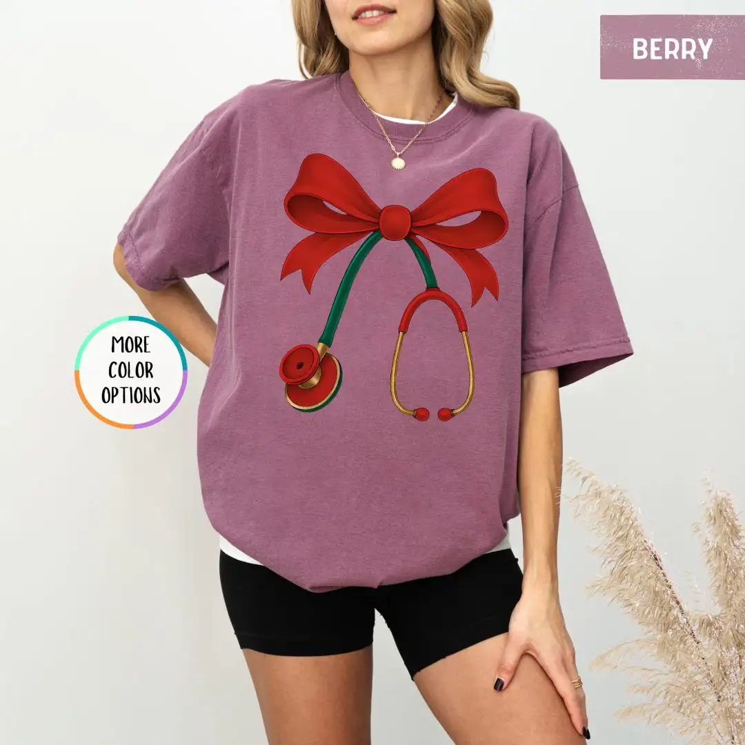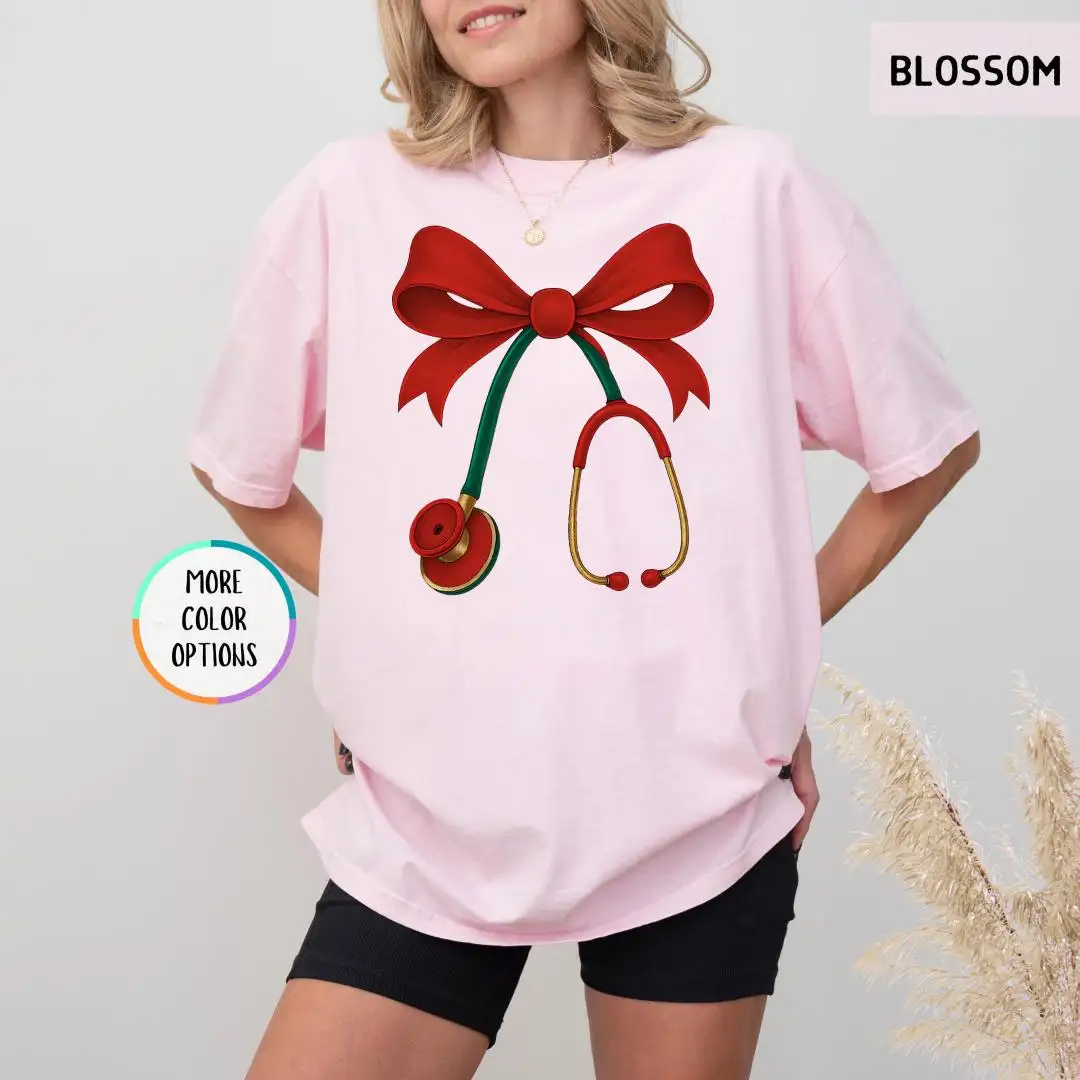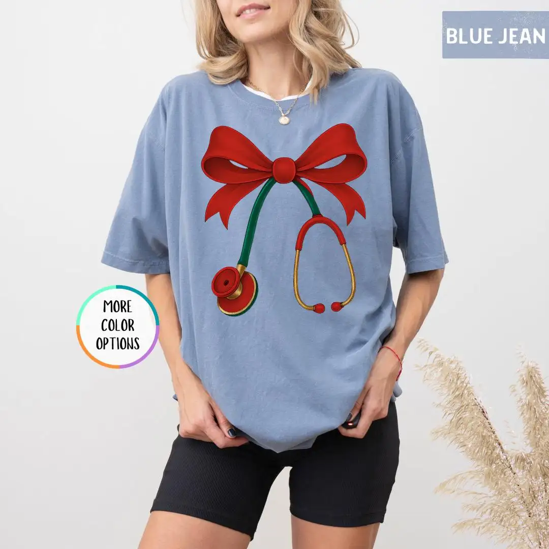 Christmas Nurse Comfort Colors Shirt, Red Bow Healthcare Top, Holiday Stethoscope Tee for Medical Workers, Cute Doctor Gift T Shirt
