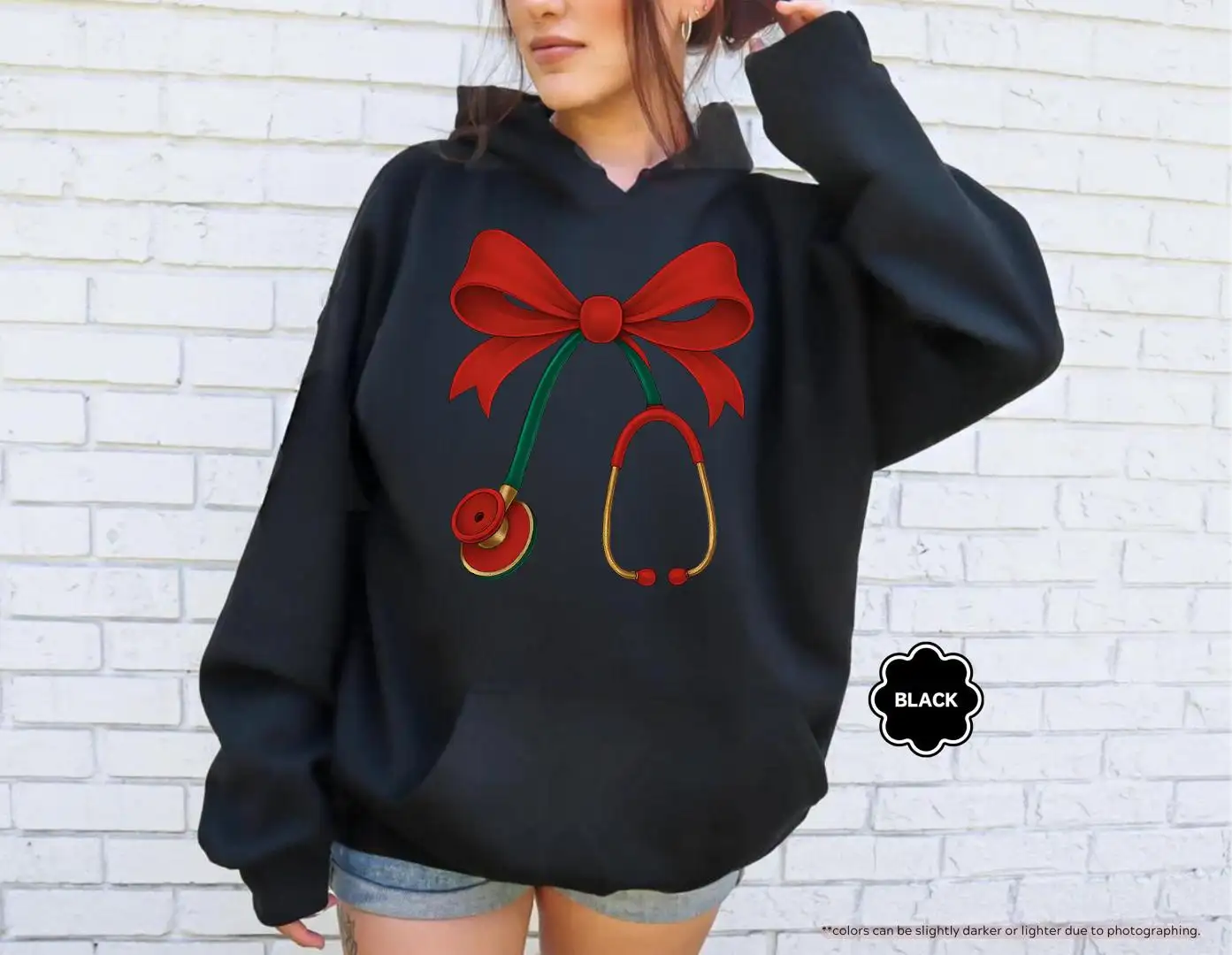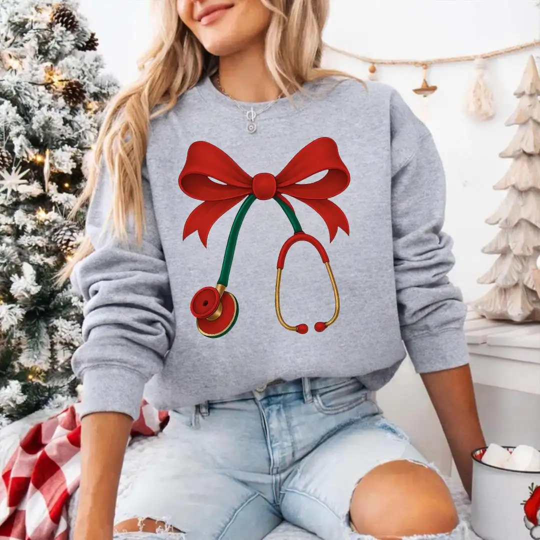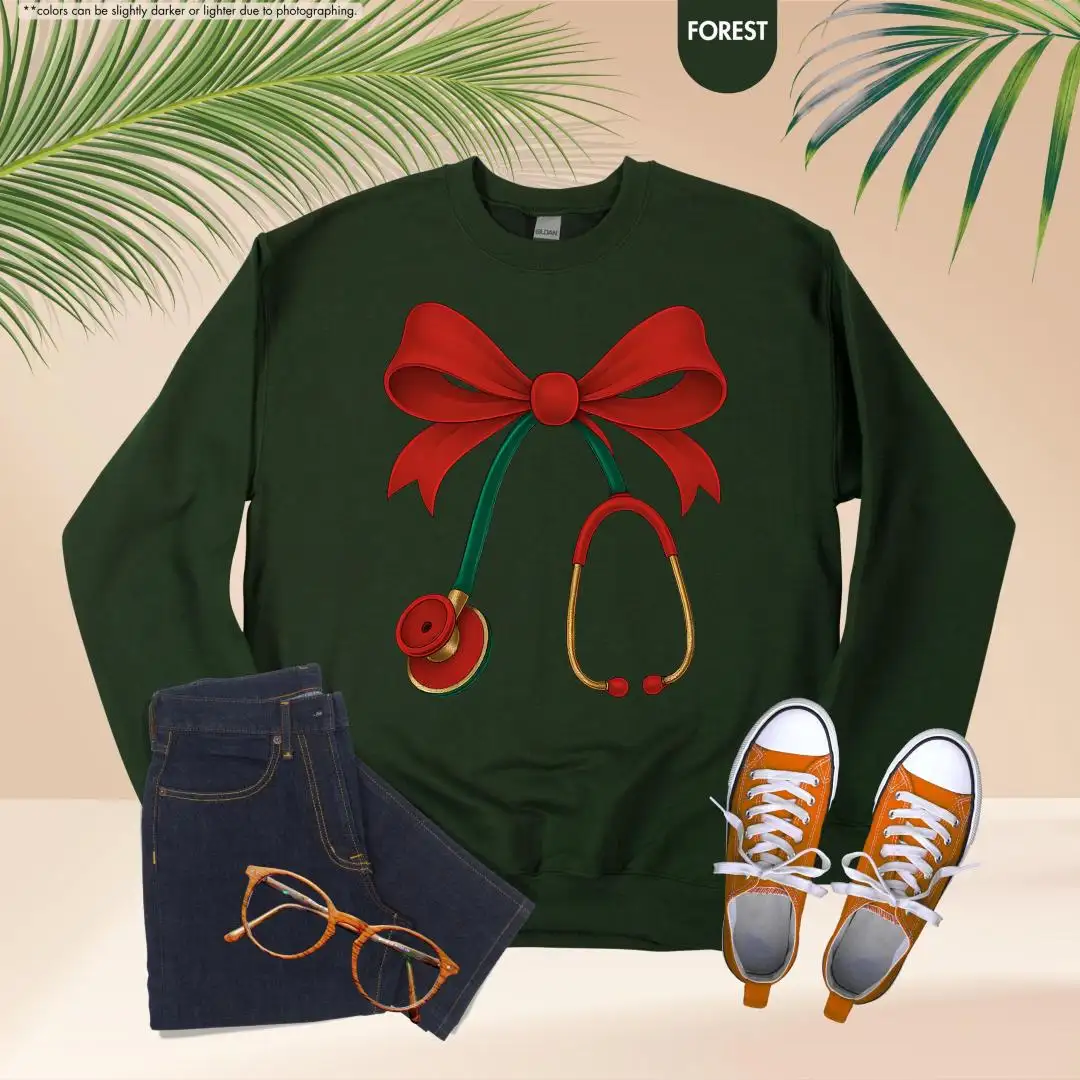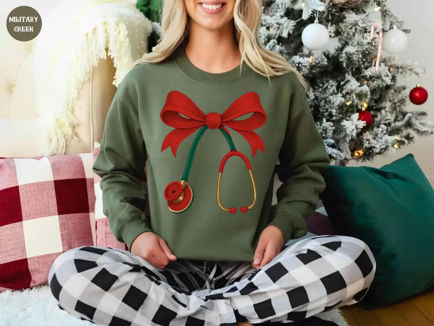 Christmas Nurse Sweatshirt, Cute Medical Christmas Crewneck, Doctor RN Gift, Healthcare Xmas Sweatshirt, Stethoscope Bow Holiday Hoodie