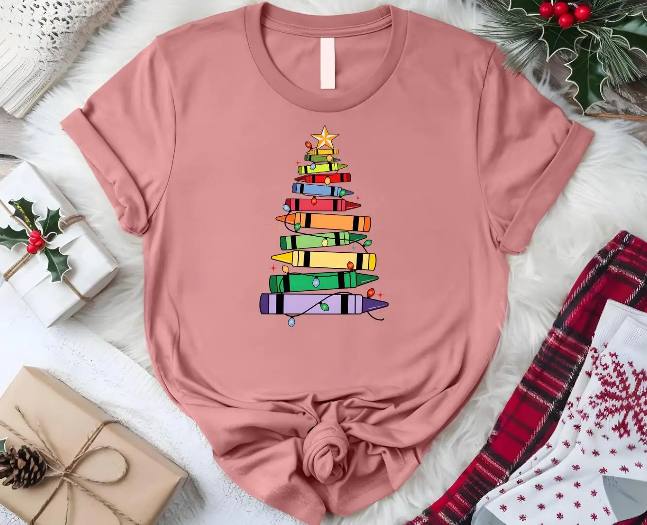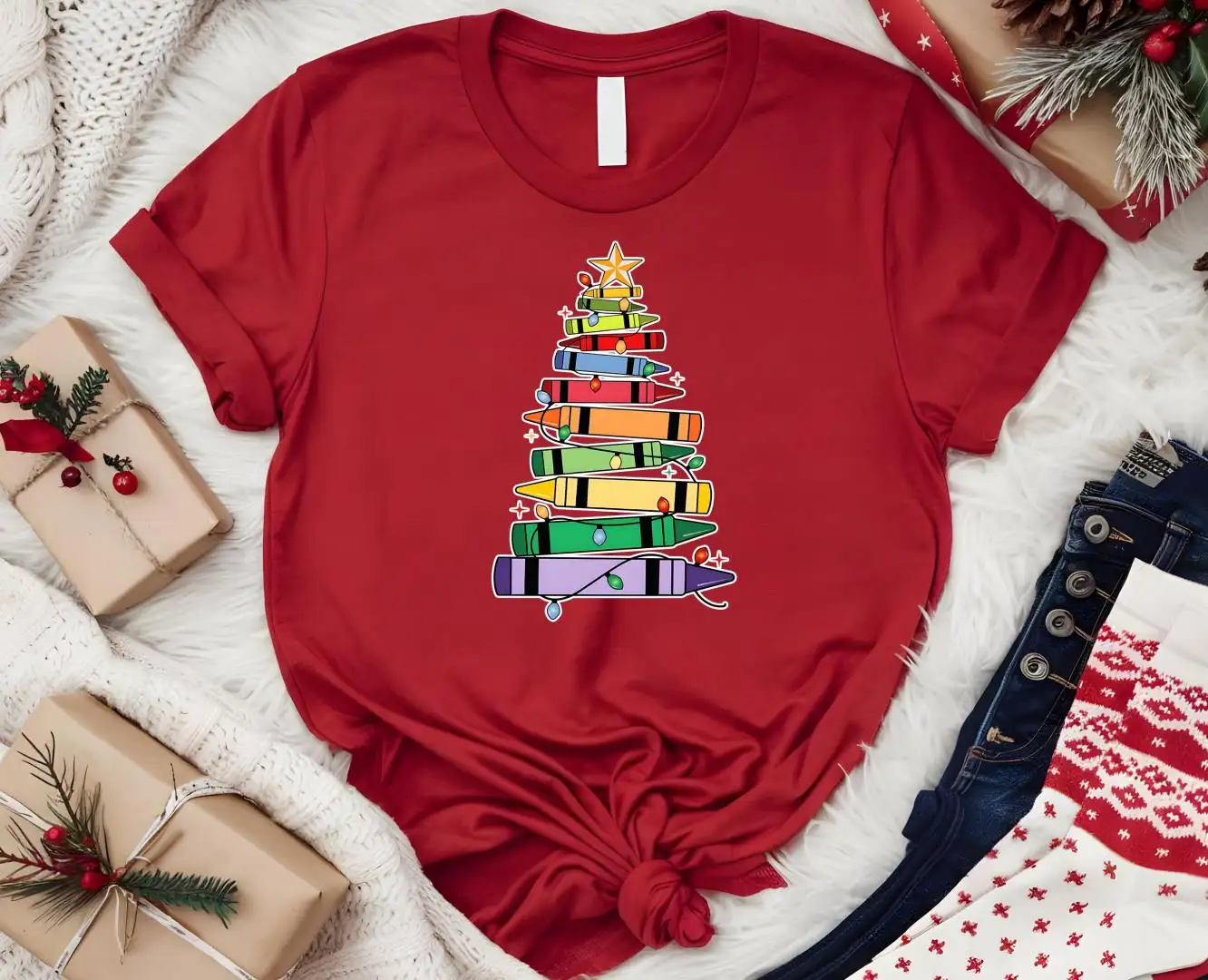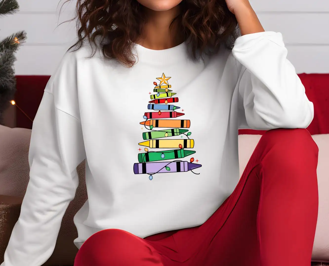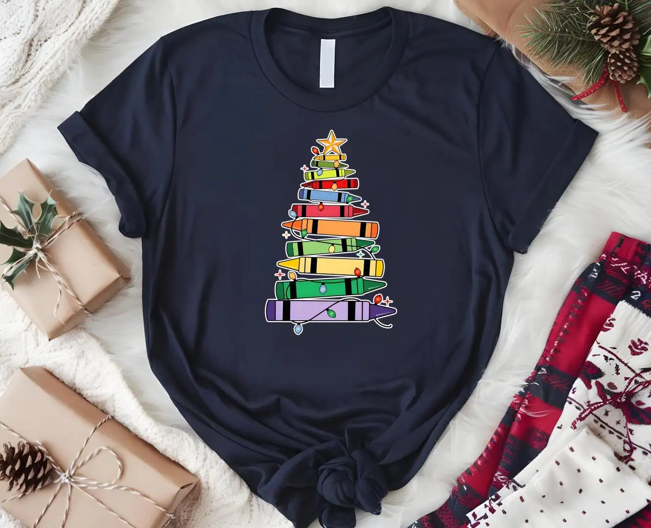 Christmas Teacher Crayon Shirt, Teacher's Day Gift, Teacher Xmas Tee, Crayons Christmas Tree Shirt, Preschool Teacher Sweaters