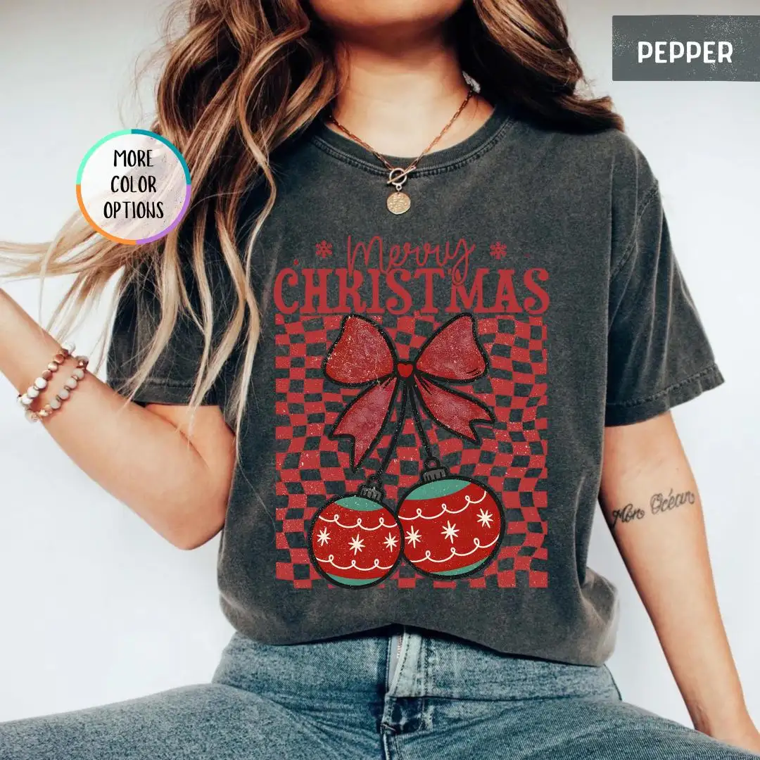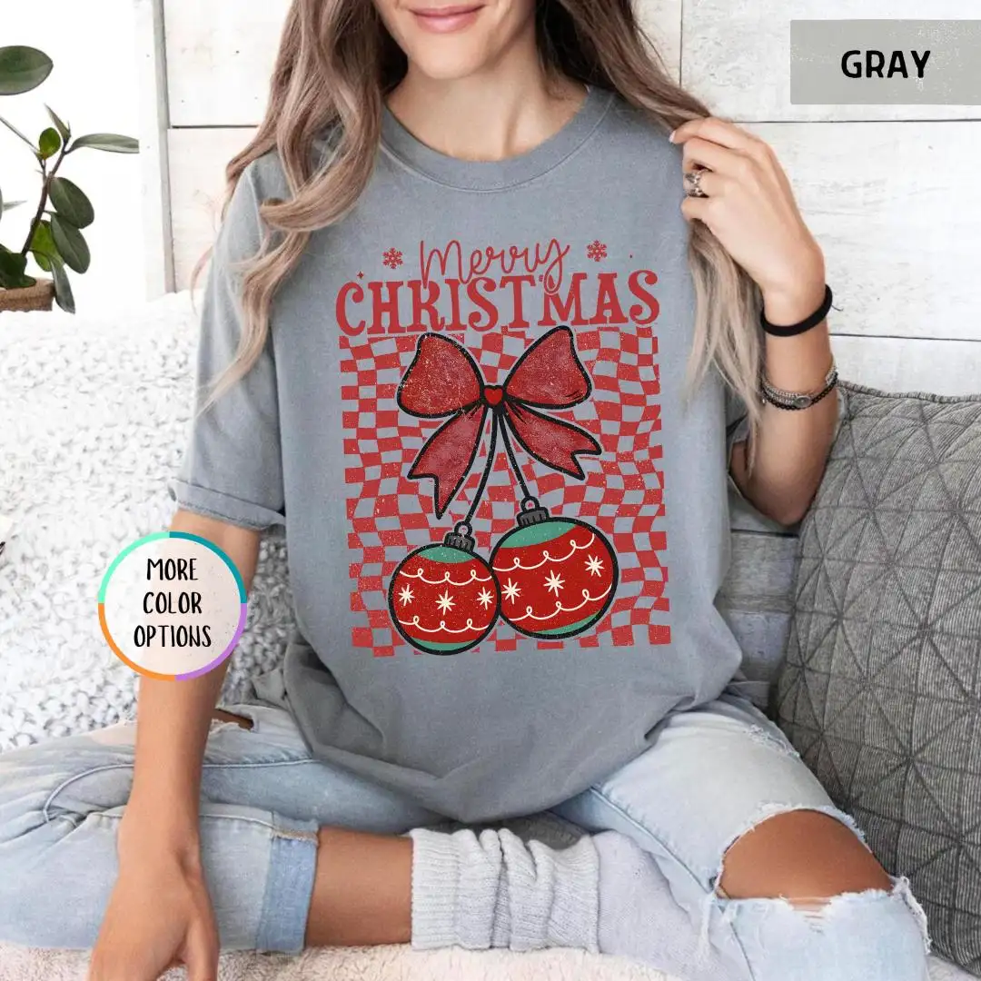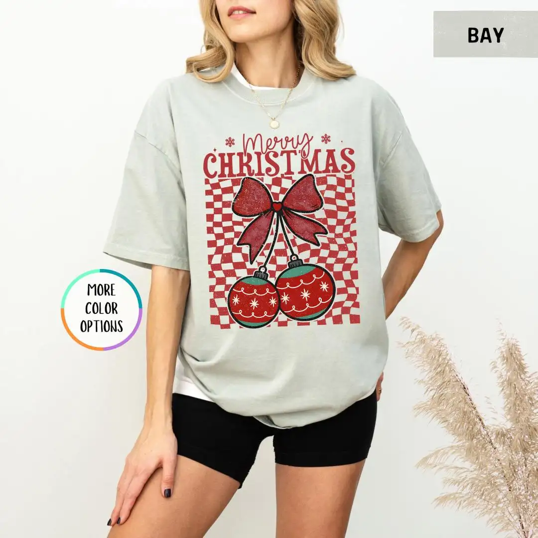 Review Comfort Colors Christmas Shirt, Festive Winter Outfit, Holiday Red Bow Shirt For Women, Merry Christmas T-Shirt, Retro Style Ornament Tee