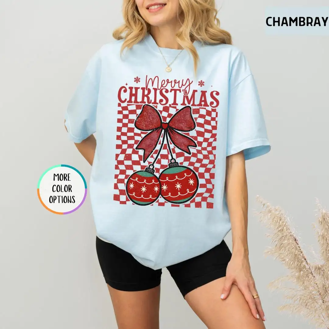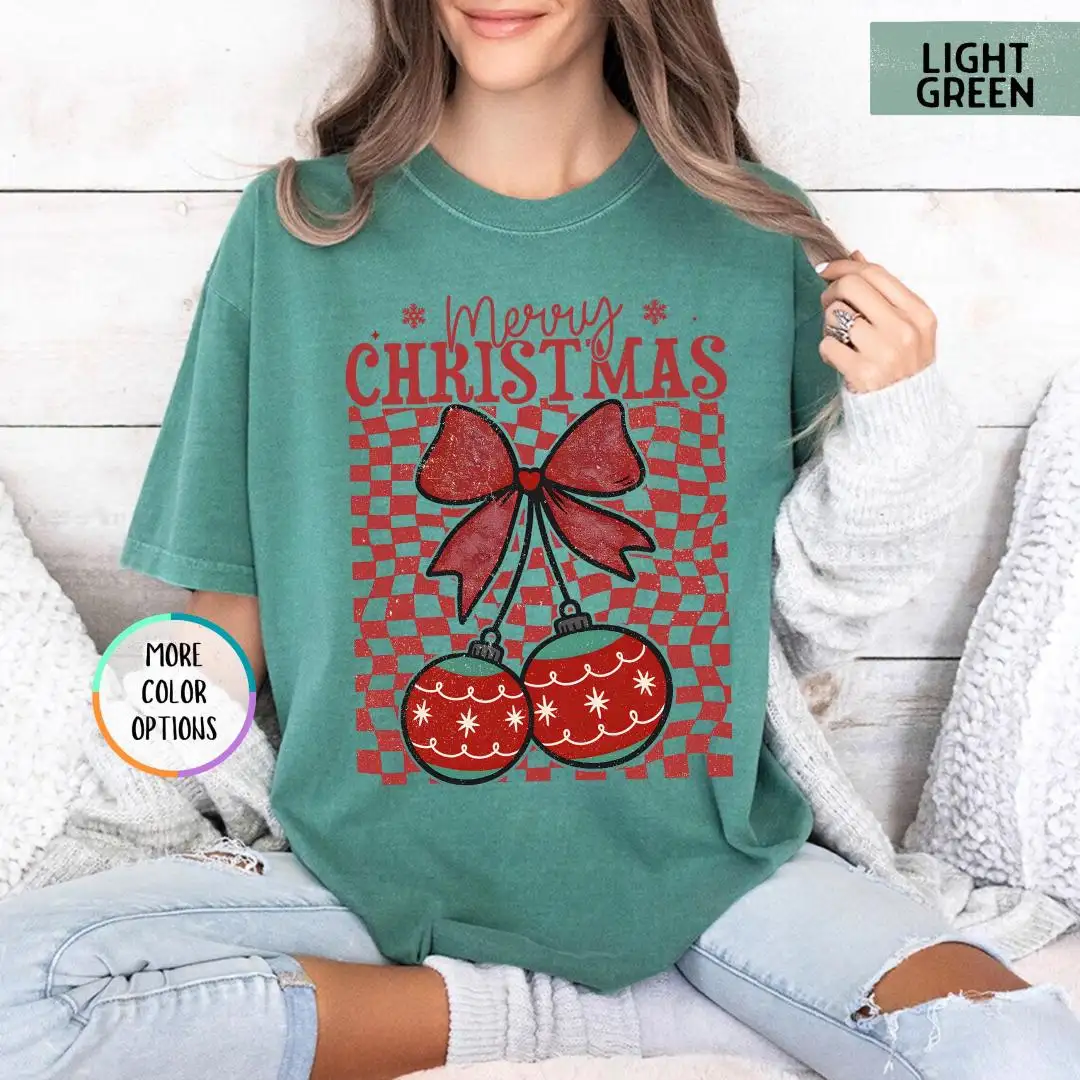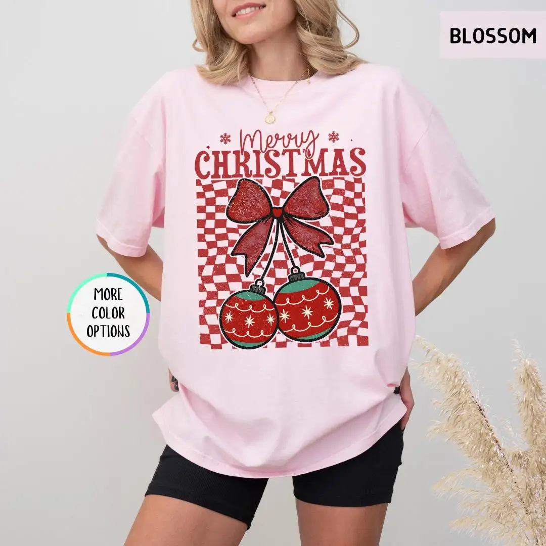 Review Comfort Colors Christmas Shirt, Festive Winter Outfit, Holiday Red Bow Shirt For Women, Merry Christmas T-Shirt, Retro Style Ornament Tee