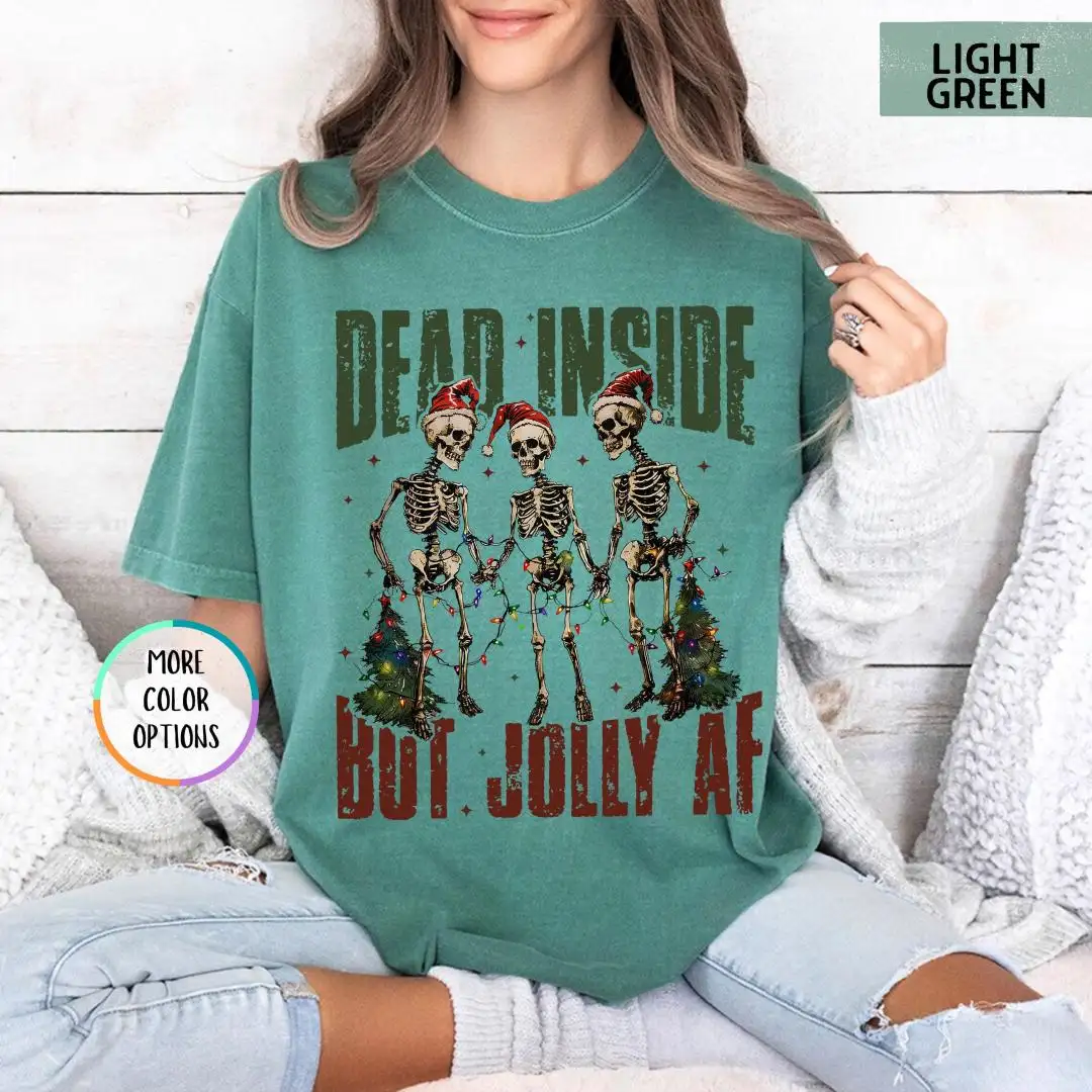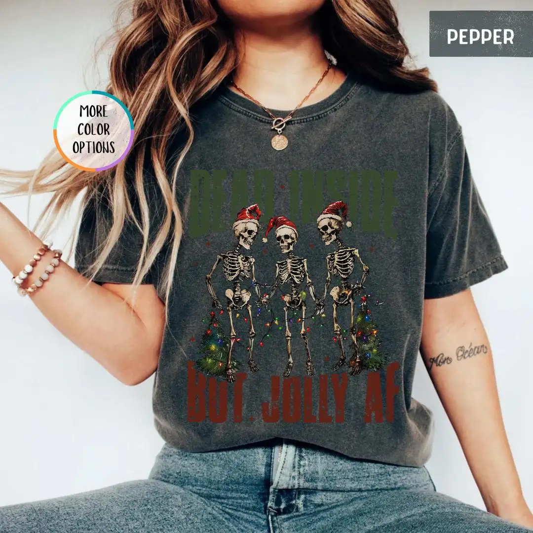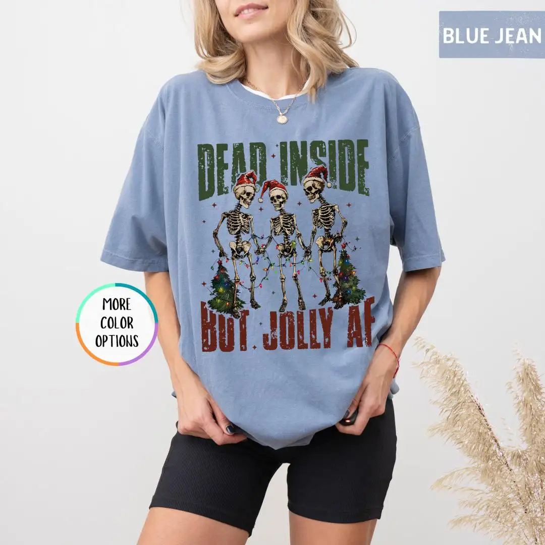 Comfort Colors Funny Christmas Shirt, Spooky Cute Xmas Gift, Dark Humor Holiday Top, Dead Inside Jolly AF Skeleton Tee, Grunge Retro Vibe