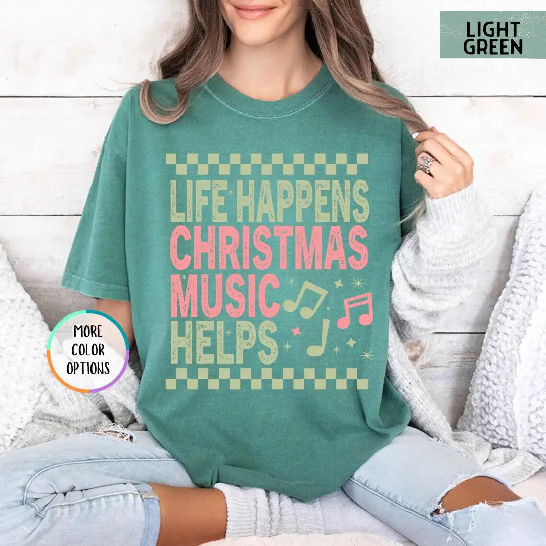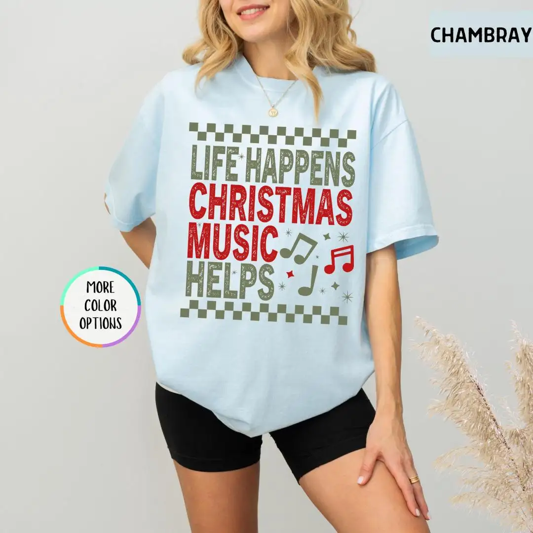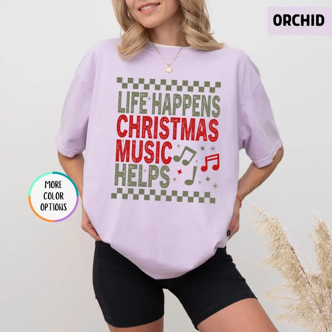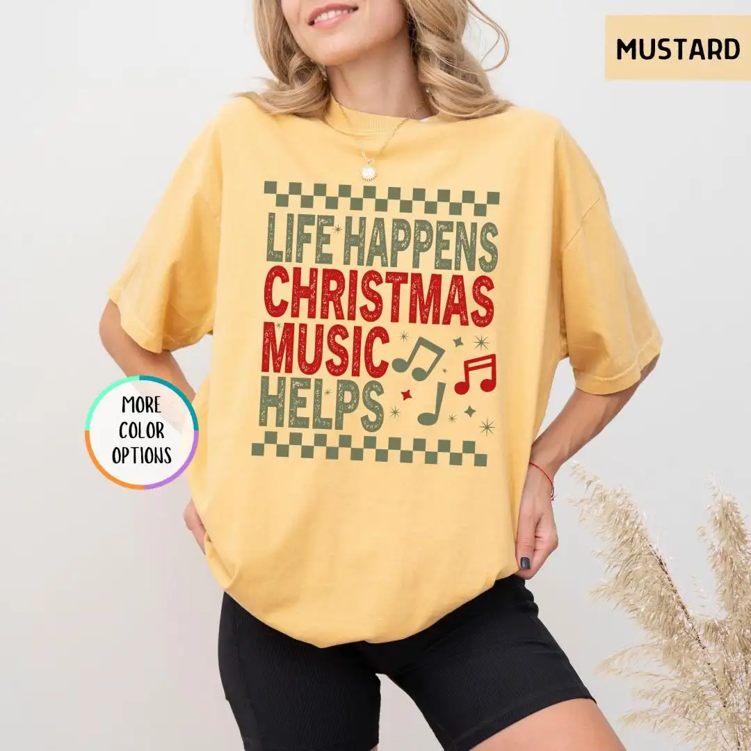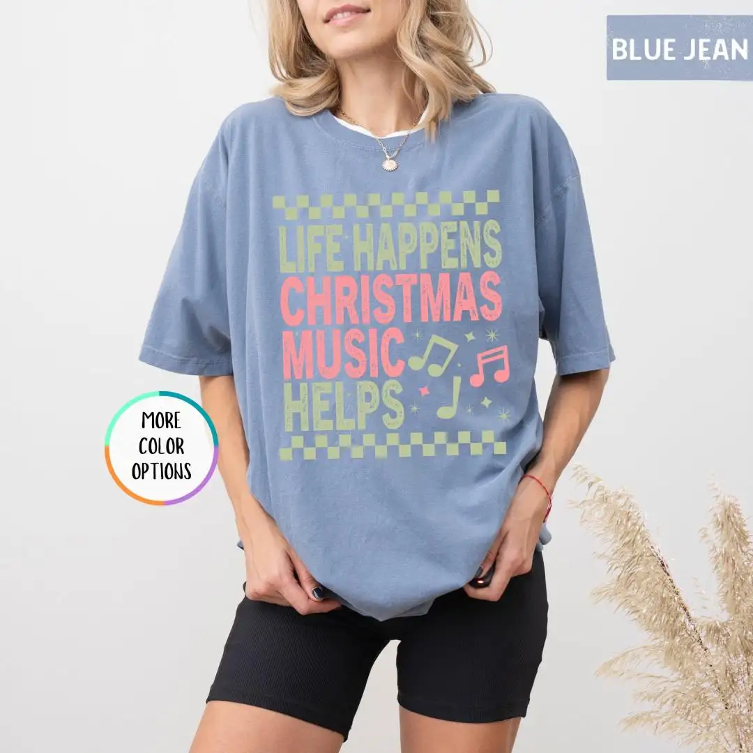 Comfort Colors Life Happens Christmas Music Helps Lover Shirt, Xmas Gift, Holiday Apparel, Christian Christmas Tee, Unisex Christmas Shirt
