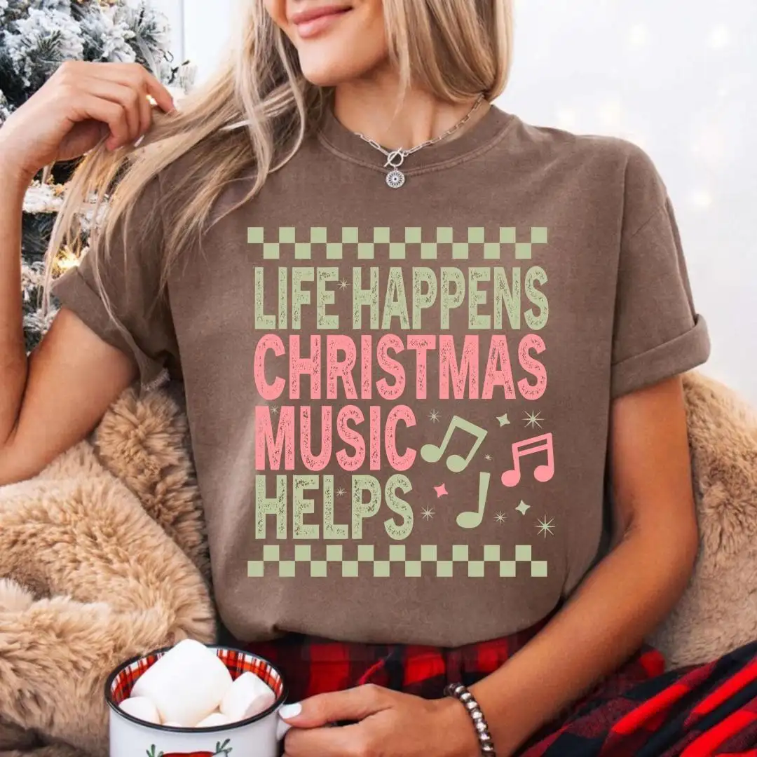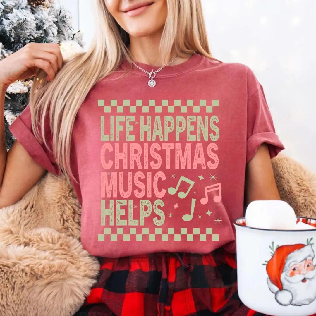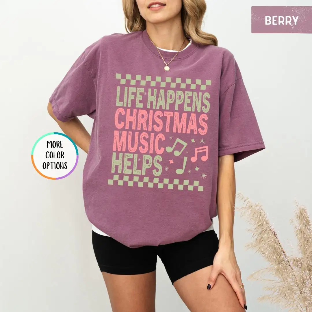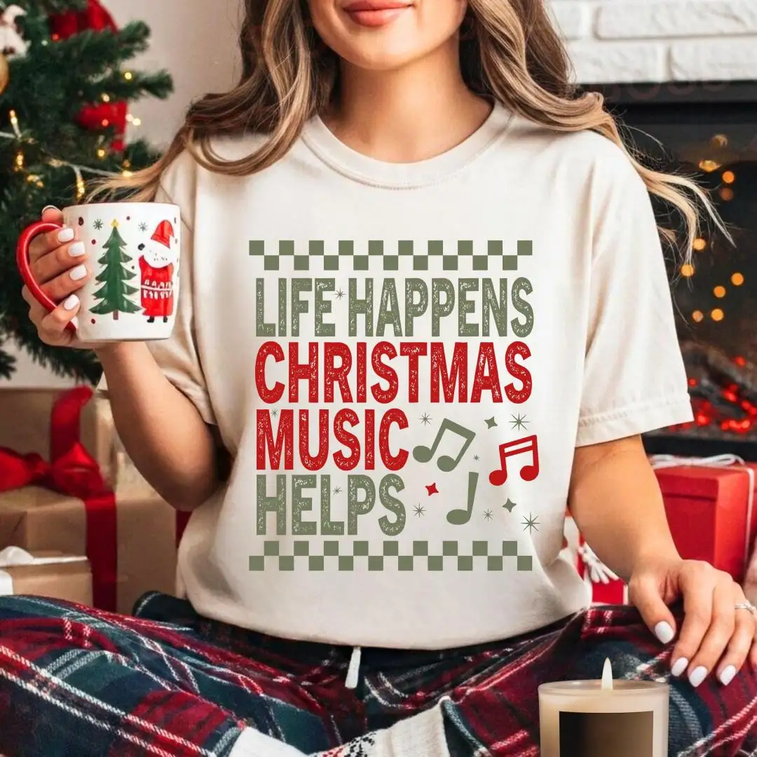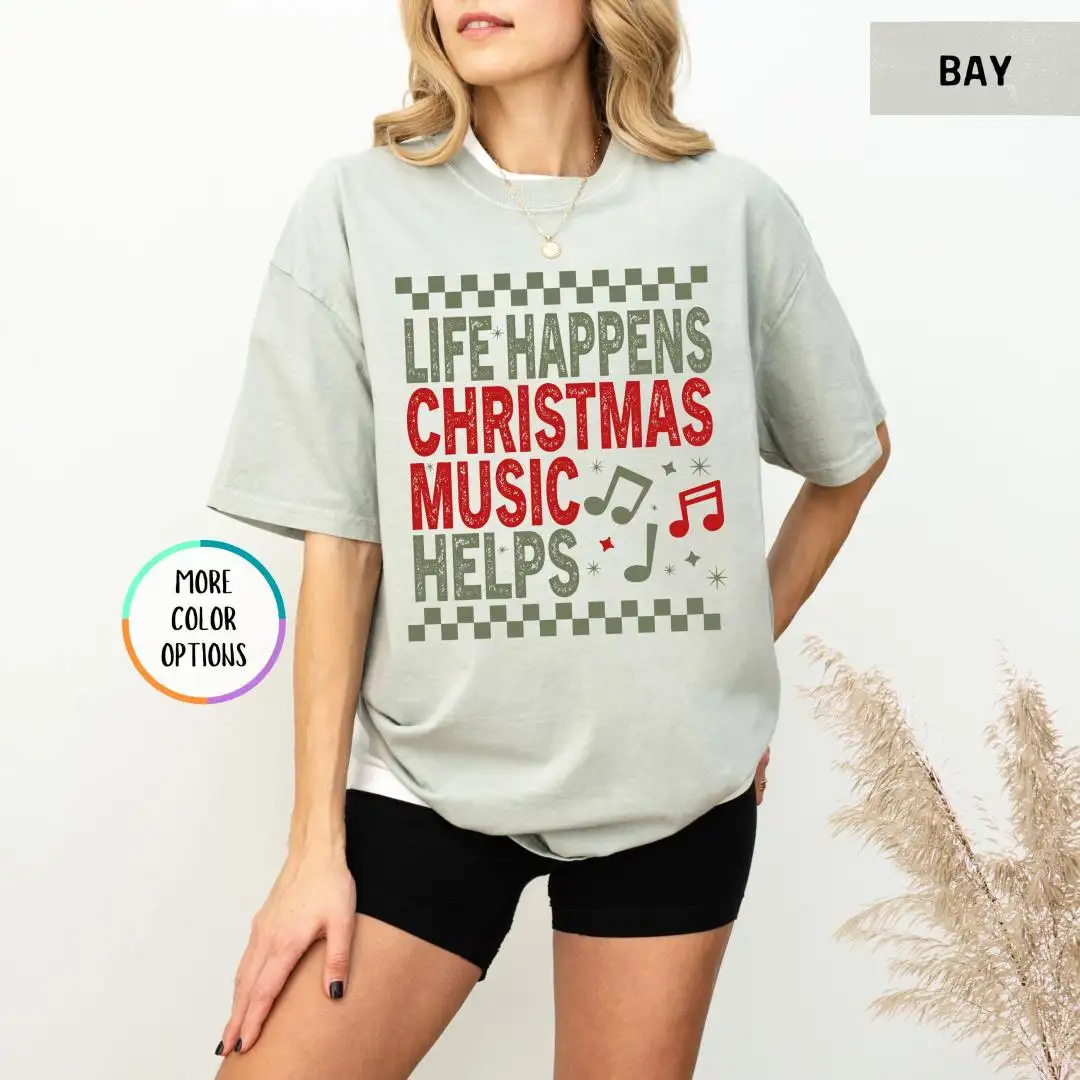 Comfort Colors Life Happens Christmas Music Helps Lover Shirt, Xmas Gift, Holiday Apparel, Christian Christmas Tee, Unisex Christmas Shirt