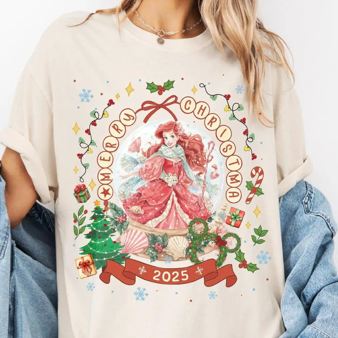 Comfort Colors® Merry Christmas 2025 Princess Snow Globe Shirt, Disney Princesses Merry Christmas T-Shirt, Princess Christmas Tee