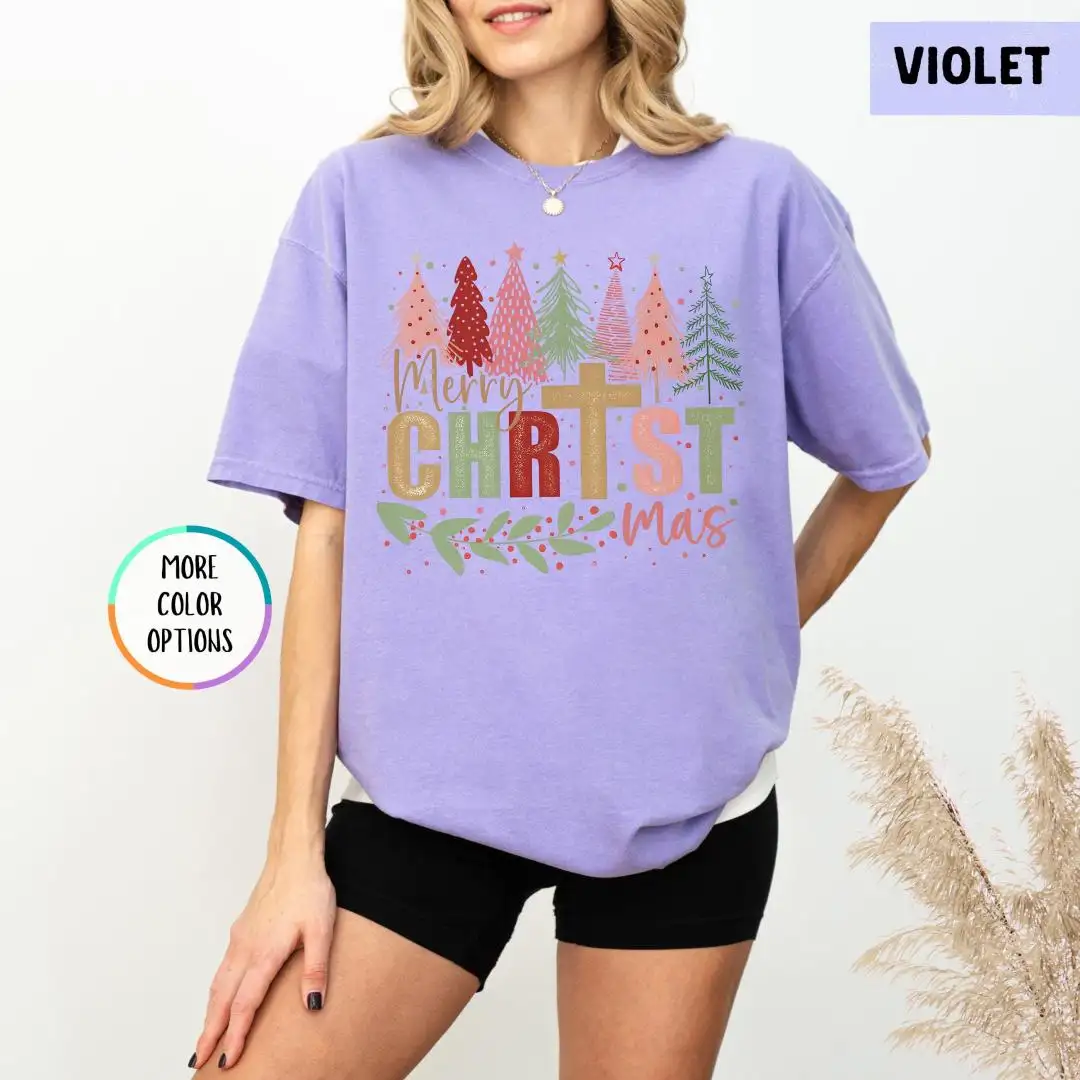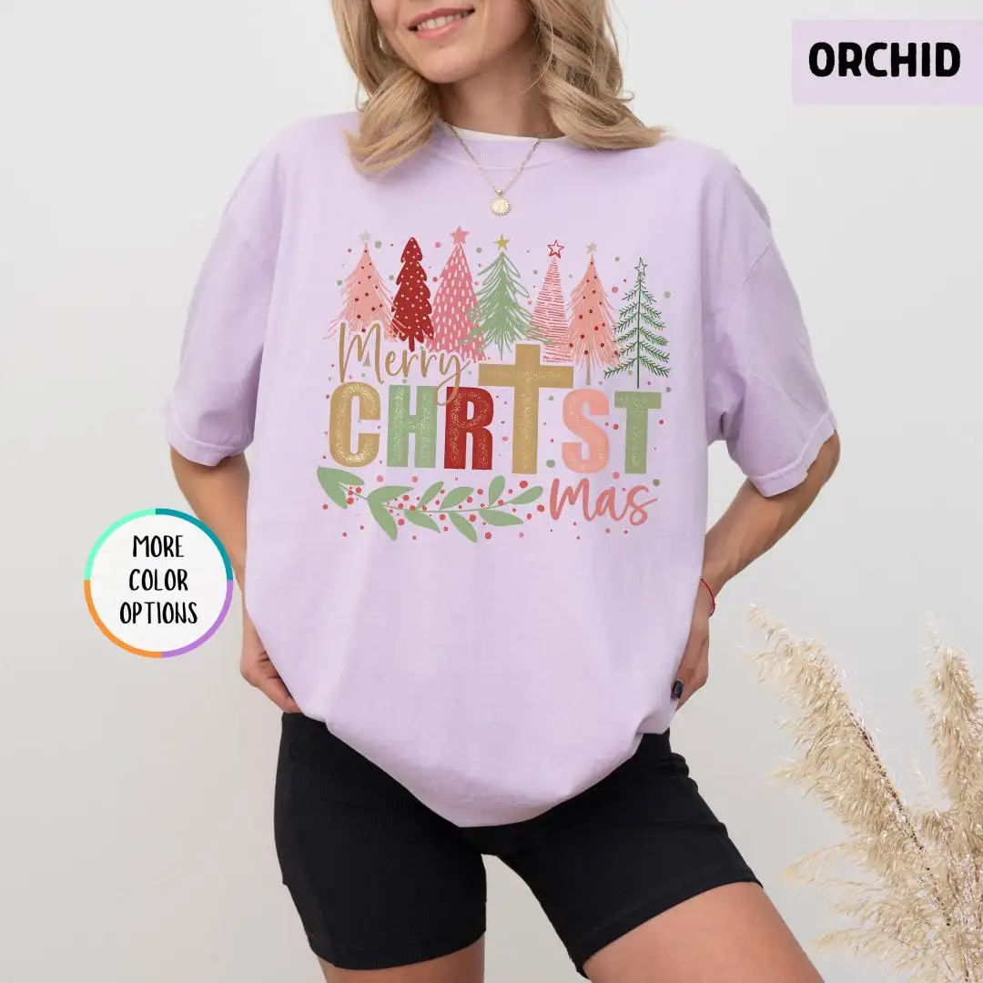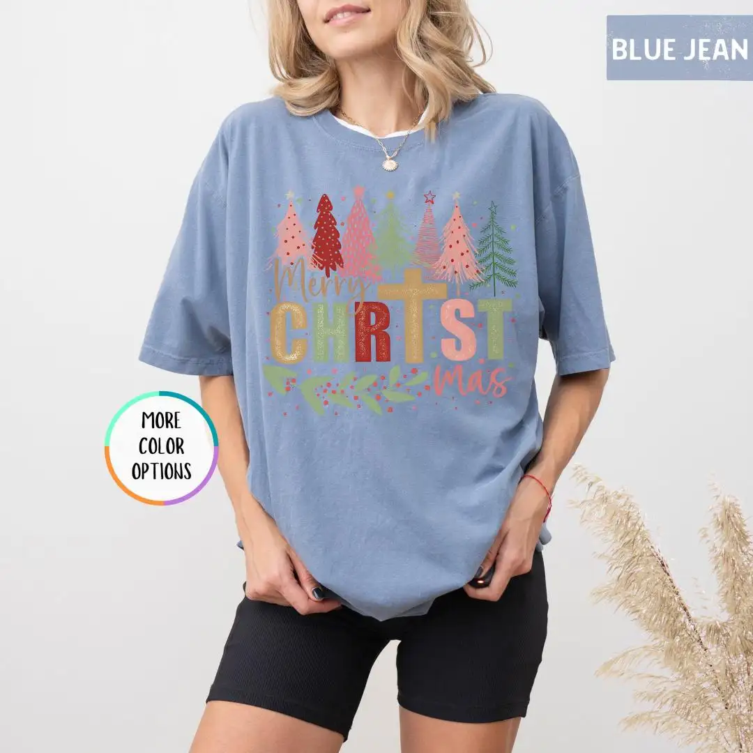 Comfort Colors Merry Christmas Tree Shirt, Holiday Religious Shirt For Women & Moms, Xmas Christian Graphic Tee, Jesus Birthday Gift