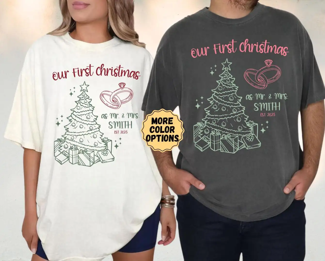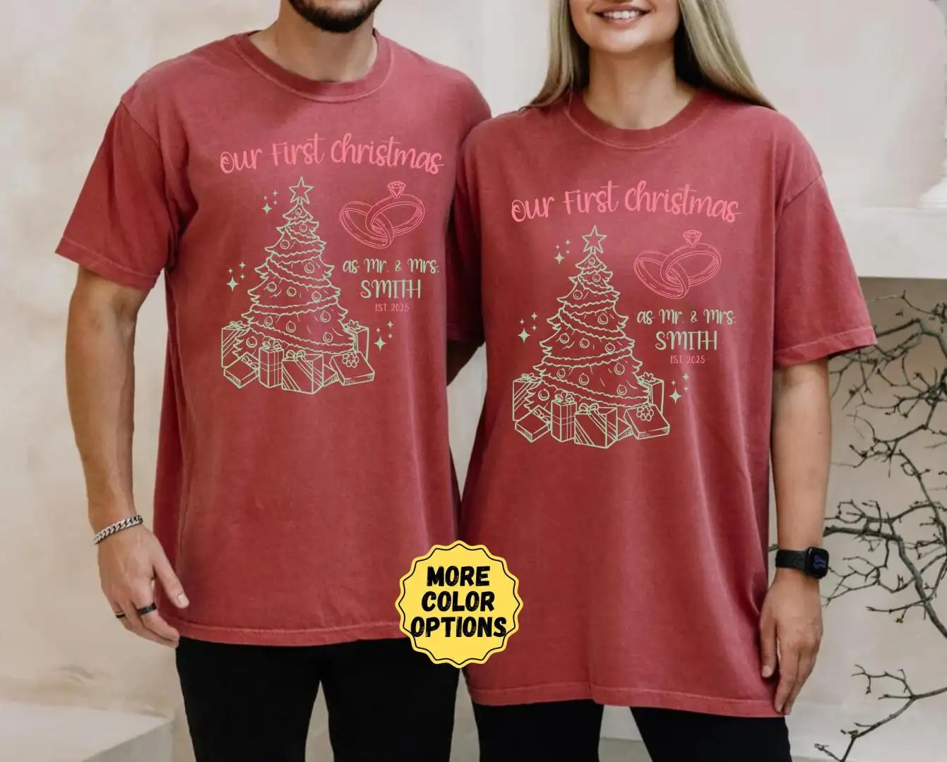 Comfort Colors® Our First Christmas Shirts, Husband and Wife Couple Matching Shirts, 1st Xmas as Mr Mrs Tee, Custom Christmas Newlywed Shirt