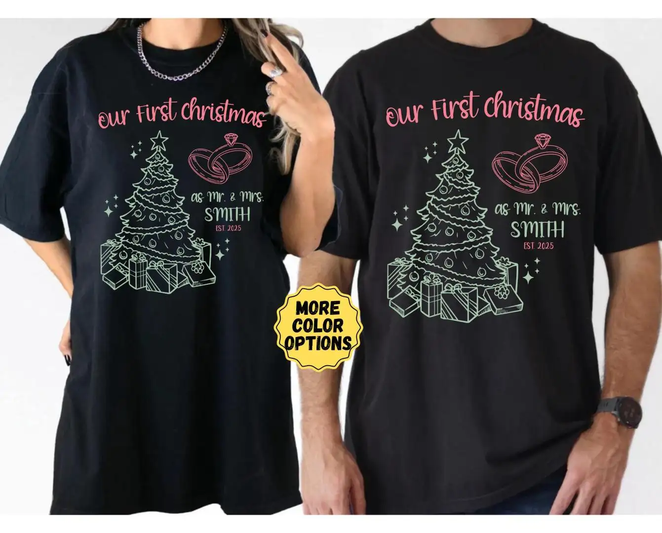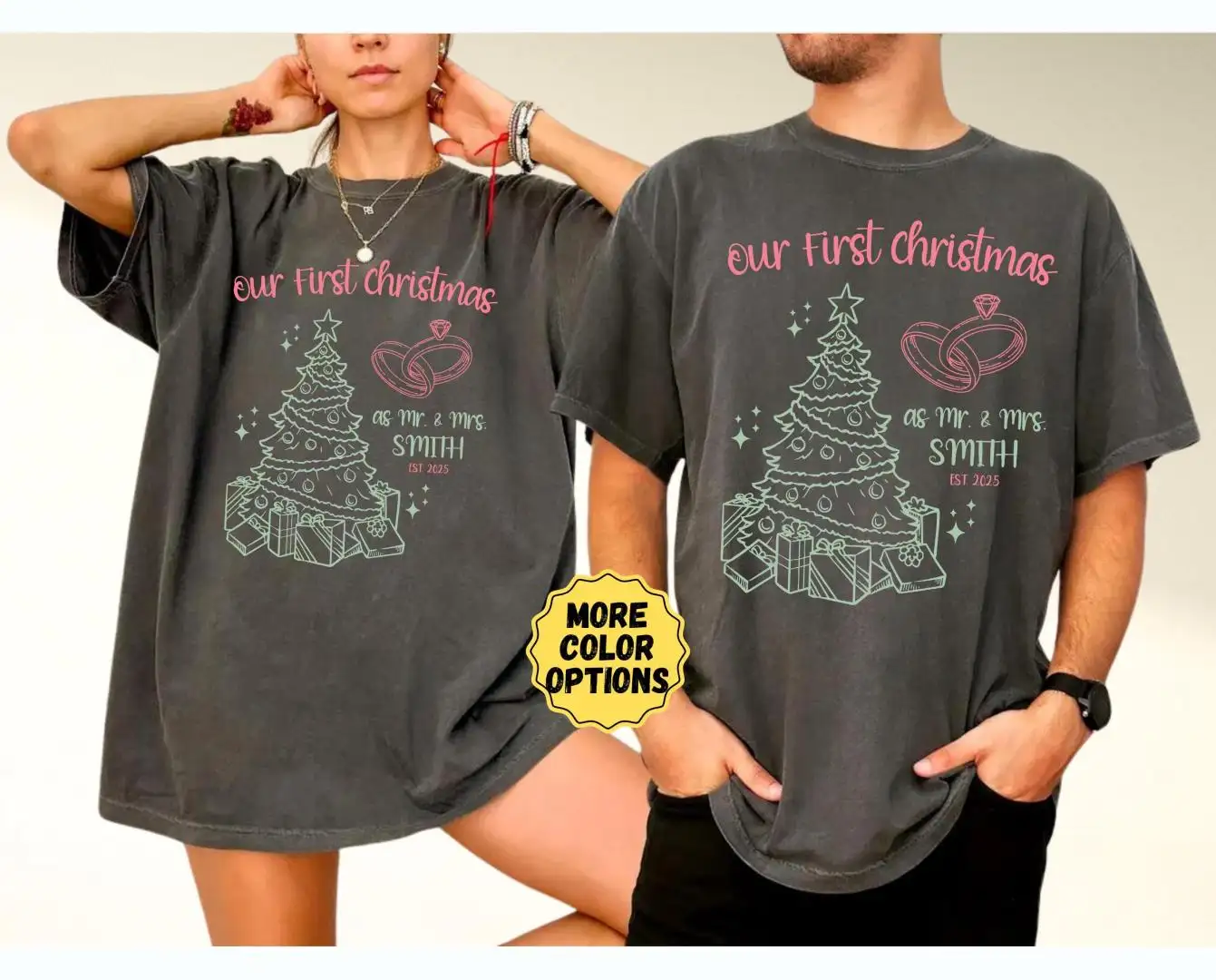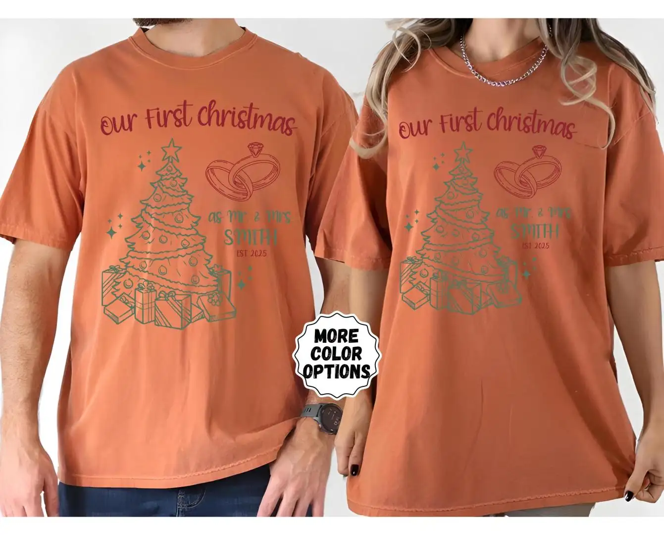 Review Comfort Colors® Our First Christmas Shirts, Husband and Wife Couple Matching Shirts, 1st Xmas as Mr Mrs Tee, Custom Christmas Newlywed Shirt