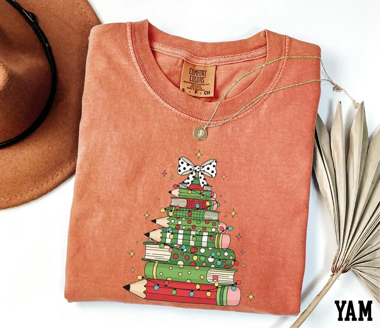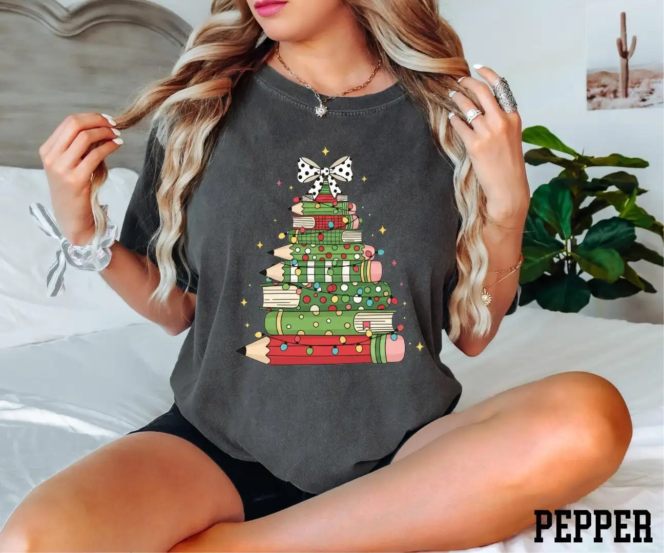 Comfort Colors® Pencil Christmas Tree Shirt, Christmas Gift for Teacher, Christmas Holiday Tee, Bookish Christmas Shirt, Teacher Life Shirt