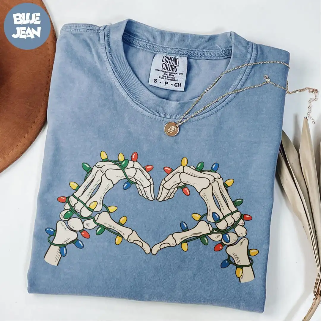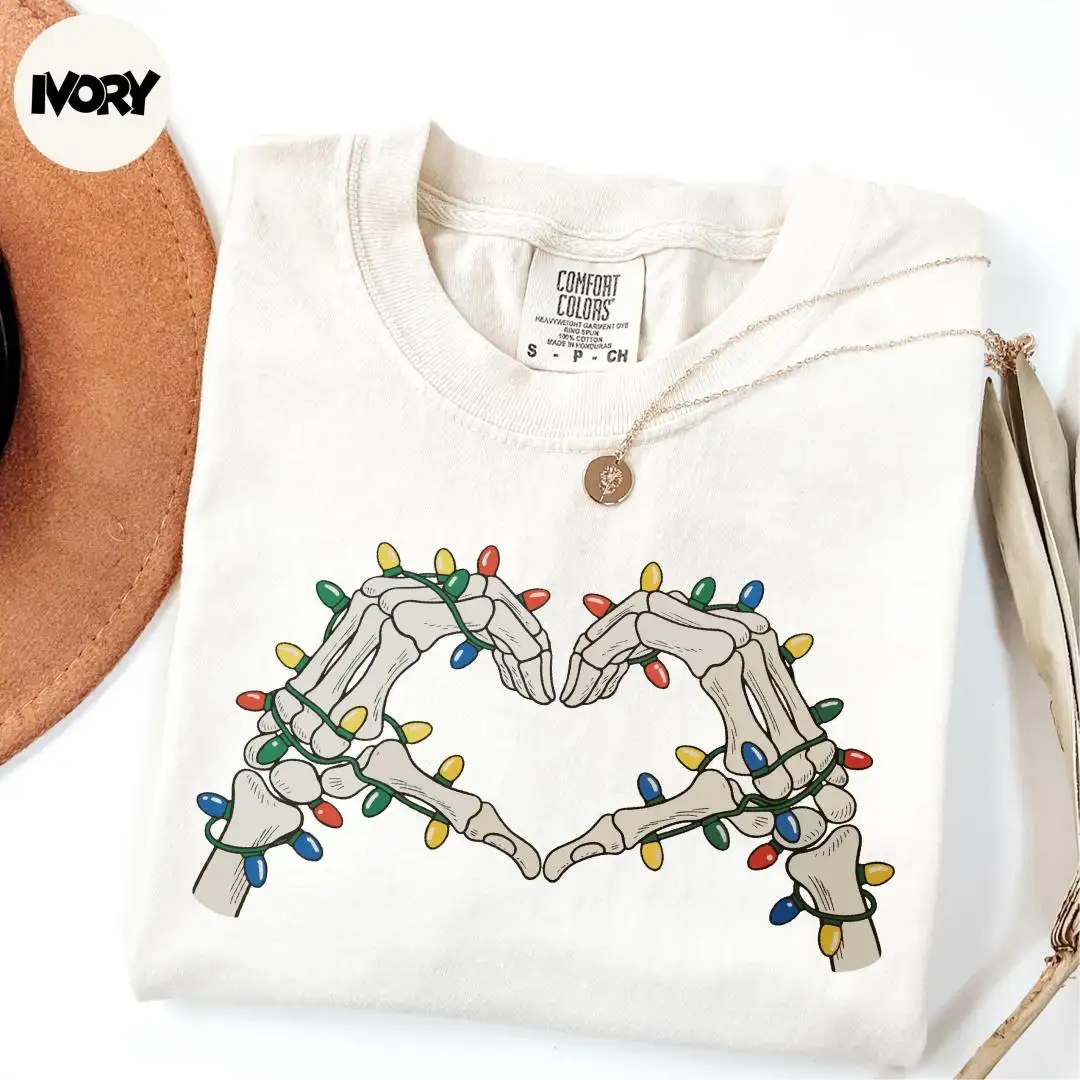 Comfort Colors® Skeleton Heart Hands Shirt, Christmas Lights Shirt, Christmas Party Shirt, Christmas Skeleton Shirt, Spooky Christmas Shirt