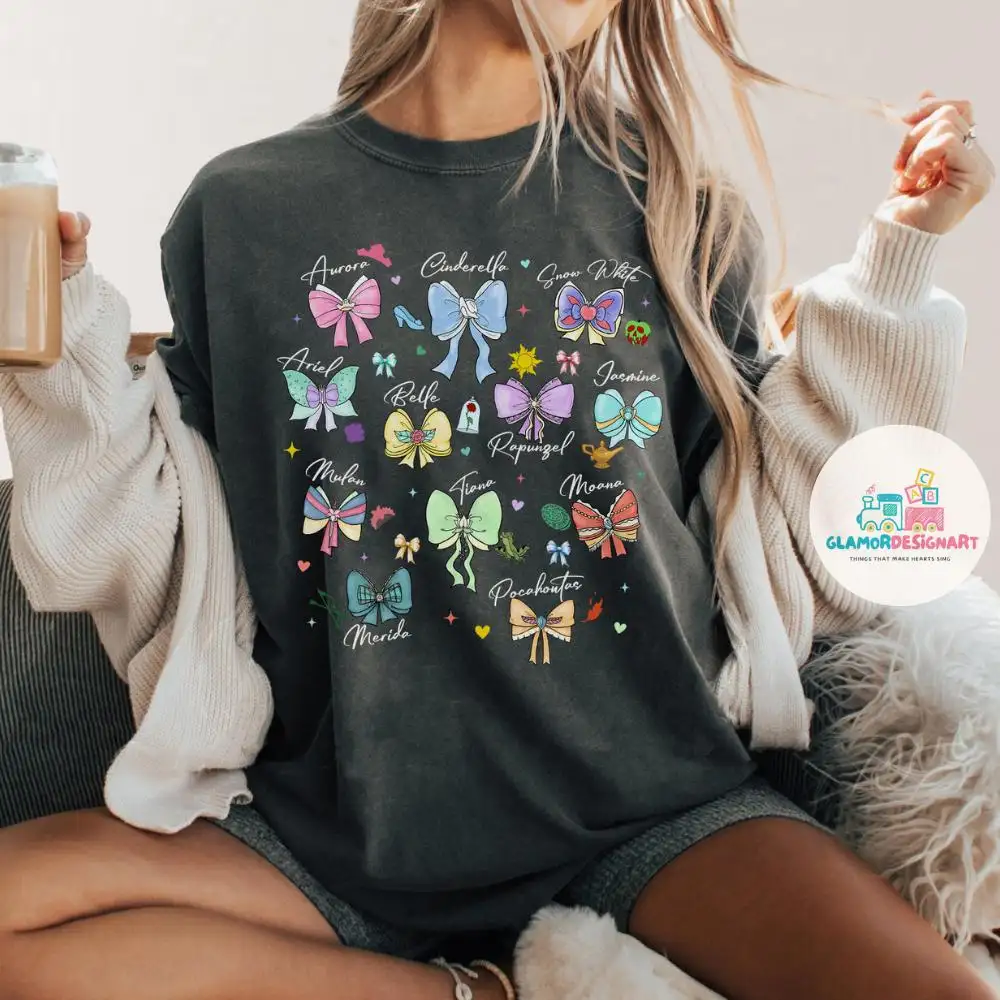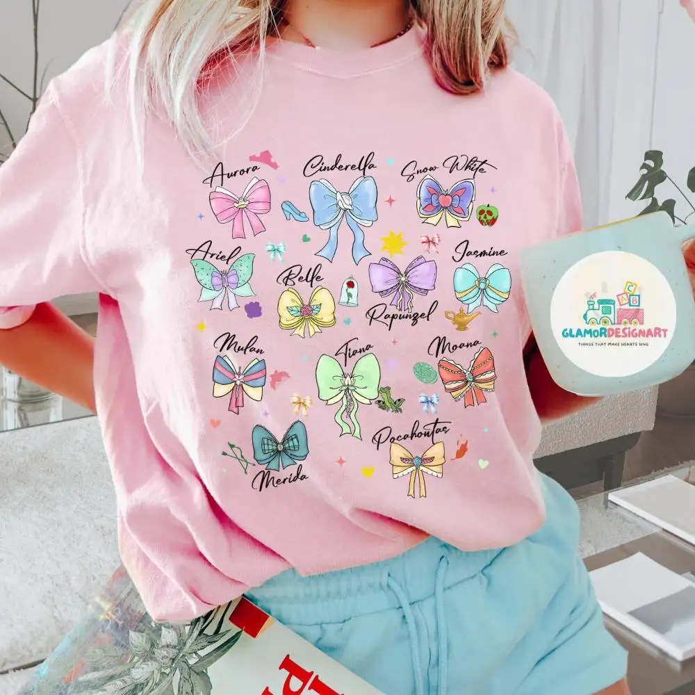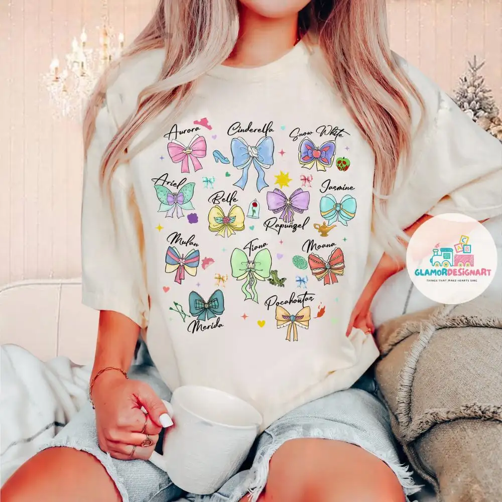 Coquette Bows Watercolor Disney Princess Shirt, Magic Kingdom Disneyland Girl Trip 2025, Disney Aurora Ariel Belle Cinderella Tiana Shirt