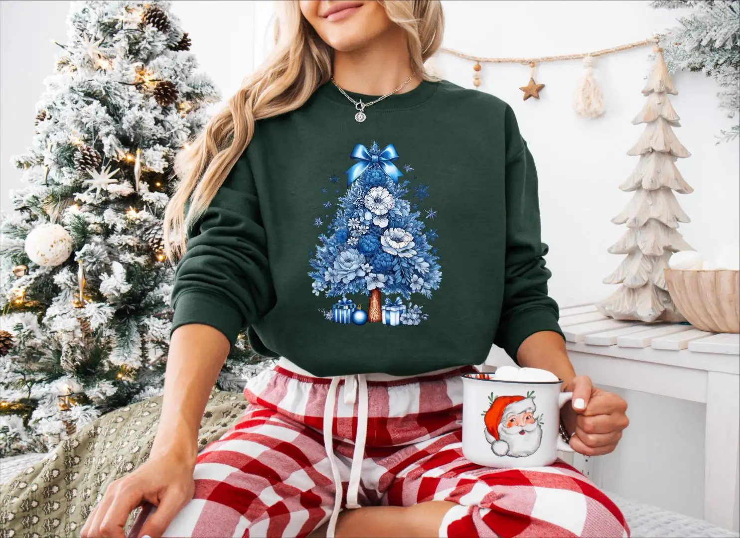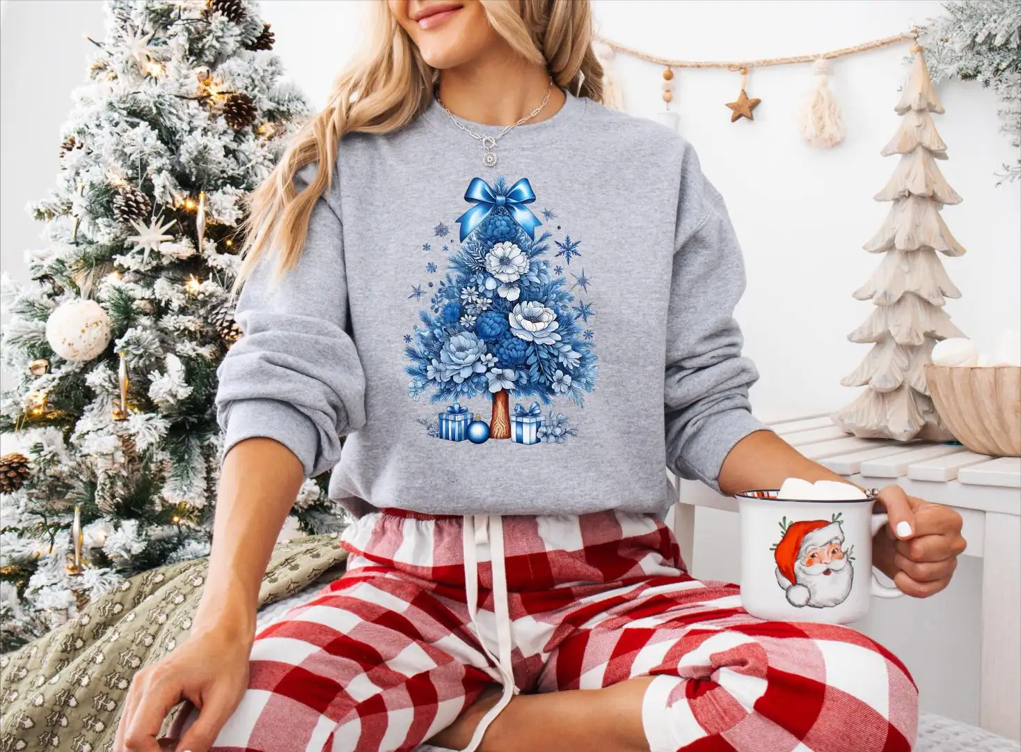 Coquette Christmas Tree Bow Shirt, Blue Christmas Tree With Flowers And Gift Tee, Merry Christmas Sweatshirt, Holiday Party Sweater