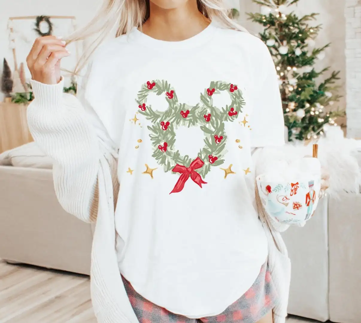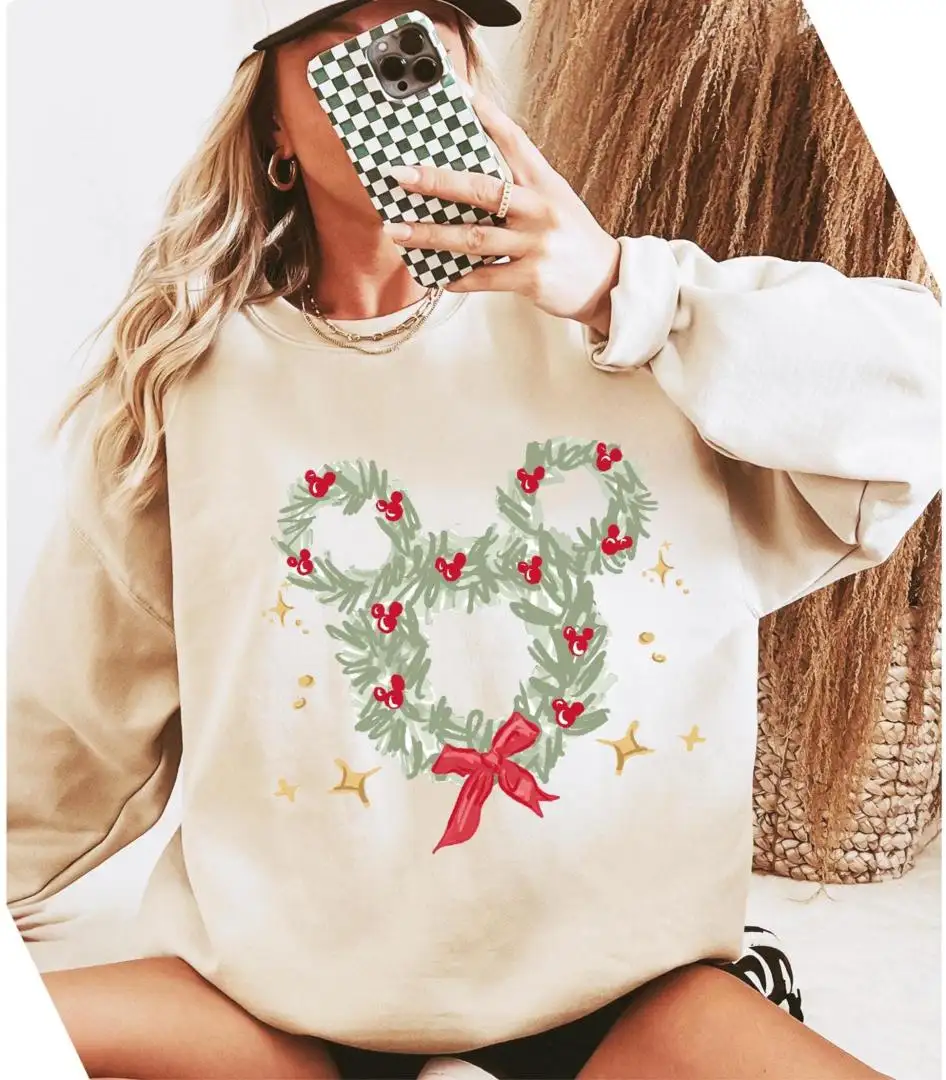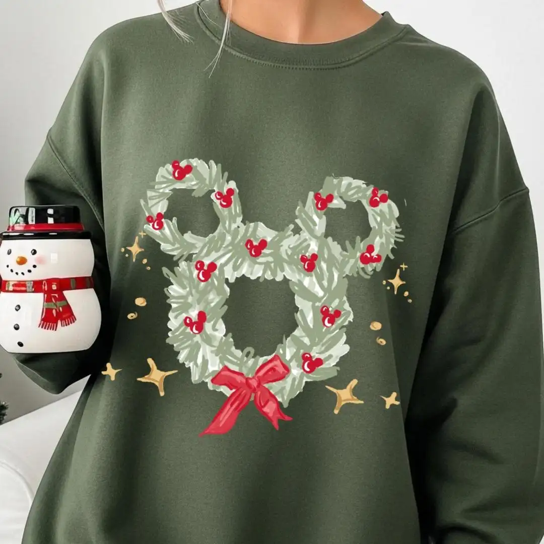 Disney Christmas Wreath Sweatshirt Coquette Bow Christmas Mouse Ear Shirt Disneyland Mickey Xmas Tee Holiday 2025 Party Gift