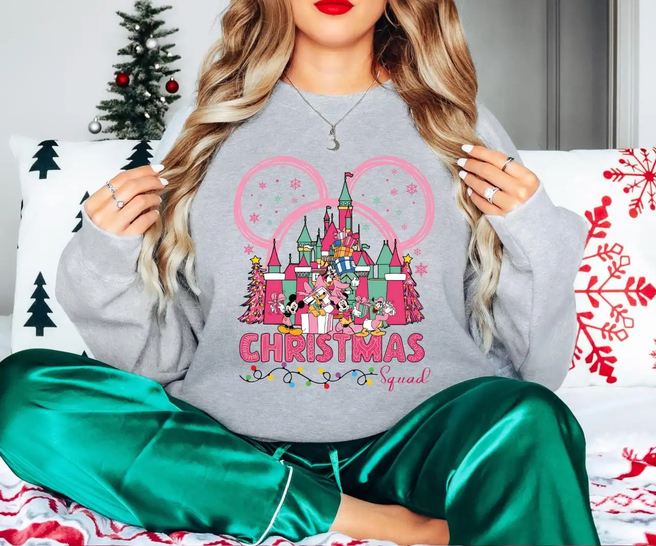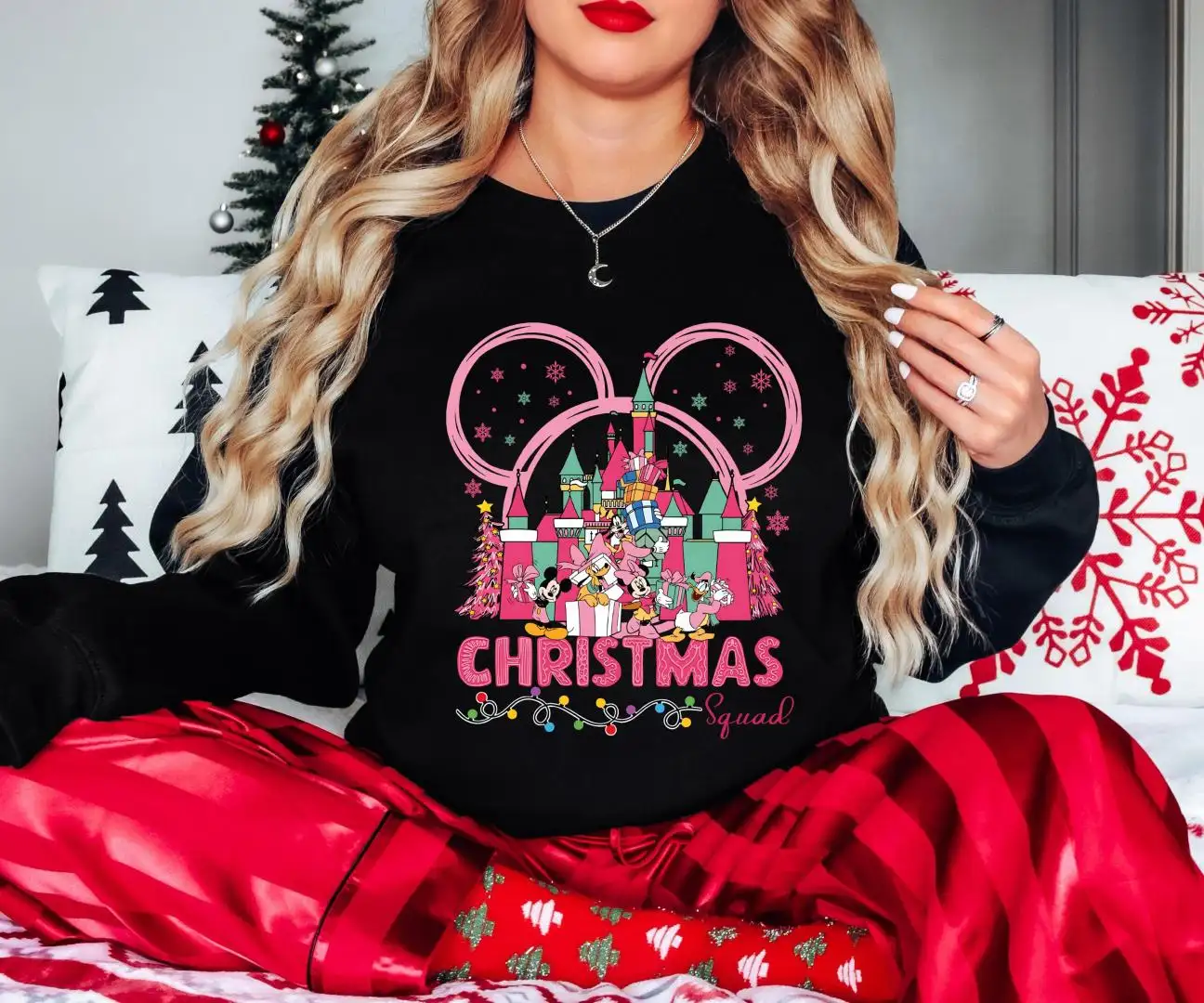 Review Disney Pink Christmas Squad Shirt, Mickey's Very Merry Christmas Party, Mickey And Friends Xmas Sweatshirt, Disneyland Magic Castle Trip