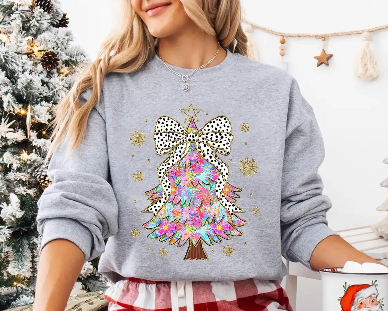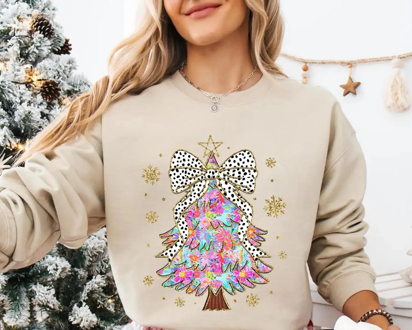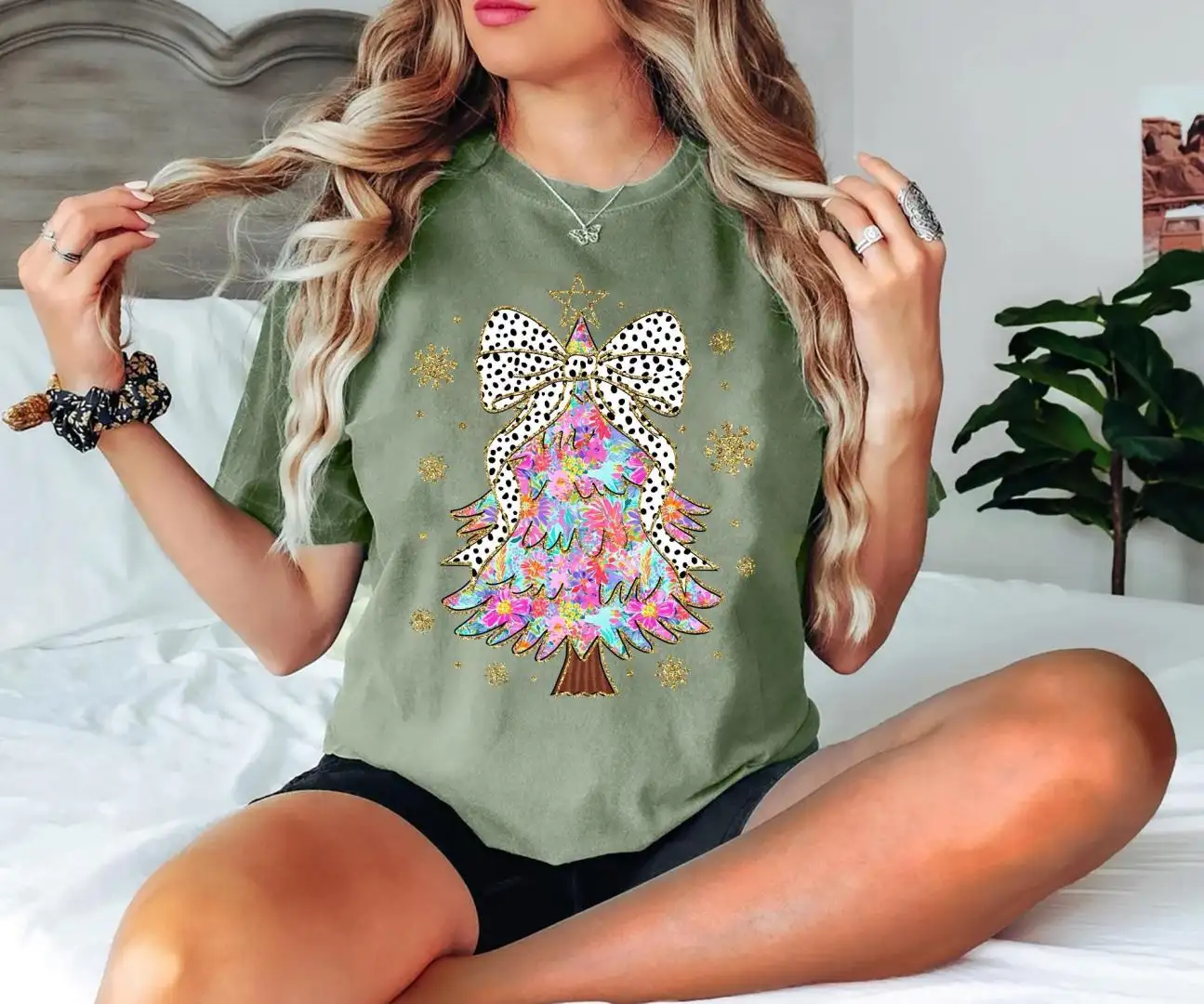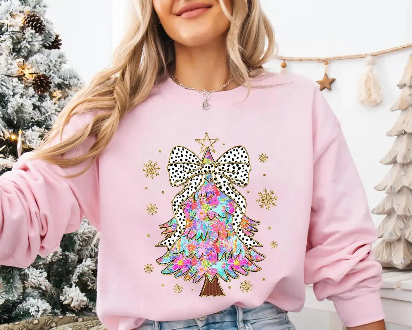 Glitter Floral Christmas Tree Shirt Gift for Women