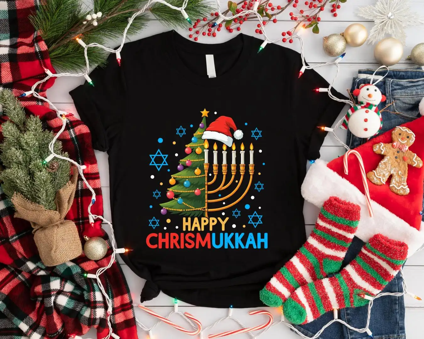 Happy Chrismukkah Shirt, Hanukkah Menorah Candle Shirt, Jewish Holiday Christmas Shirt, Chanukah Family Party Tee, Religious Hanukkah Shirt