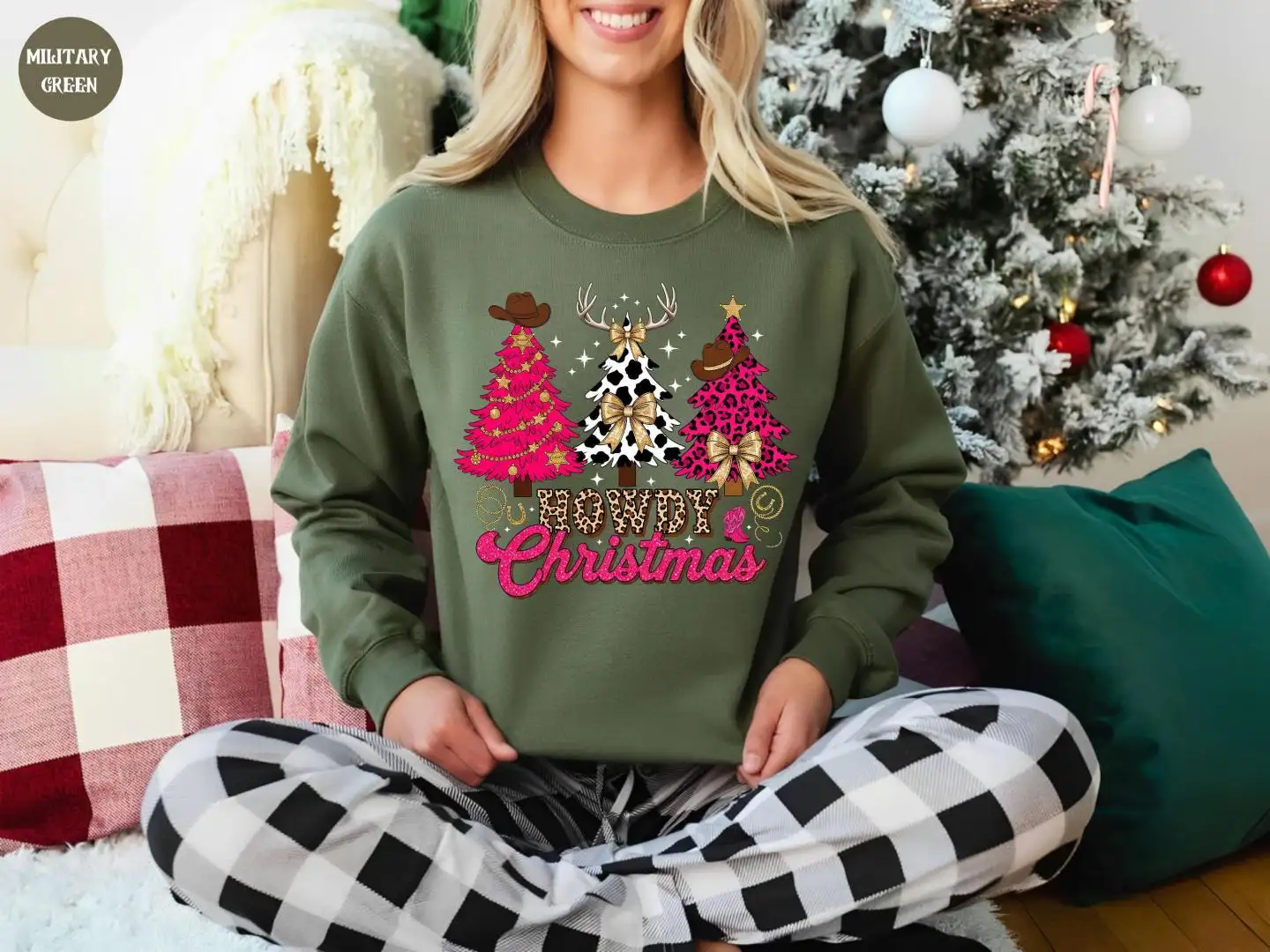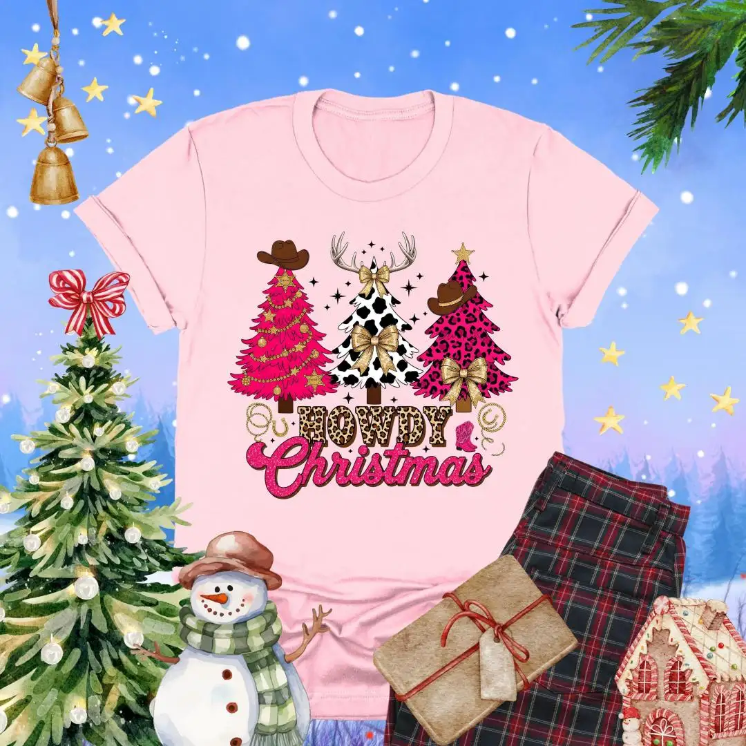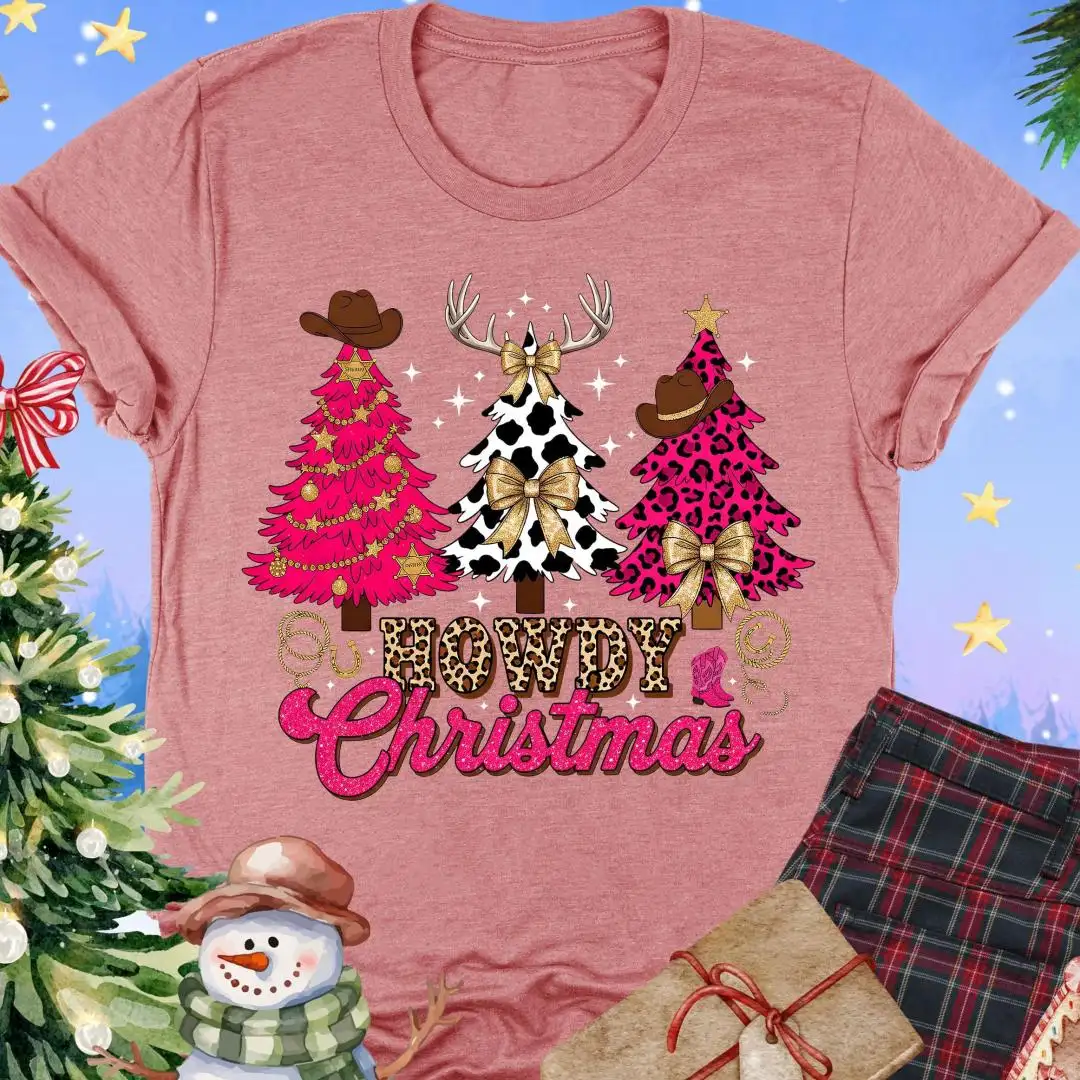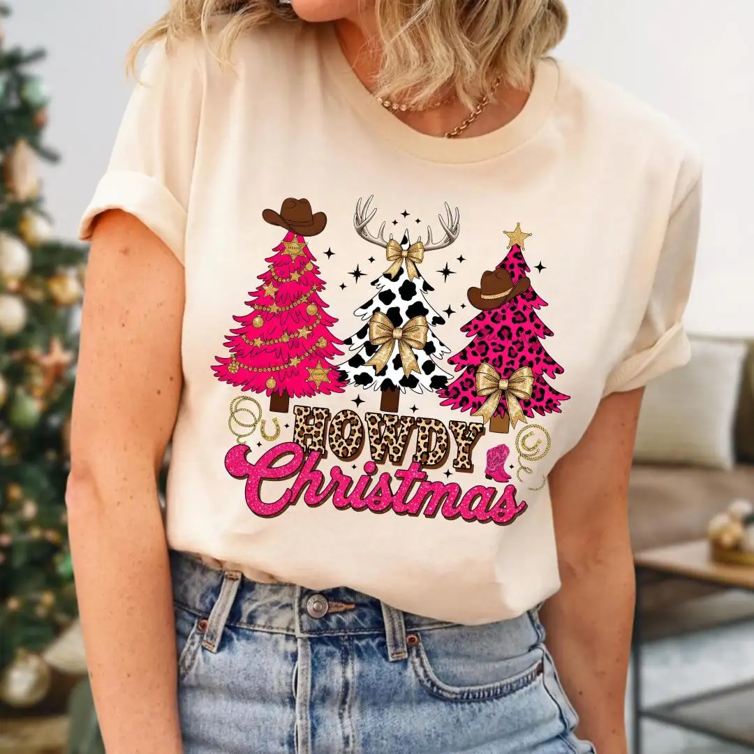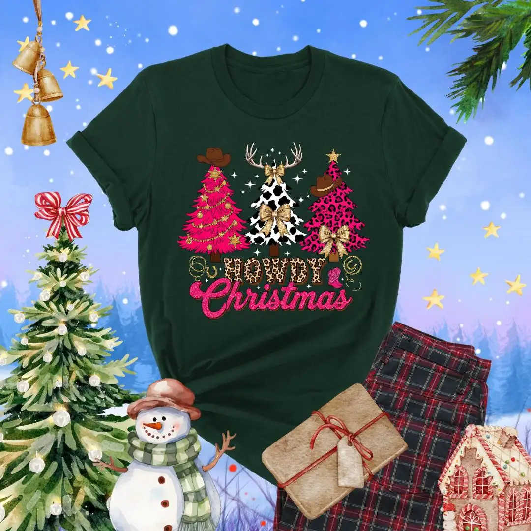 Howdy Christmas Shirt, Cute Cow Print Tree Top, Western Cowboy Holiday Tee, Southern Rodeo Christmas Outfit, Country Girl Xmas T-Shirt