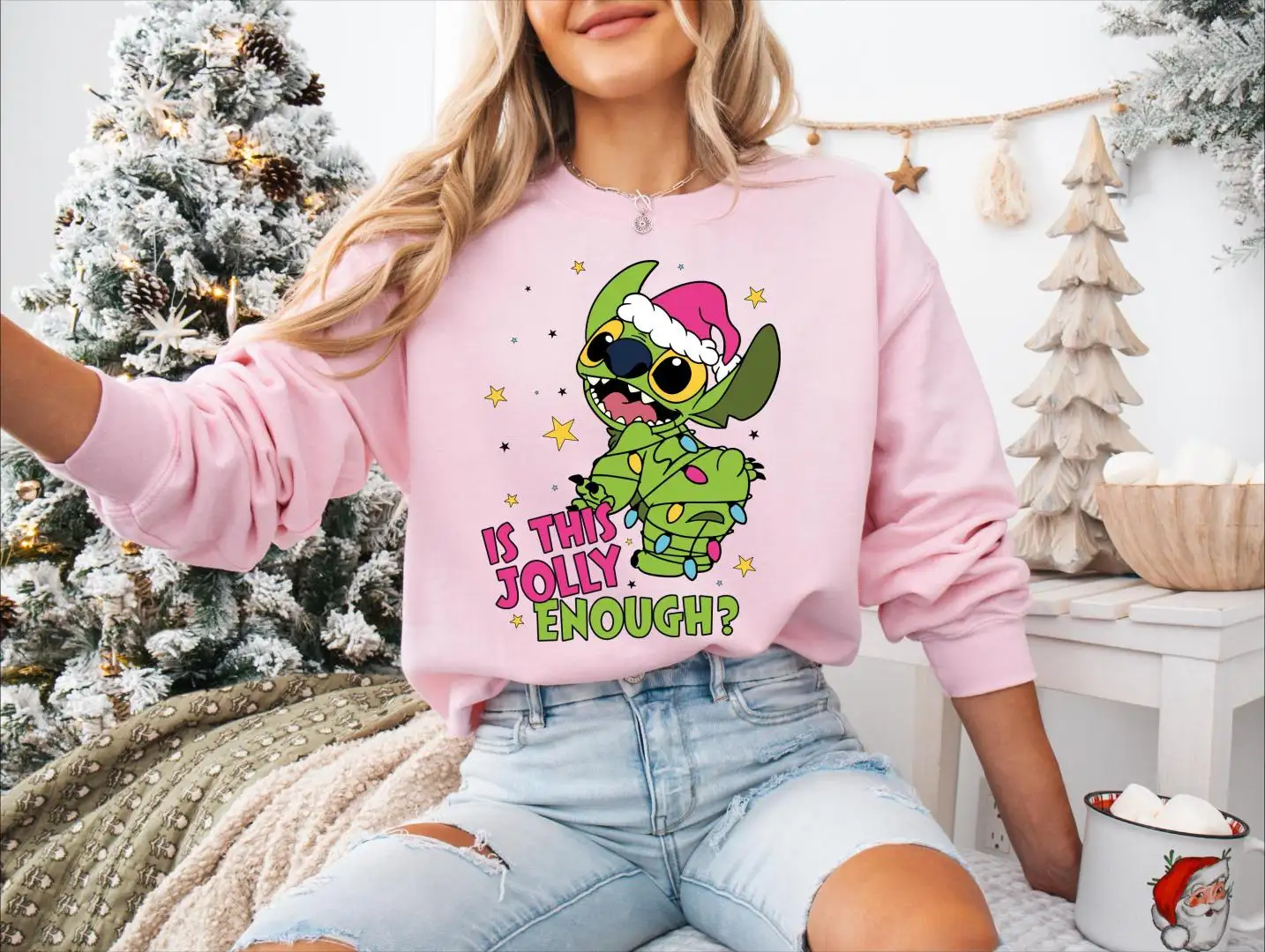 Is This Jolly Enough Stitch Christmas Shirt, Christmas Lights Jolly Stitch, Disney Stitch Christmas Sweatshirt, Funny Green Stitch Sweater