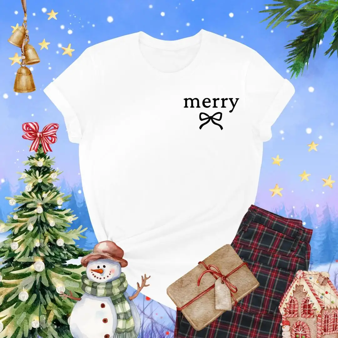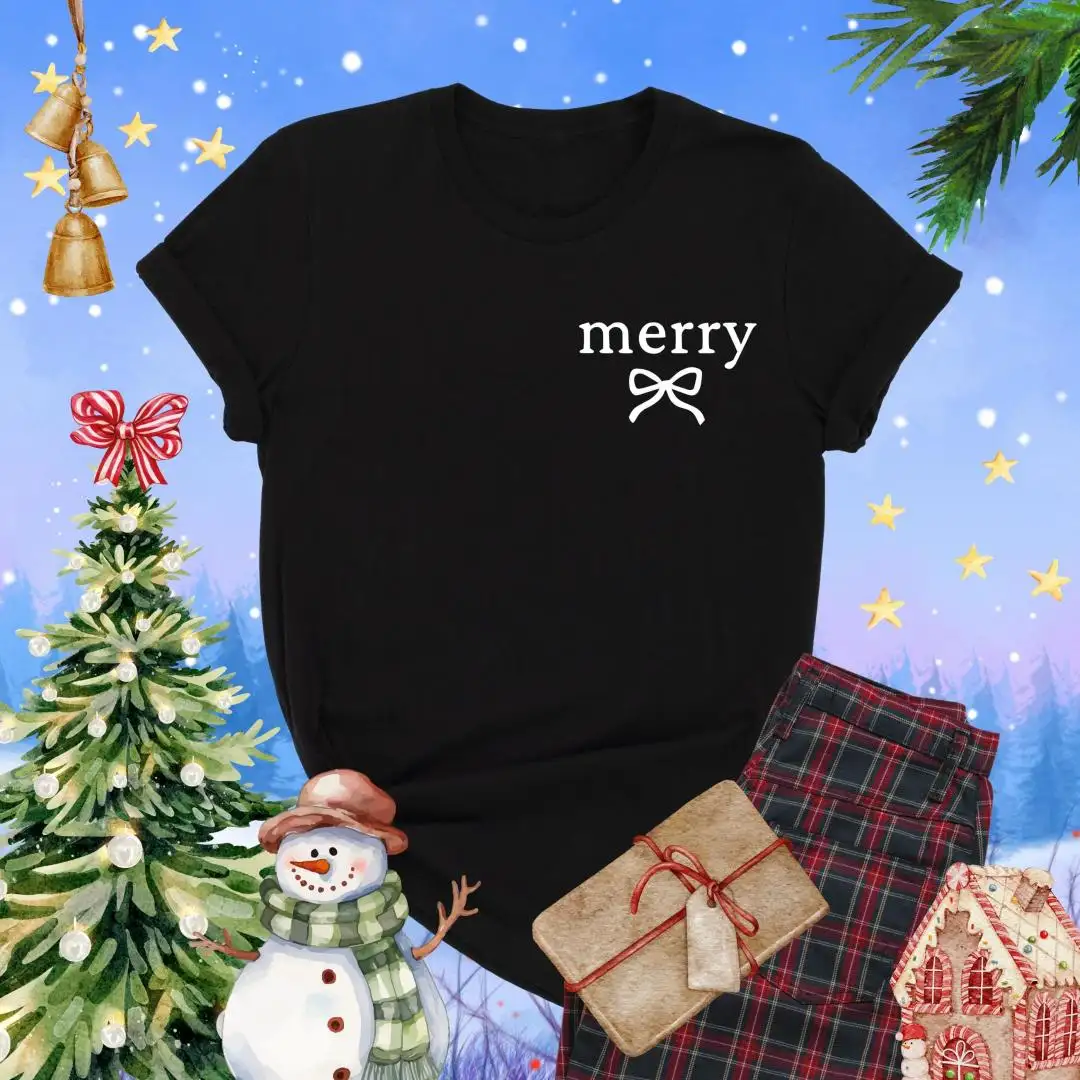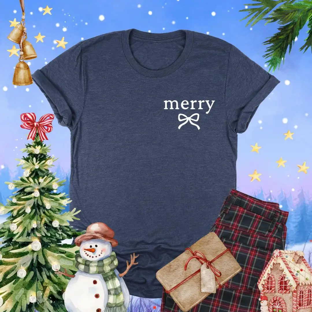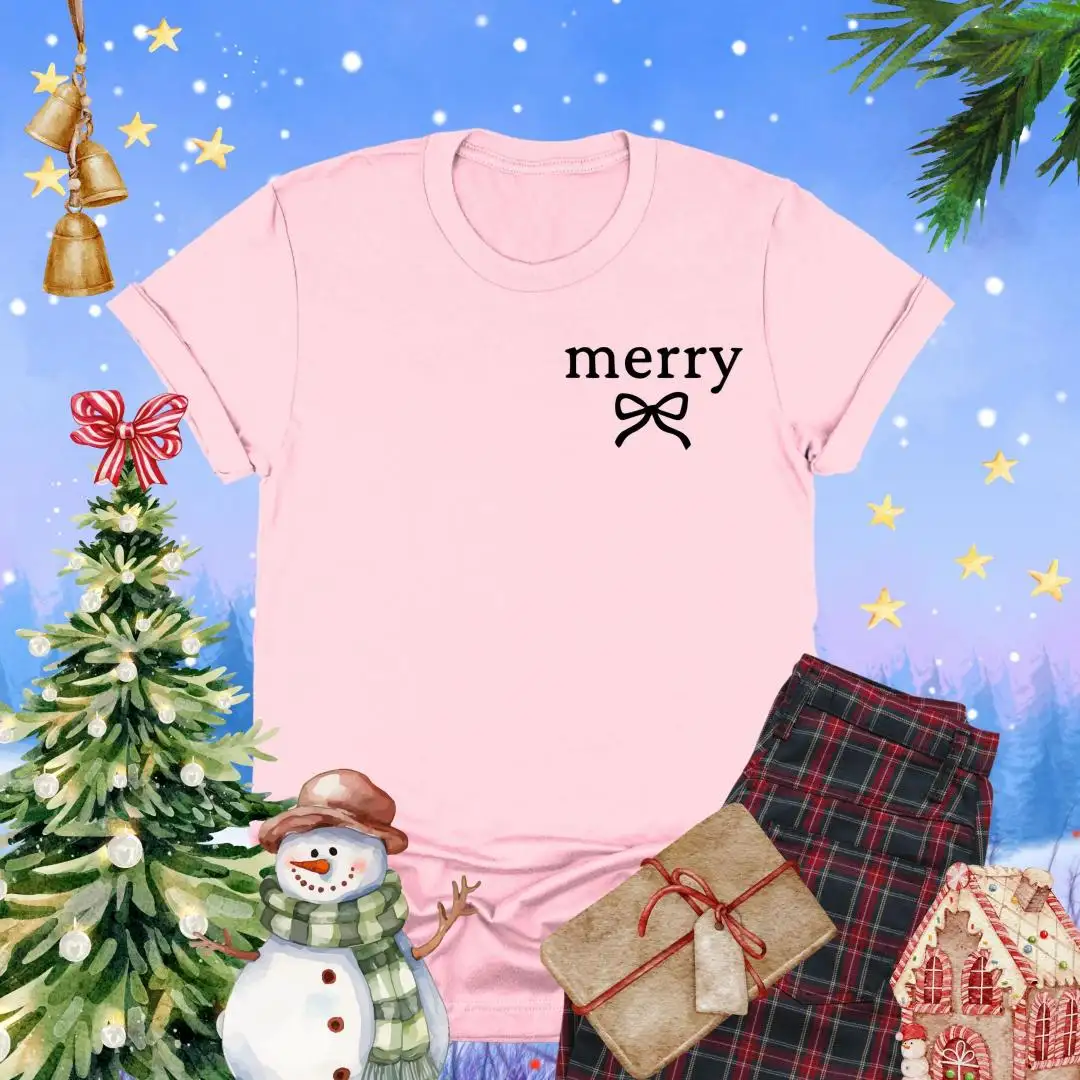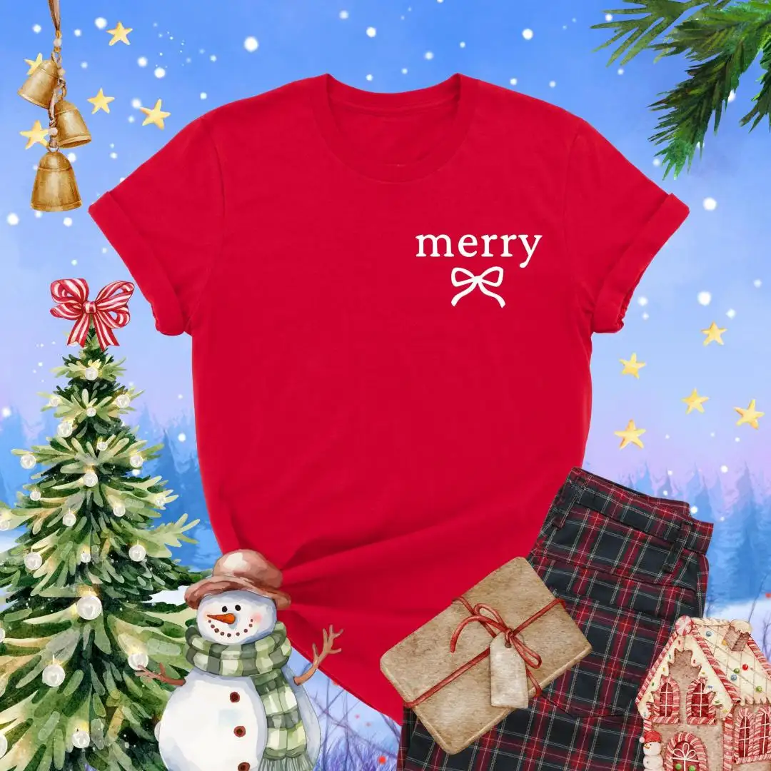 Merry Christmas Bow Shirt, Xmas Party Gift, Cozy Girl’s Winter Graphic Shirt, Christmas Aesthetic Tee, Minimalist Holiday Shirt For Women