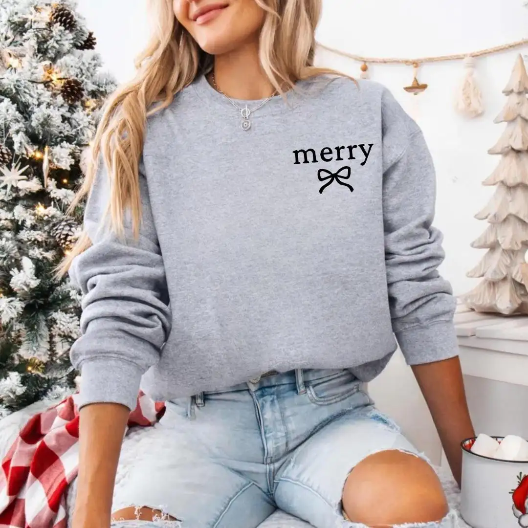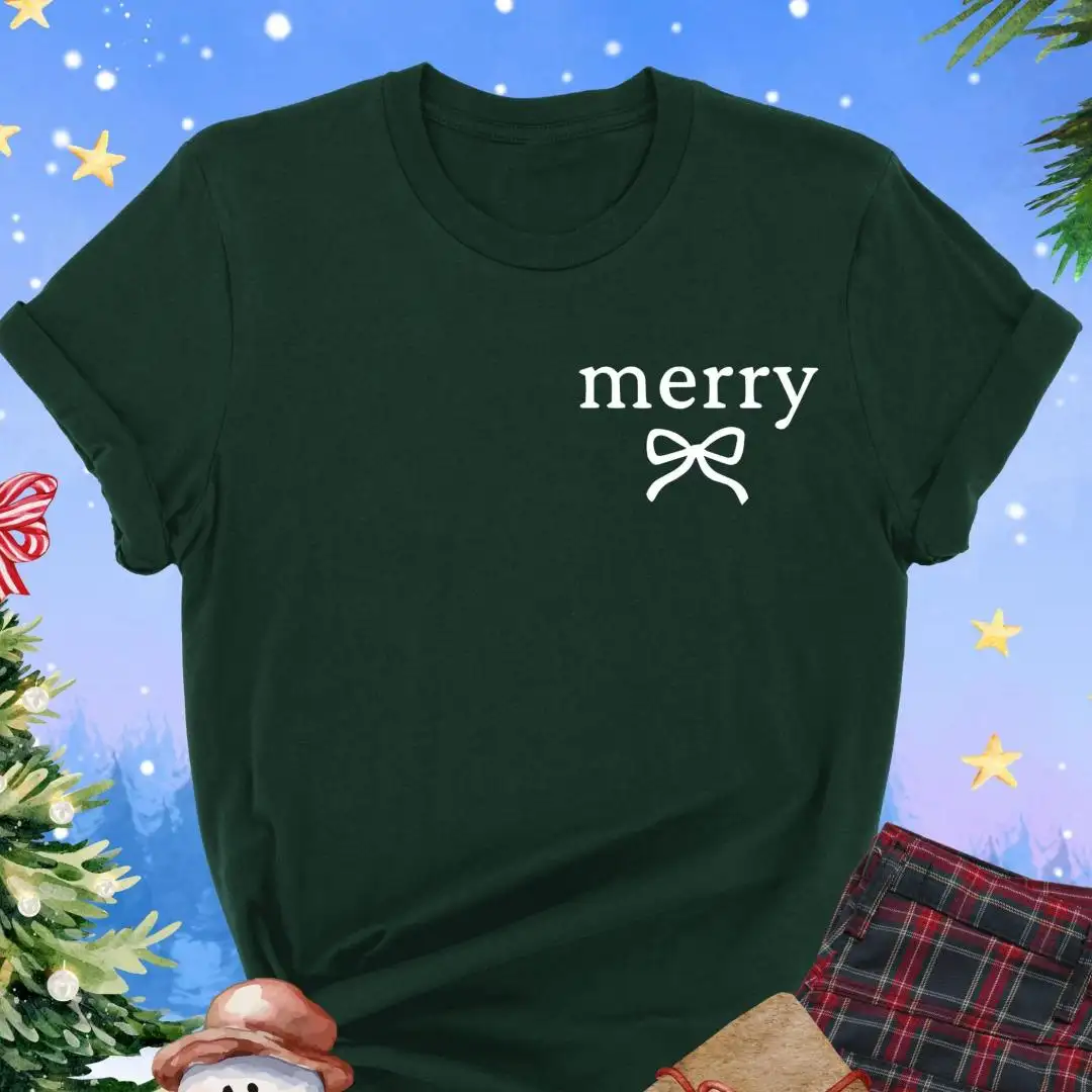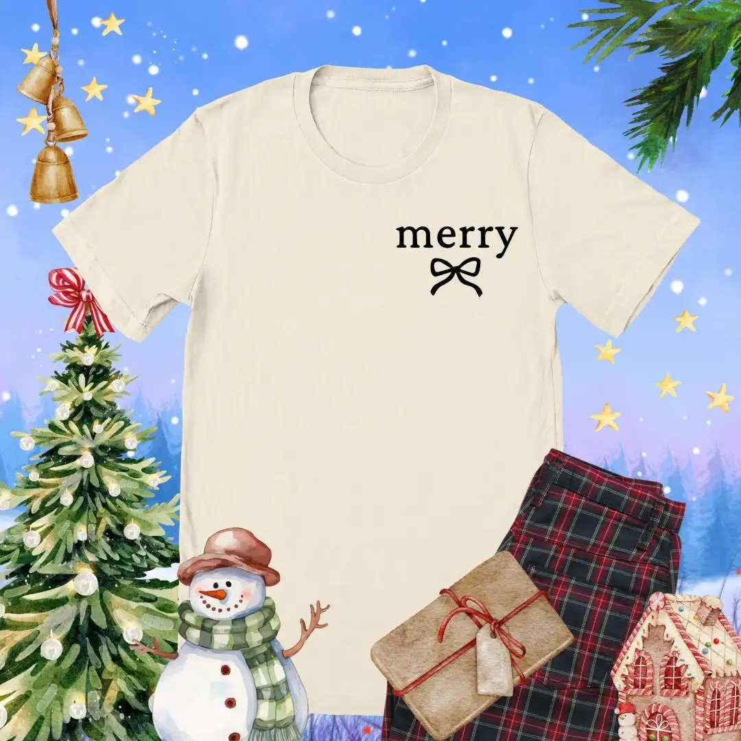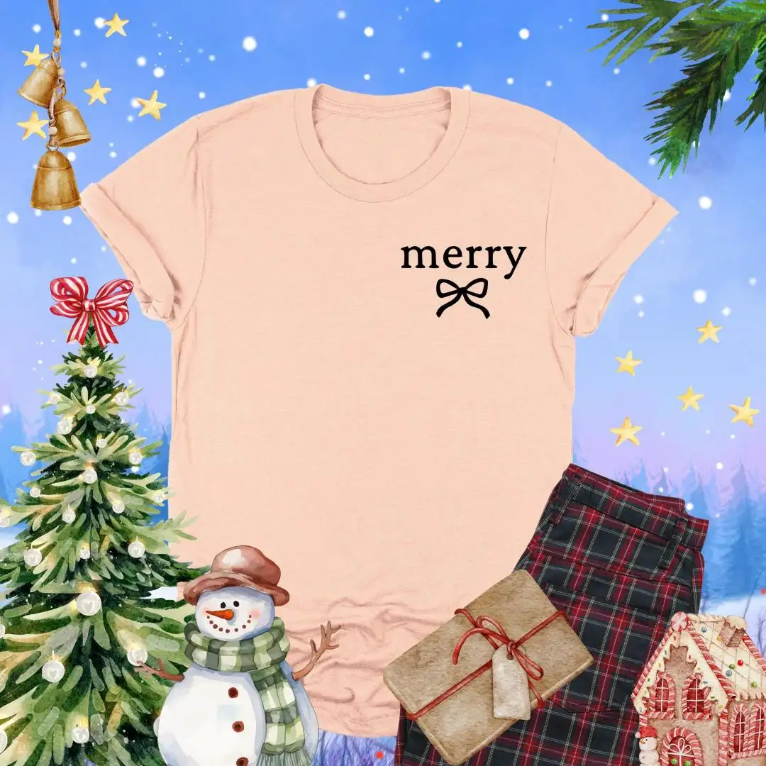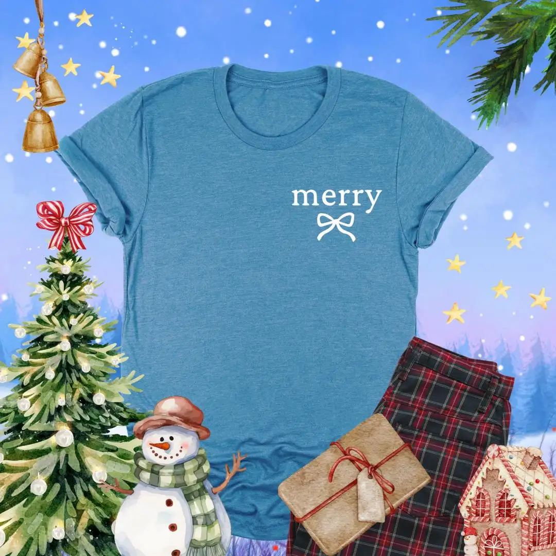 Merry Christmas Bow Shirt, Xmas Party Gift, Cozy Girl’s Winter Graphic Shirt, Christmas Aesthetic Tee, Minimalist Holiday Shirt For Women