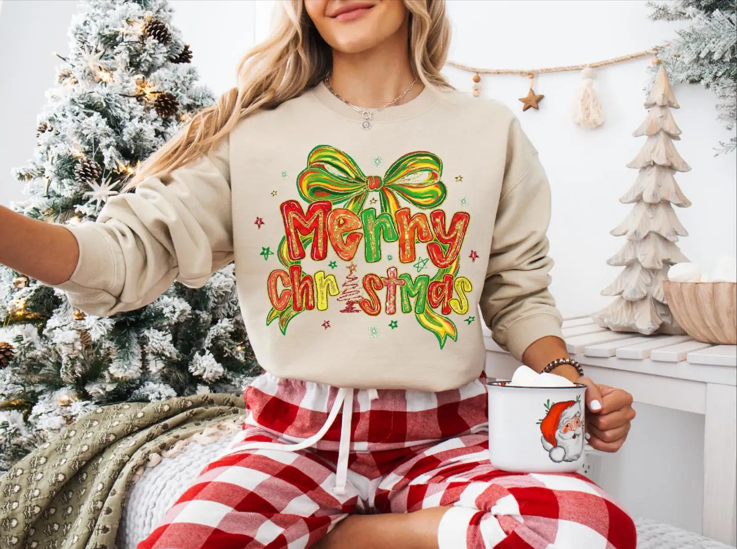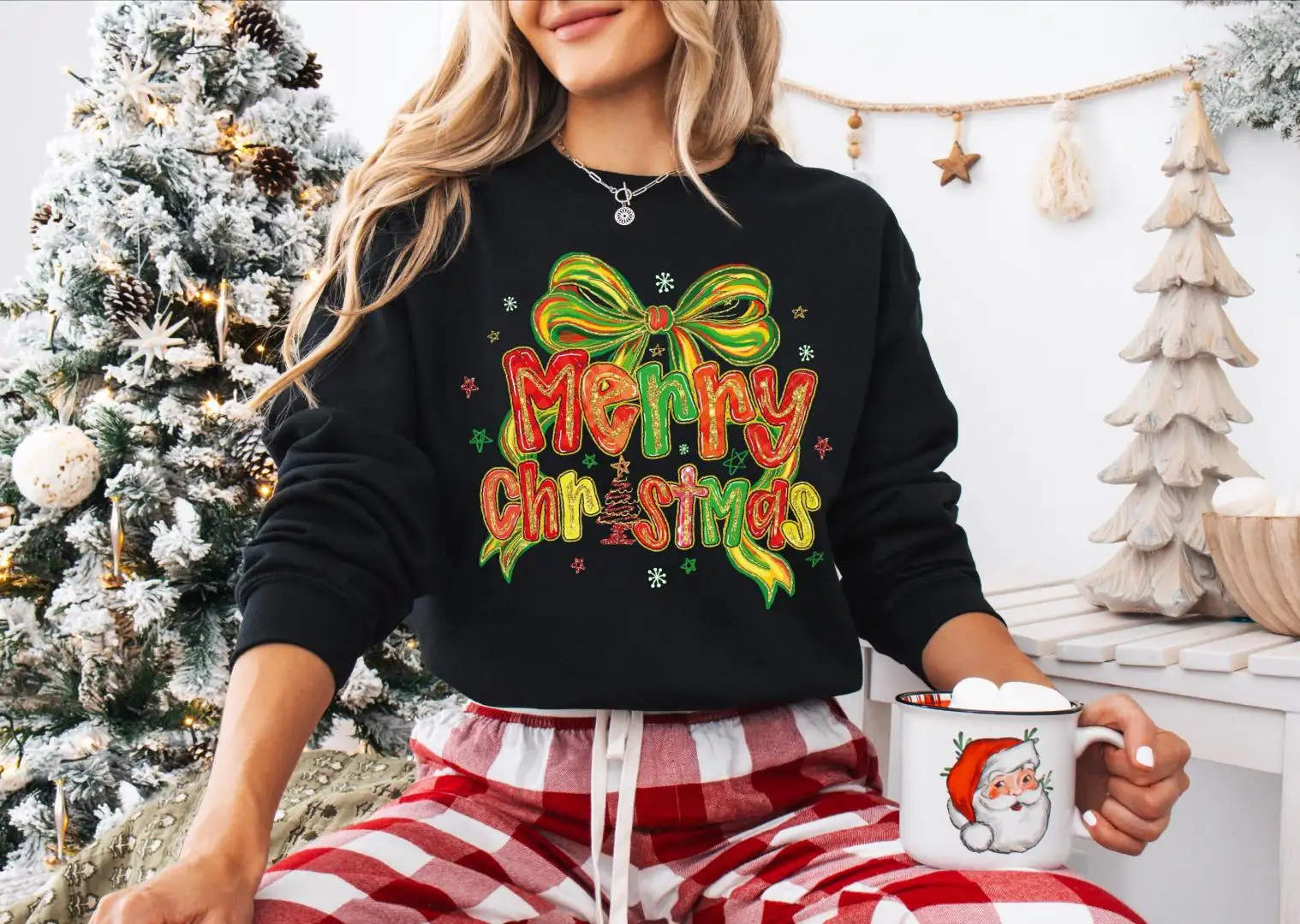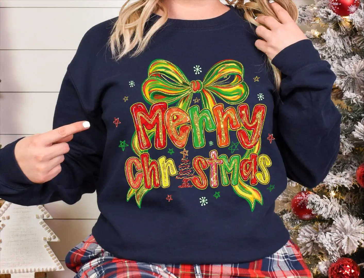 Merry Christmas Bow Tree Shirt, Shiny Christmas Tree and Bow Sweatshirt, Christmas Coquette Bow Sweater, Merry Christmas Shirt