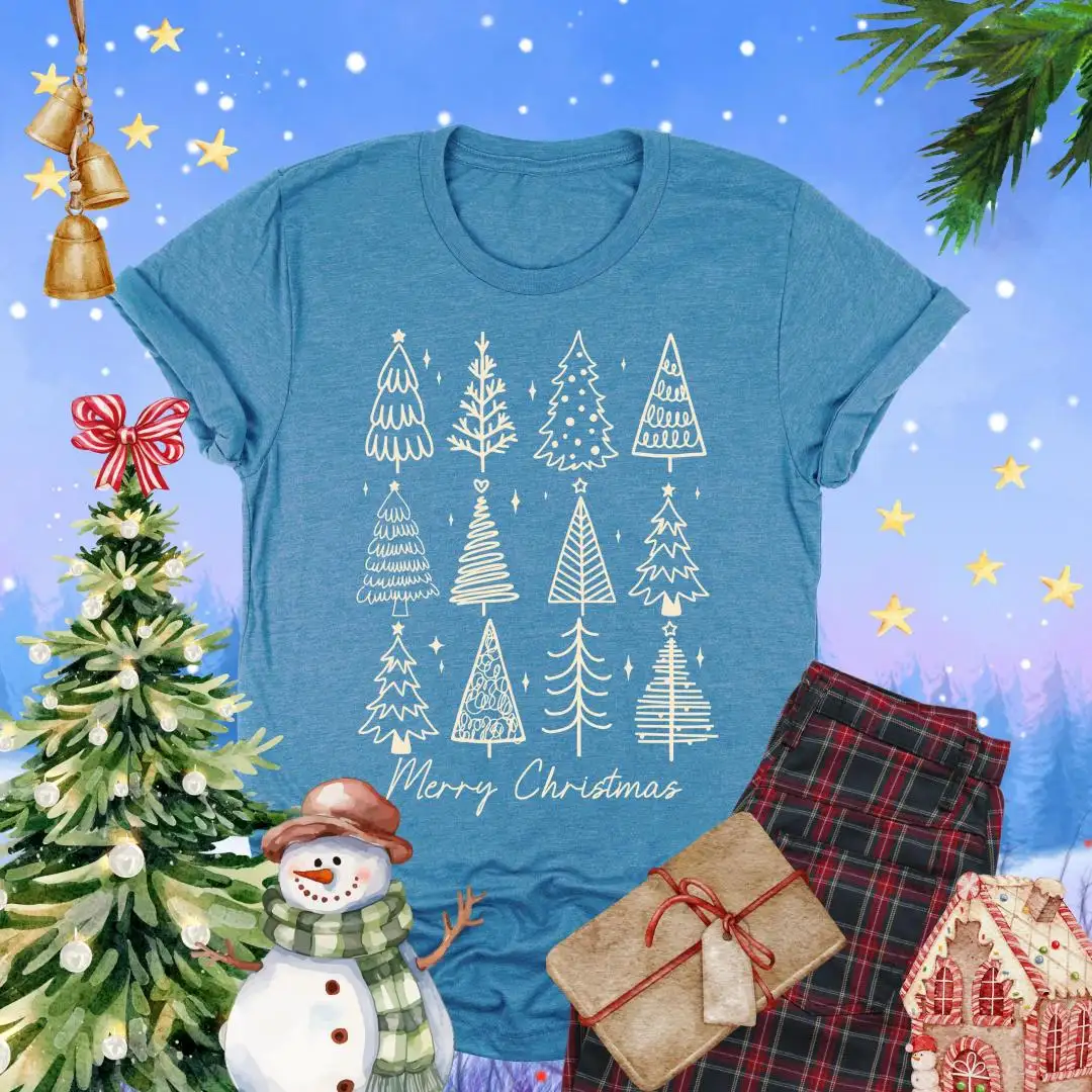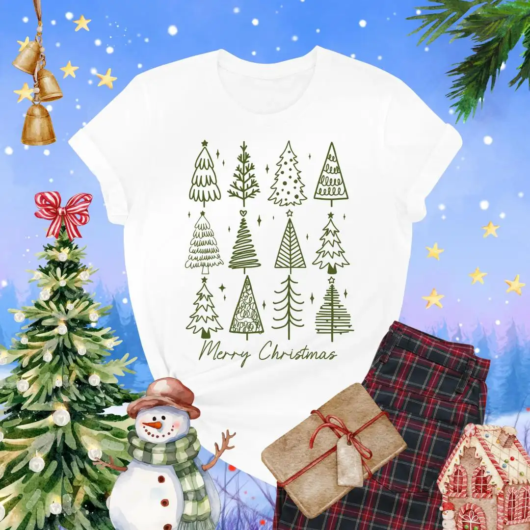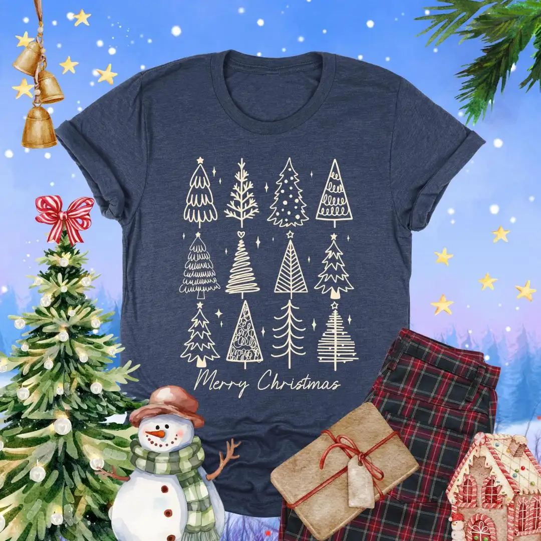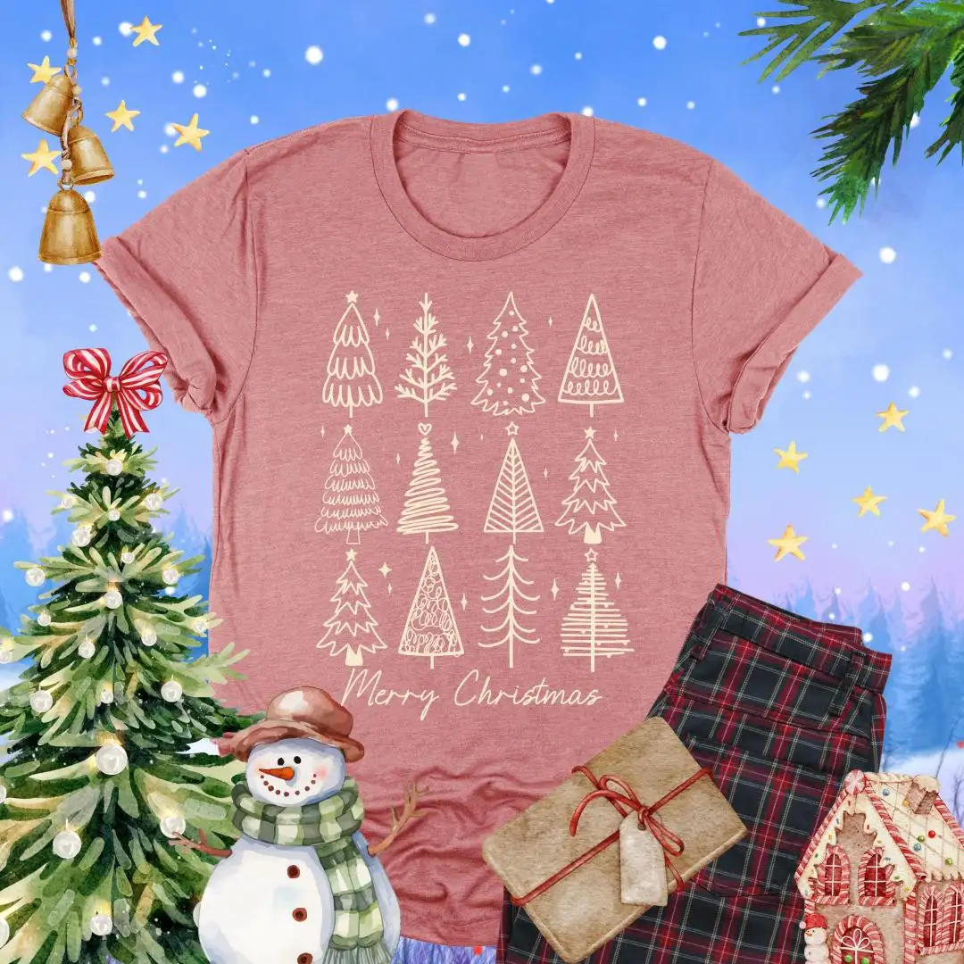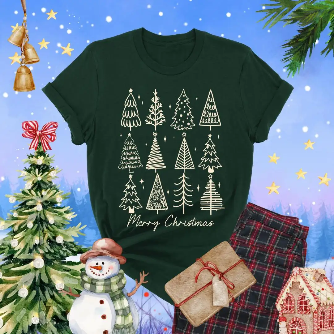 Review Merry Christmas Shirt, Holiday Gift For Women, Christmas Vacation Shirt, Minimalist Xmas Shirt, Winter Season, Christmas Pine Trees Shirt