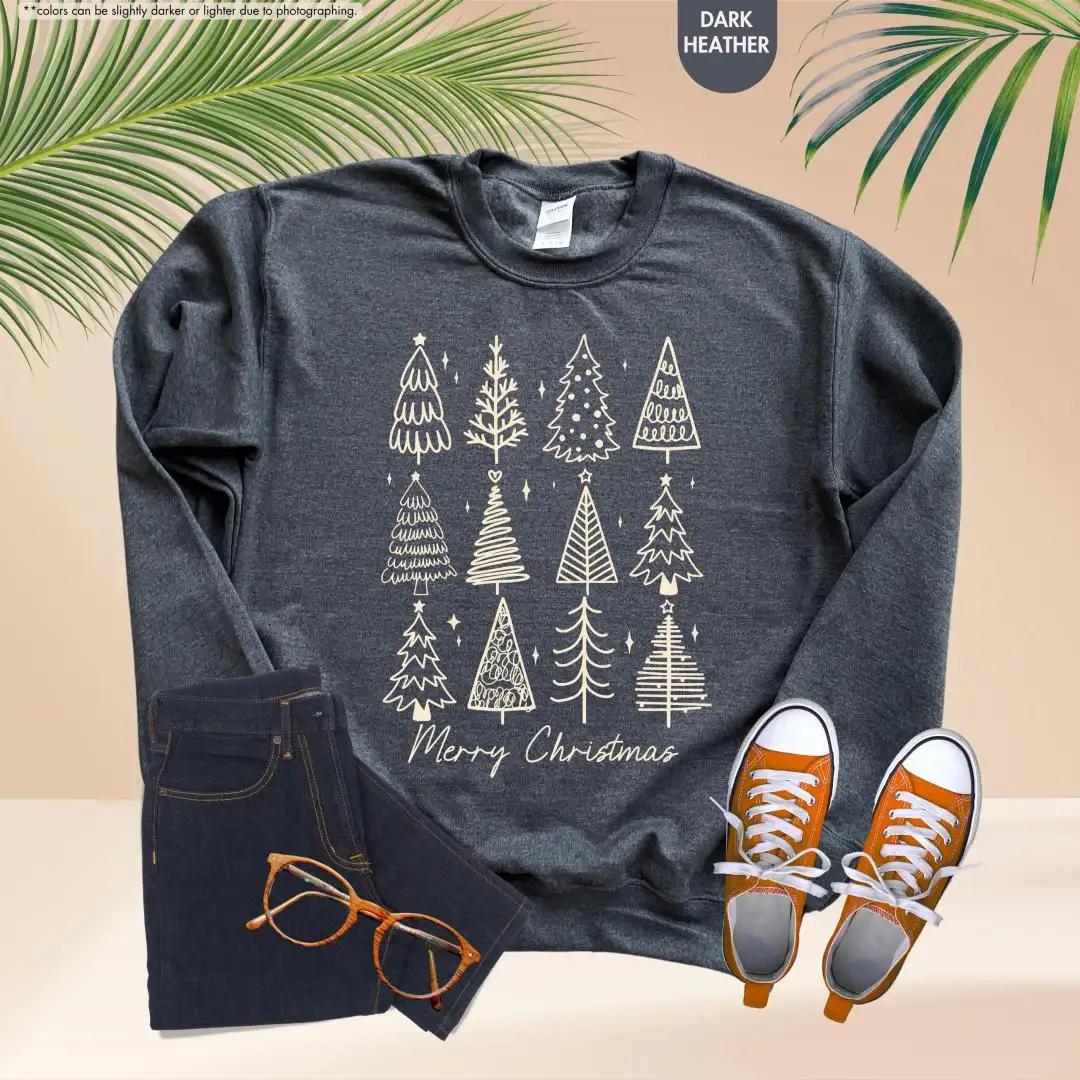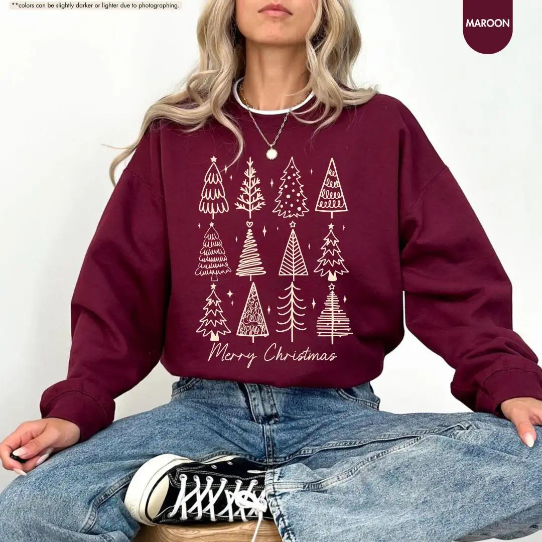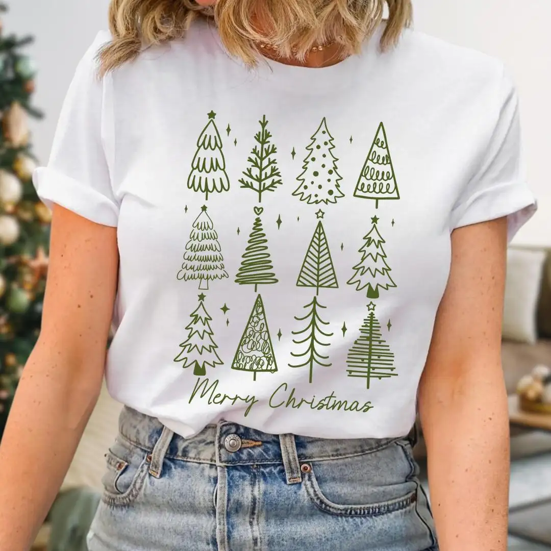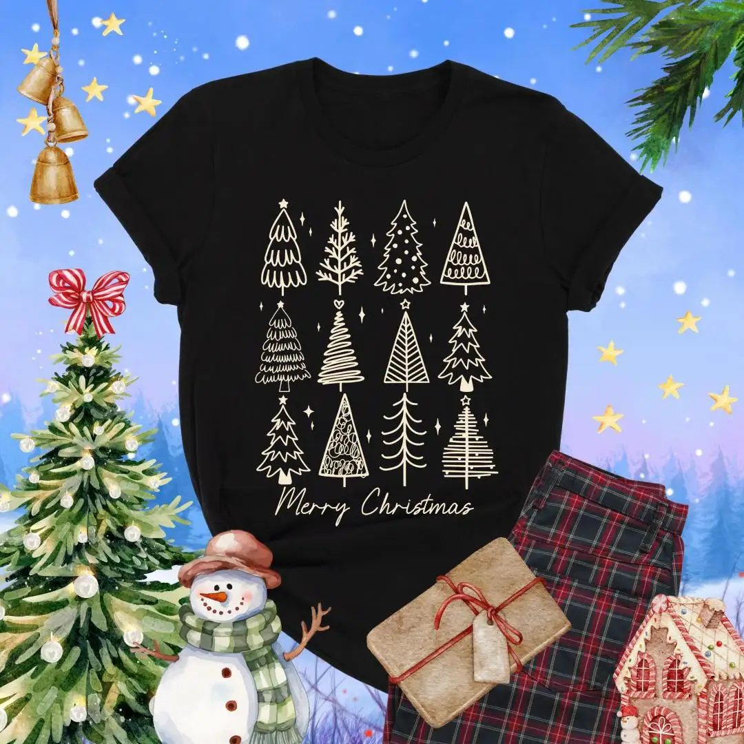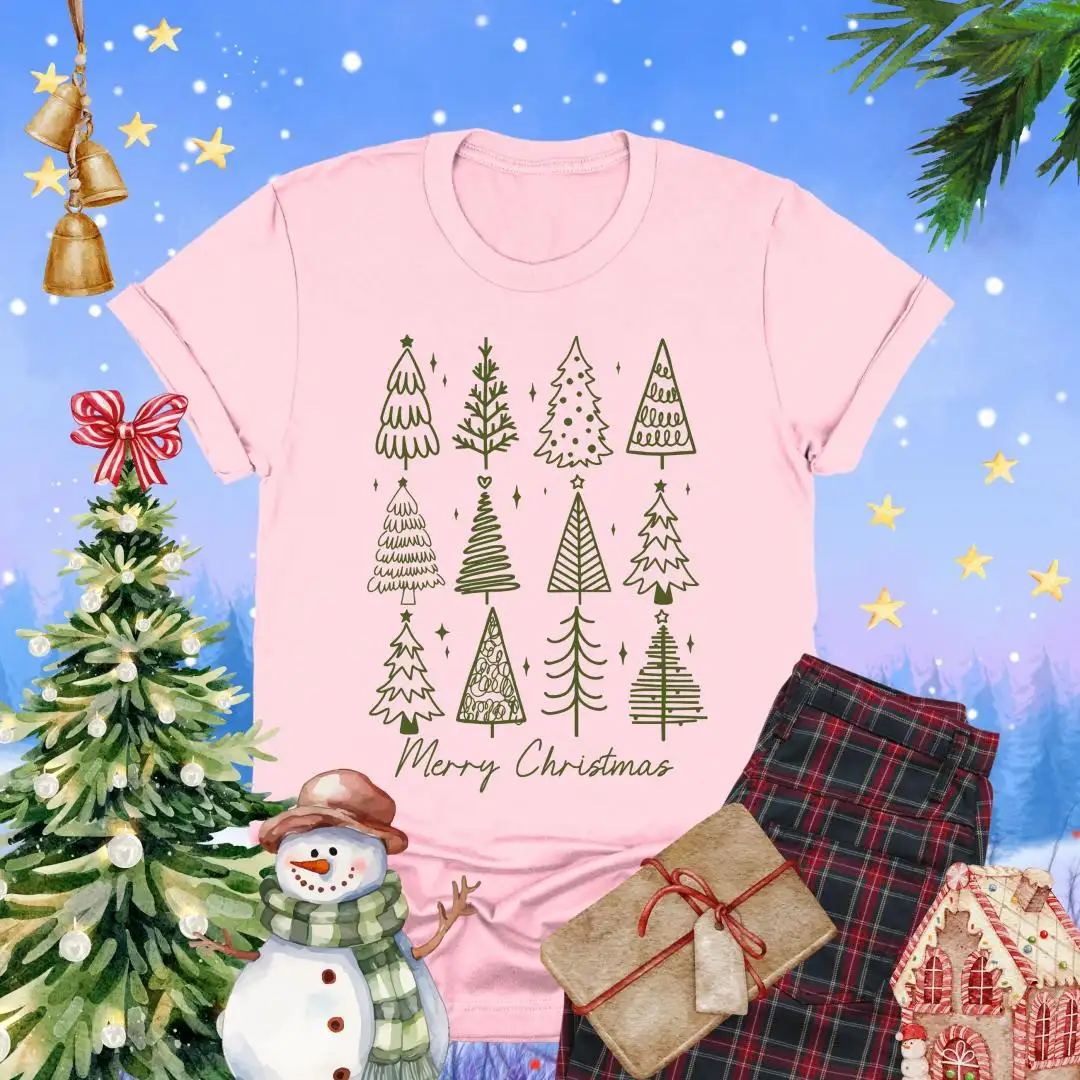 Review Merry Christmas Shirt, Holiday Gift For Women, Christmas Vacation Shirt, Minimalist Xmas Shirt, Winter Season, Christmas Pine Trees Shirt