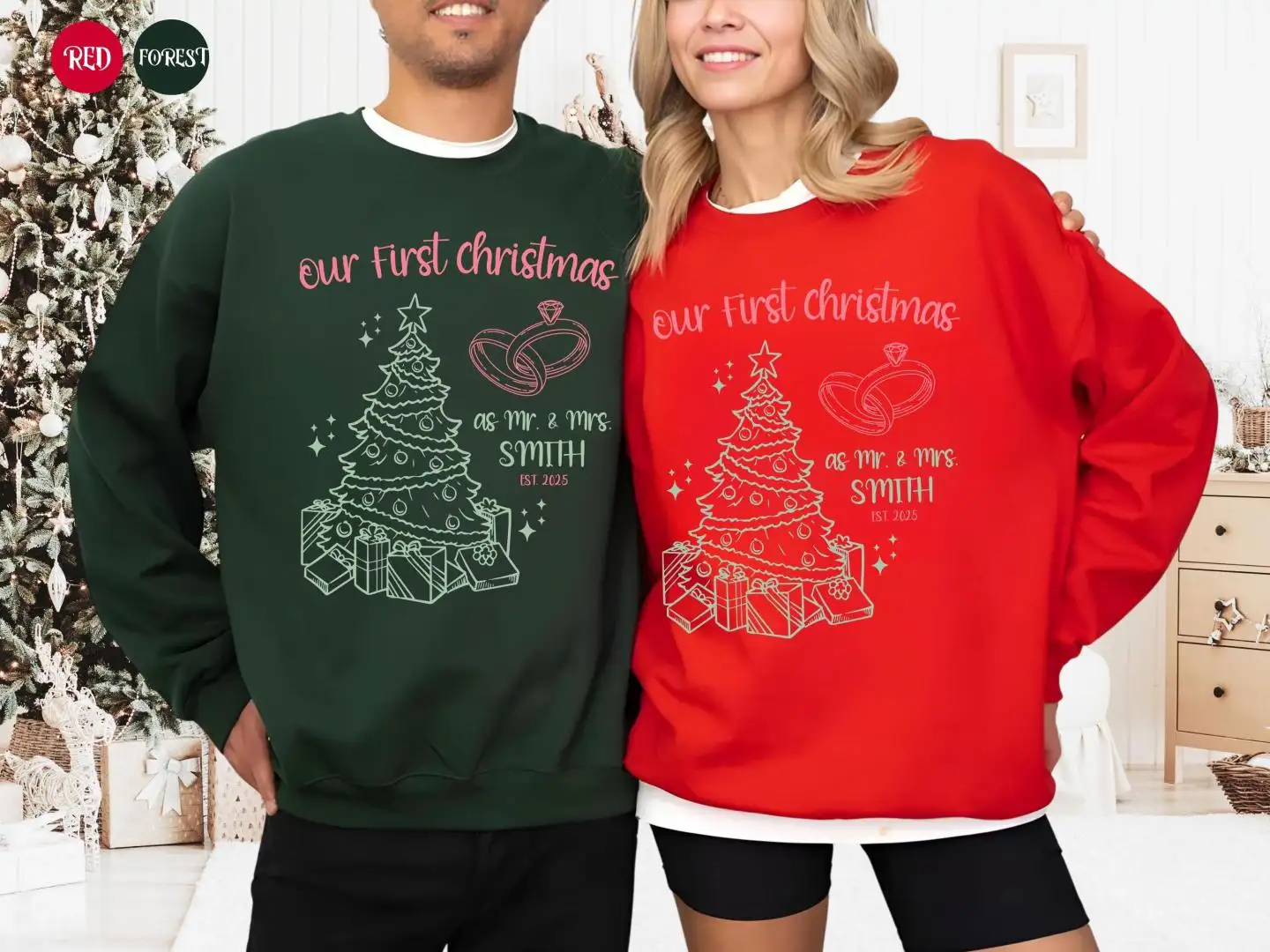 Our First Christmas as Mr & Mrs Sweatshirt, First Holiday Custom Pullover, Personalized Married Couple Xmas Gift, Newlywed Christmas Hoodie