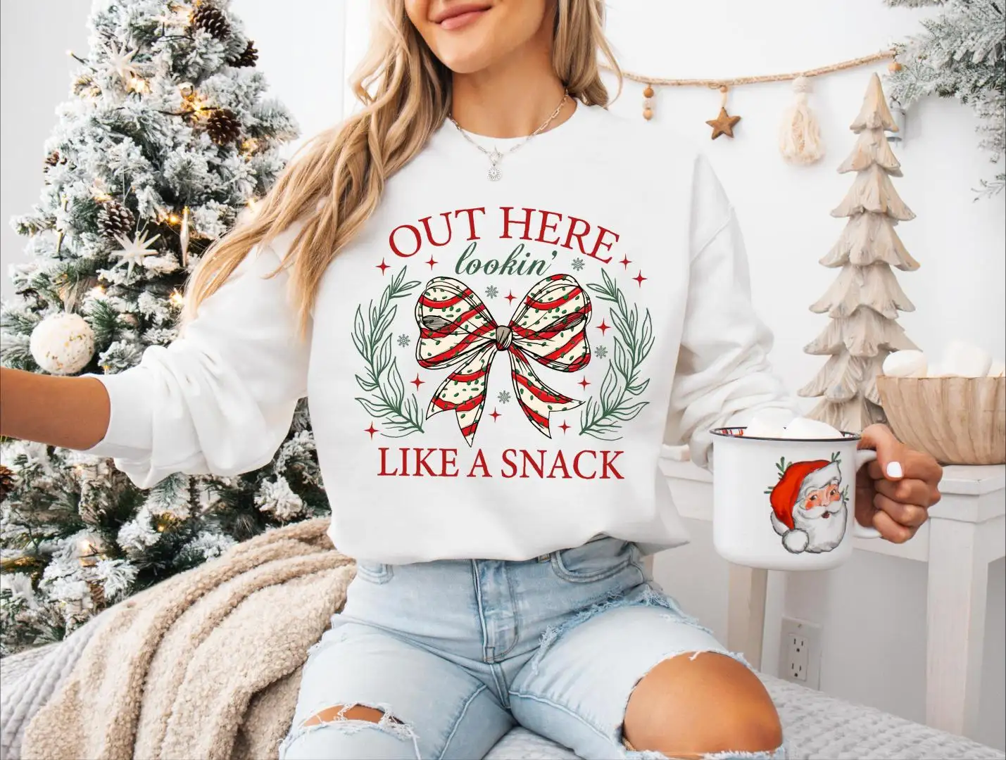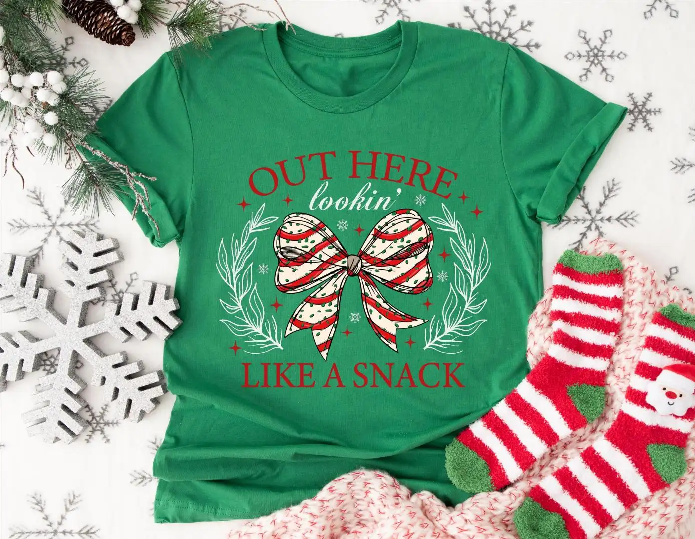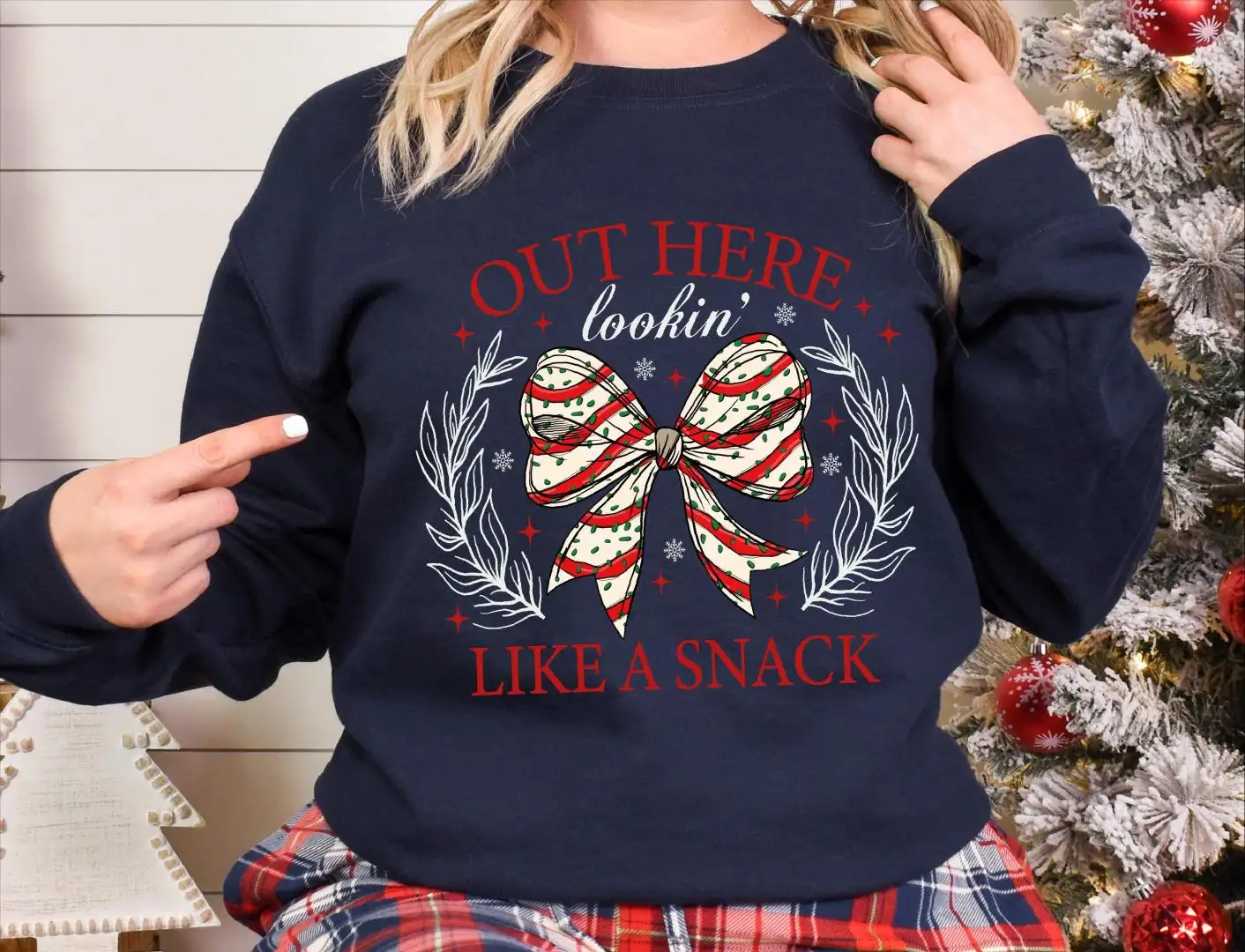 Out Here Lookin Like A Snack Christmas Shirt, Christmas Snack Sweatshirt, Winter Christmas Coquette Bow Sweater, Merry Xmas Candy Tee