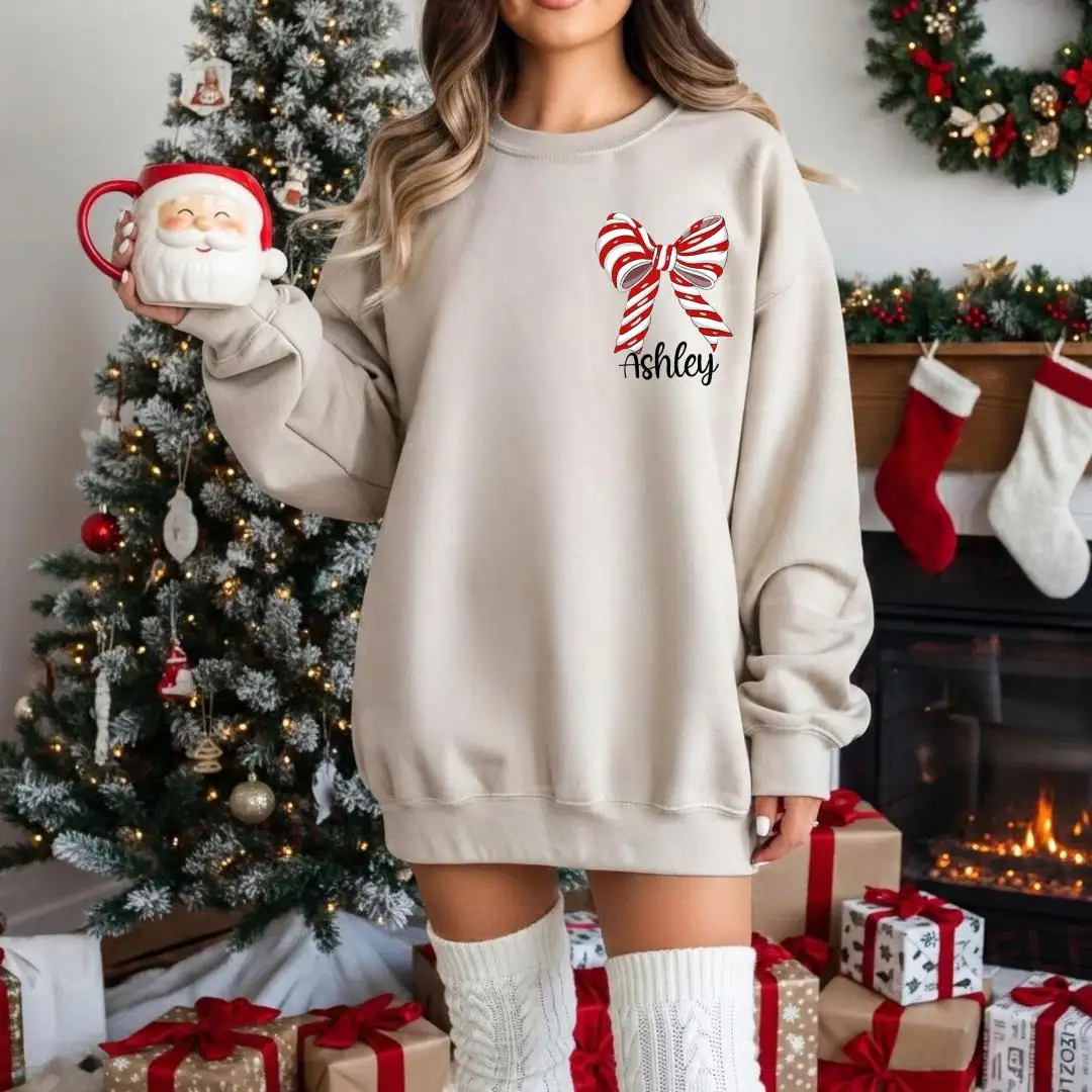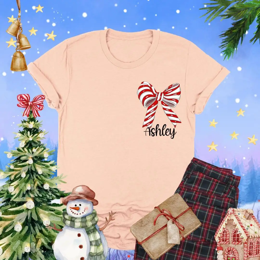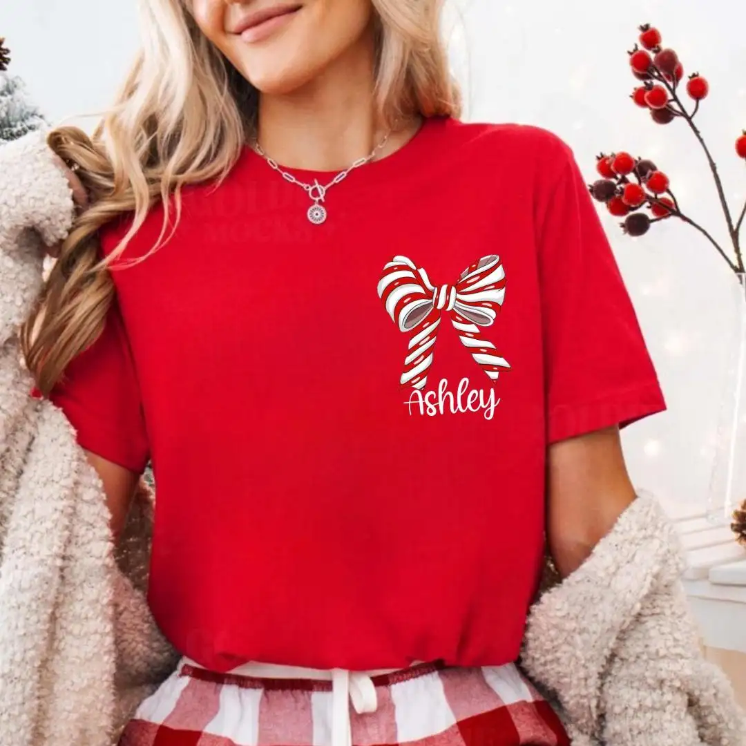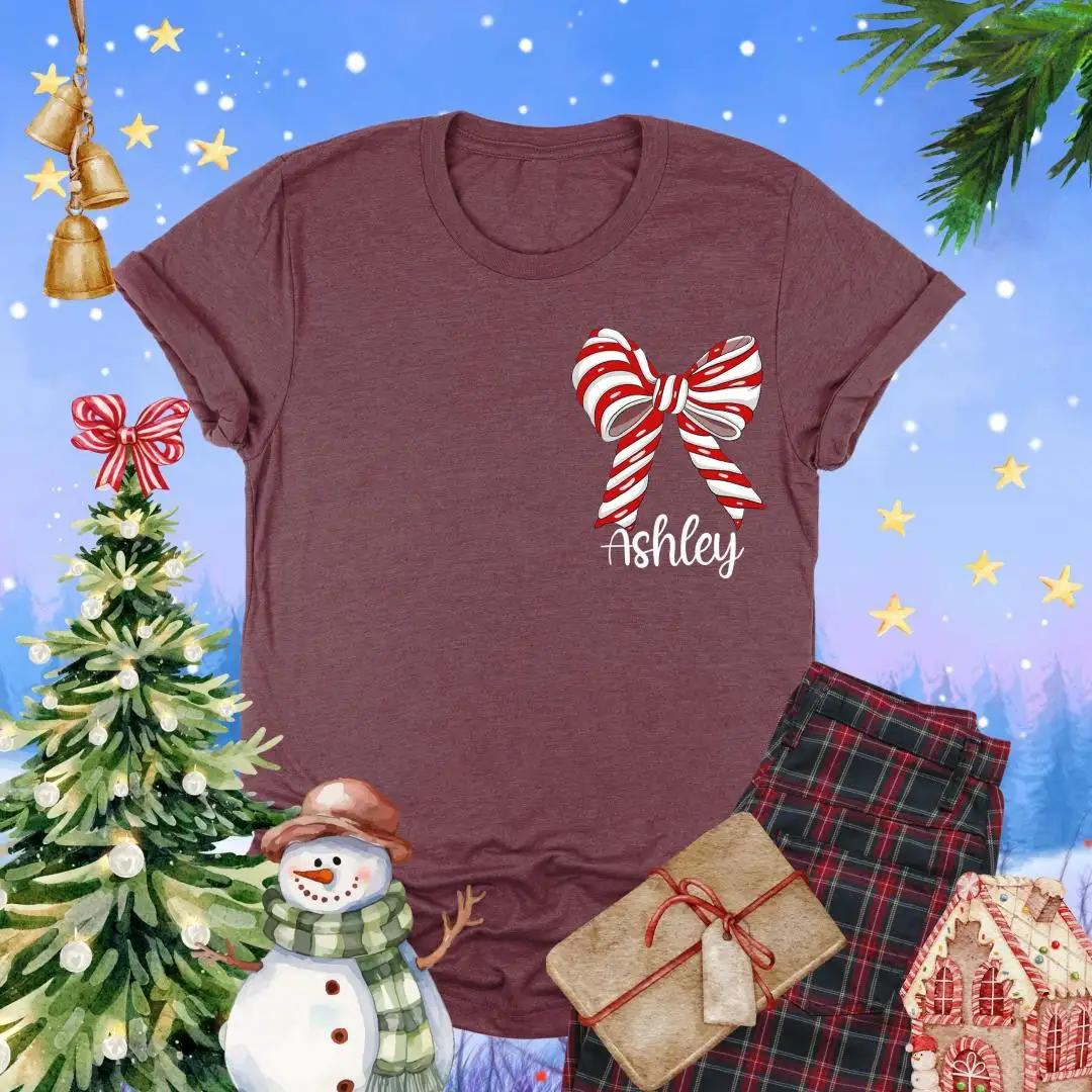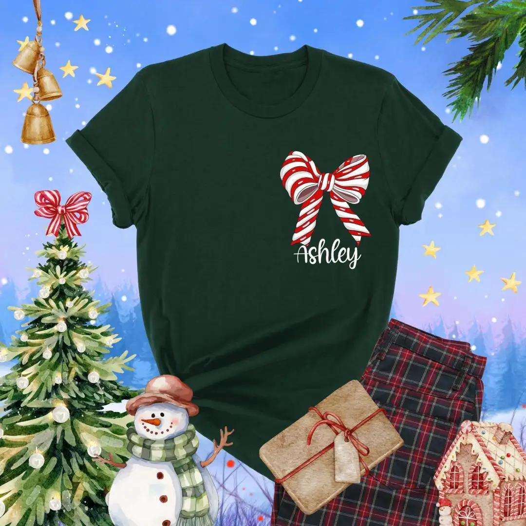 Personalized Women's Christmas Shirt, Kids Xmas Bow Shirt, Festive Gift Idea, Custom Name Christmas Shirt, Coquette Bow Holiday Tee