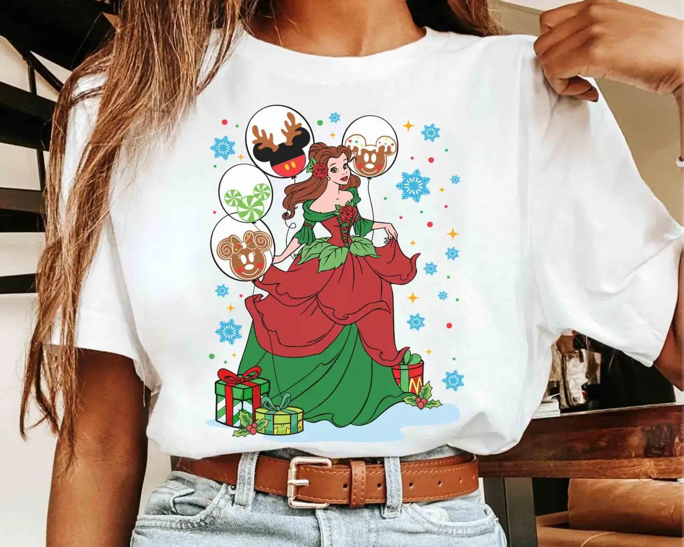 Retro 90s Beauty and The Beast Christmas Shirt, Couple Matching Gift, Holiday Tee, Disney Enchanted Balloons Design, Mickey_s Xmas Party