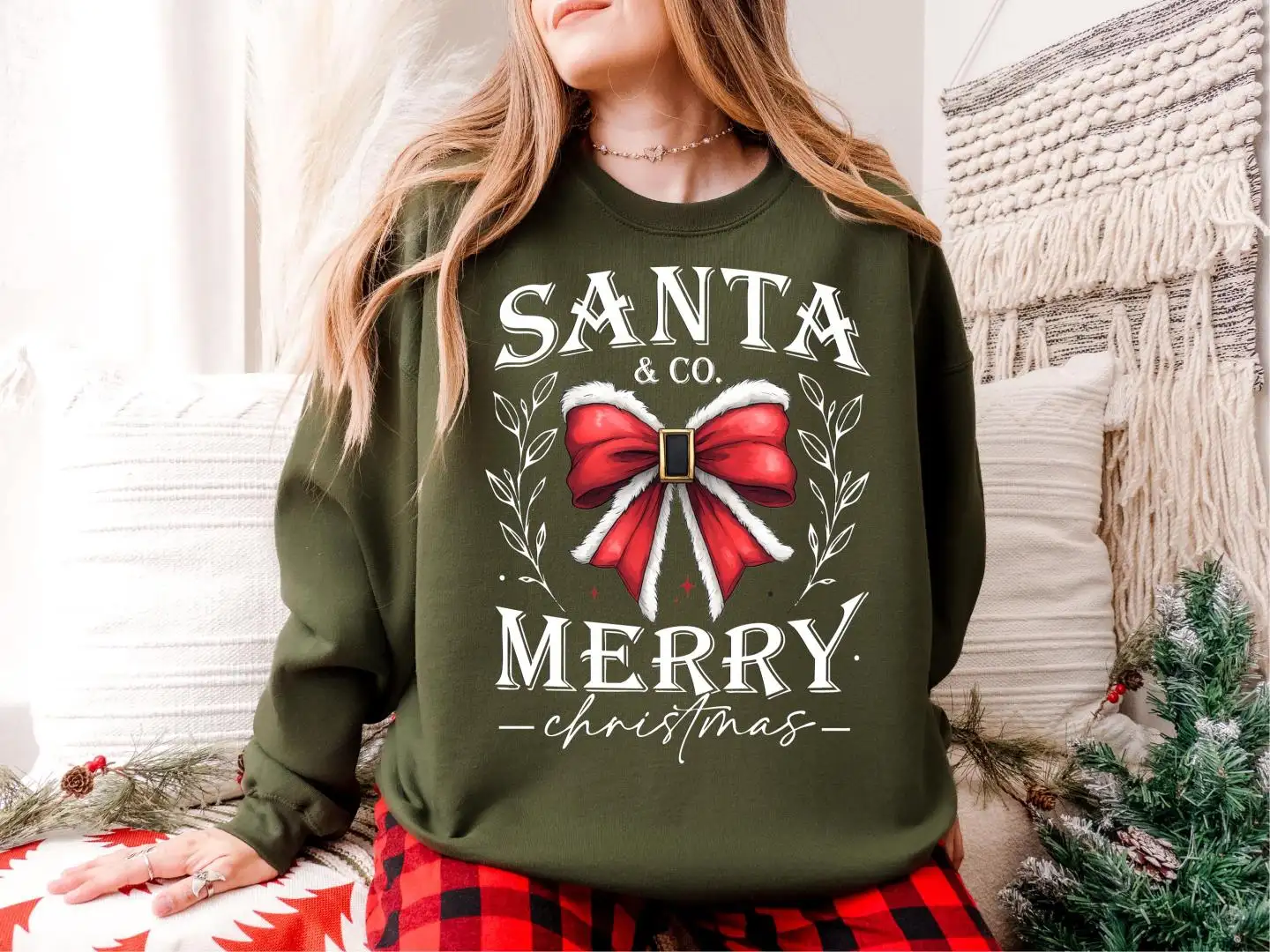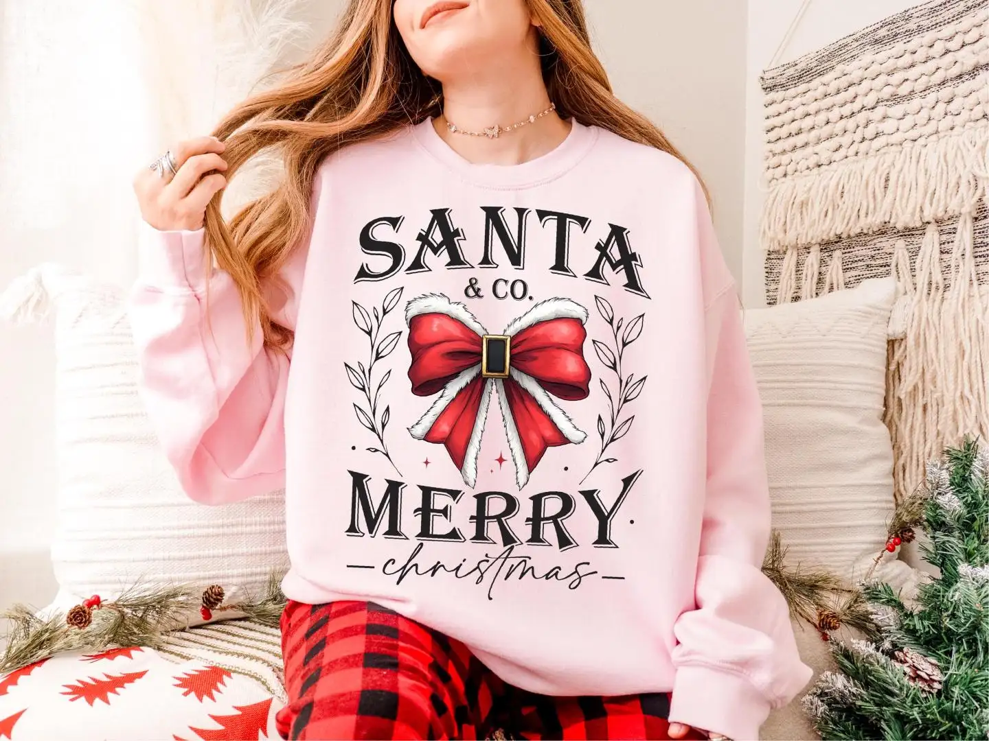 Review Santa & Co. Merry Christmas Shirt, Christmas Santa Bow Sweater, Christmas Coquette Bow Tee, Merry Christmas T-Shirt, Santa and Co Sweatshirt