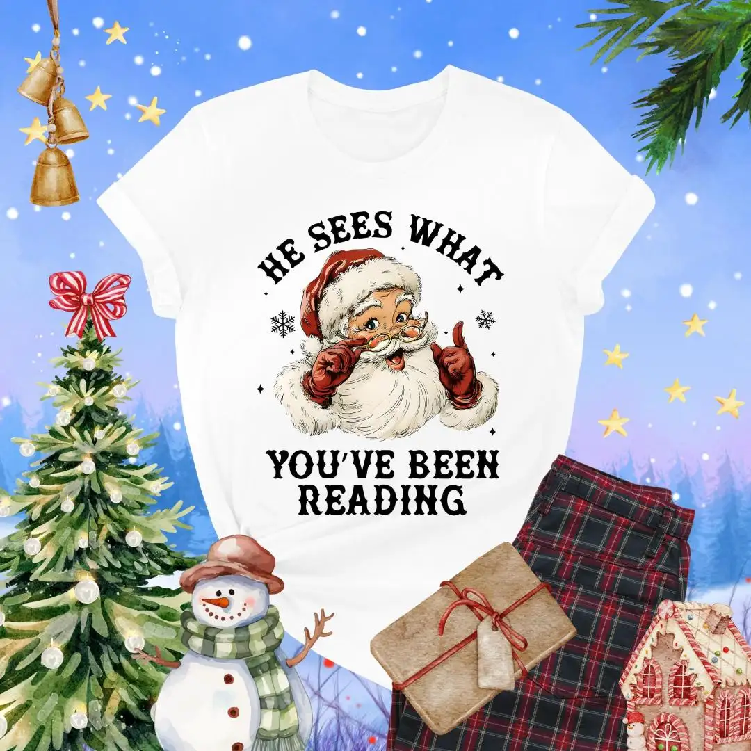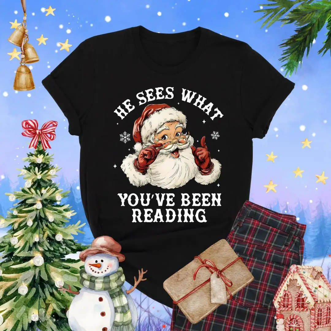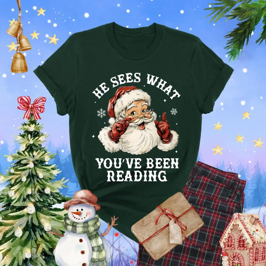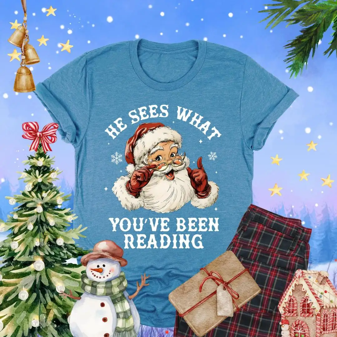 Santa Reading Shirt, He Sees What You’ve Been Reading Shirt, Christmas Book Shirt, Santa Bookworm Tee, Book Lovers Gift, Reading Holiday Top