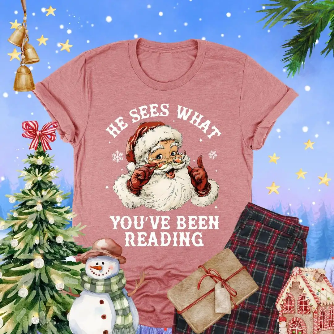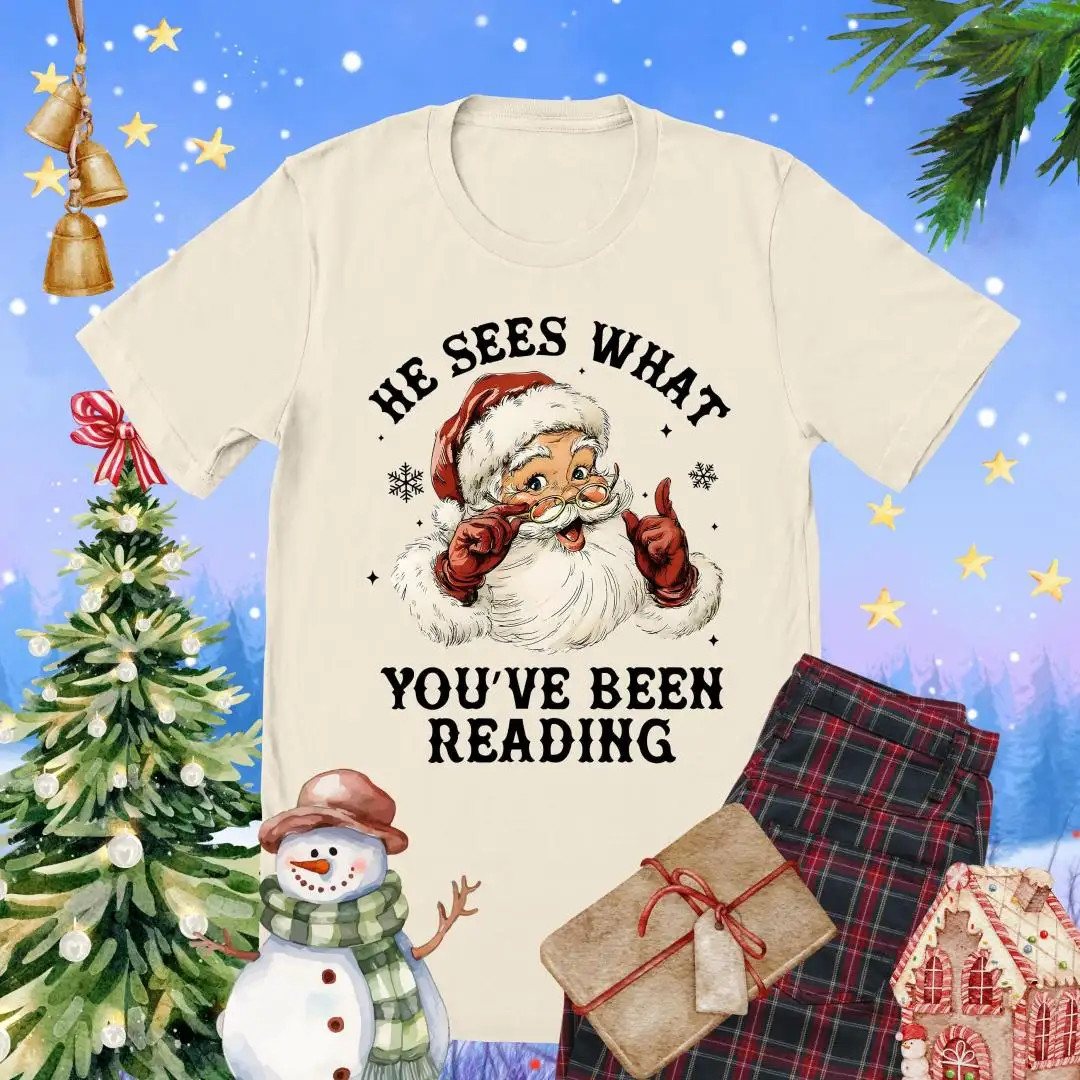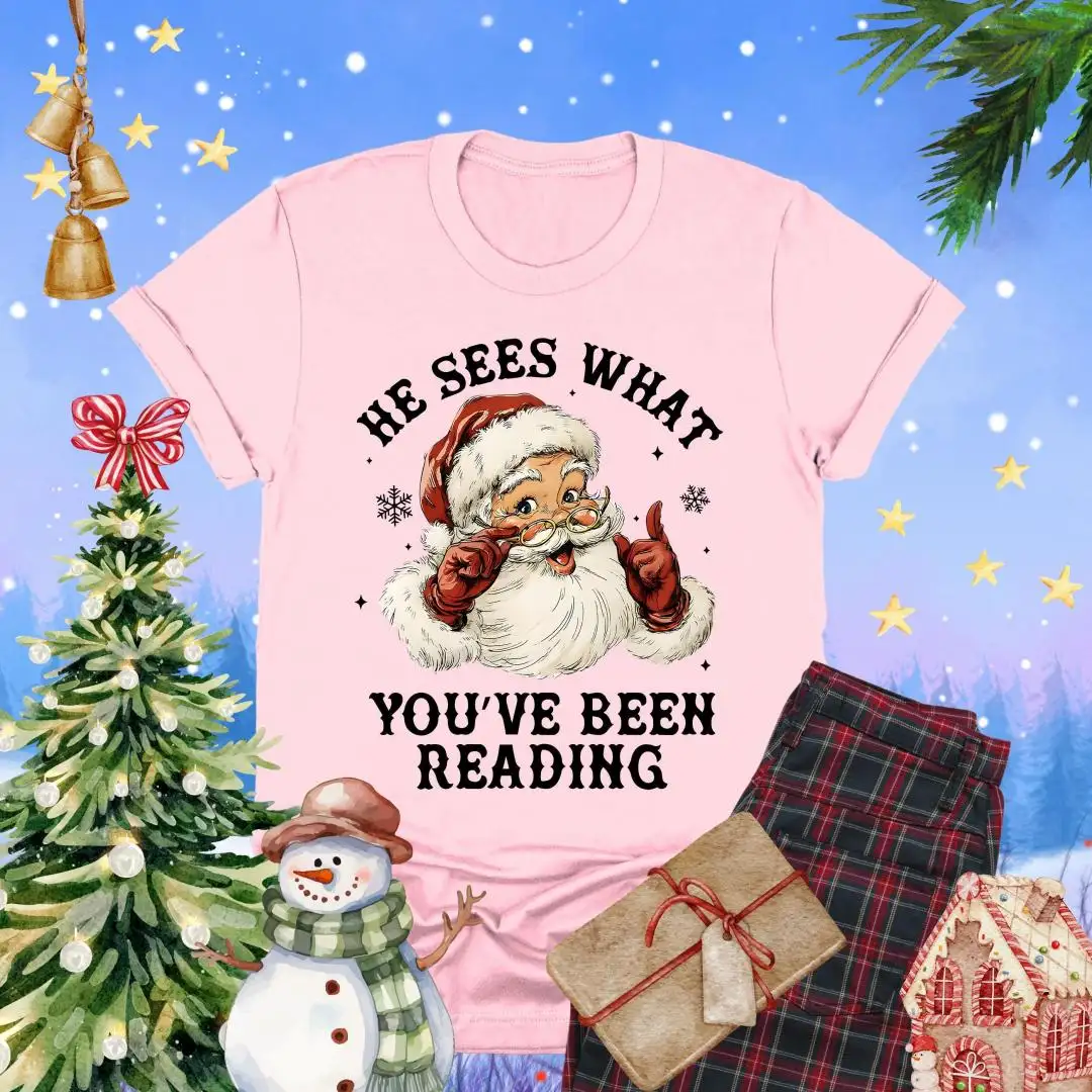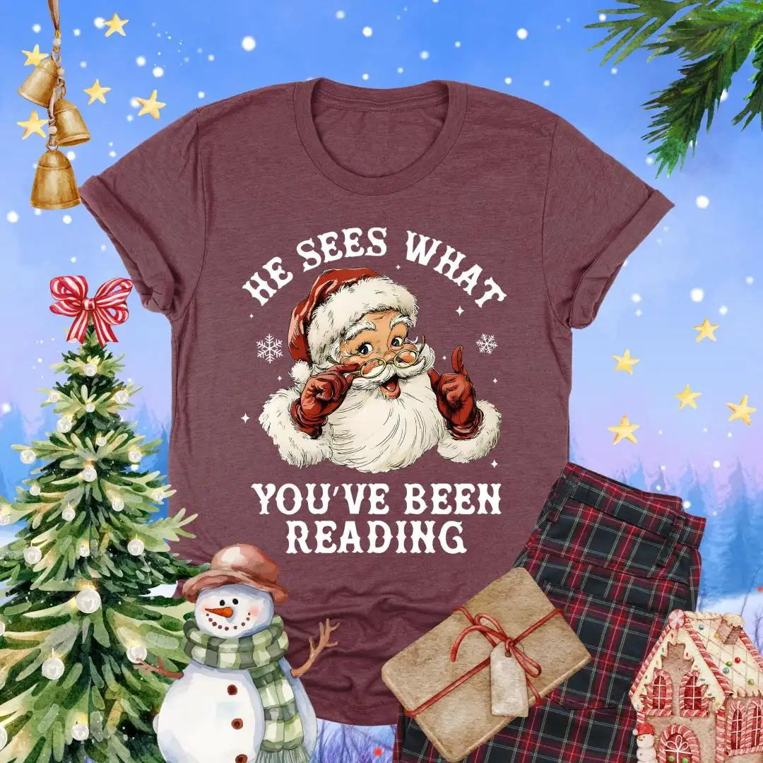 Santa Reading Shirt, He Sees What You’ve Been Reading Shirt, Christmas Book Shirt, Santa Bookworm Tee, Book Lovers Gift, Reading Holiday Top