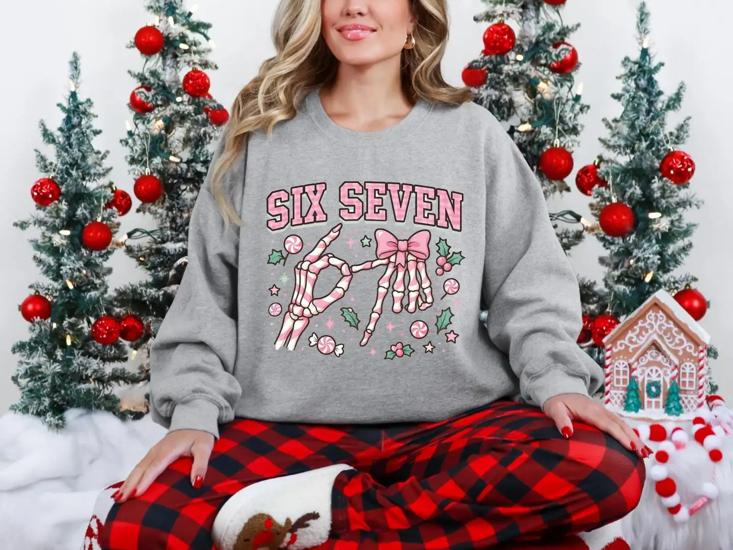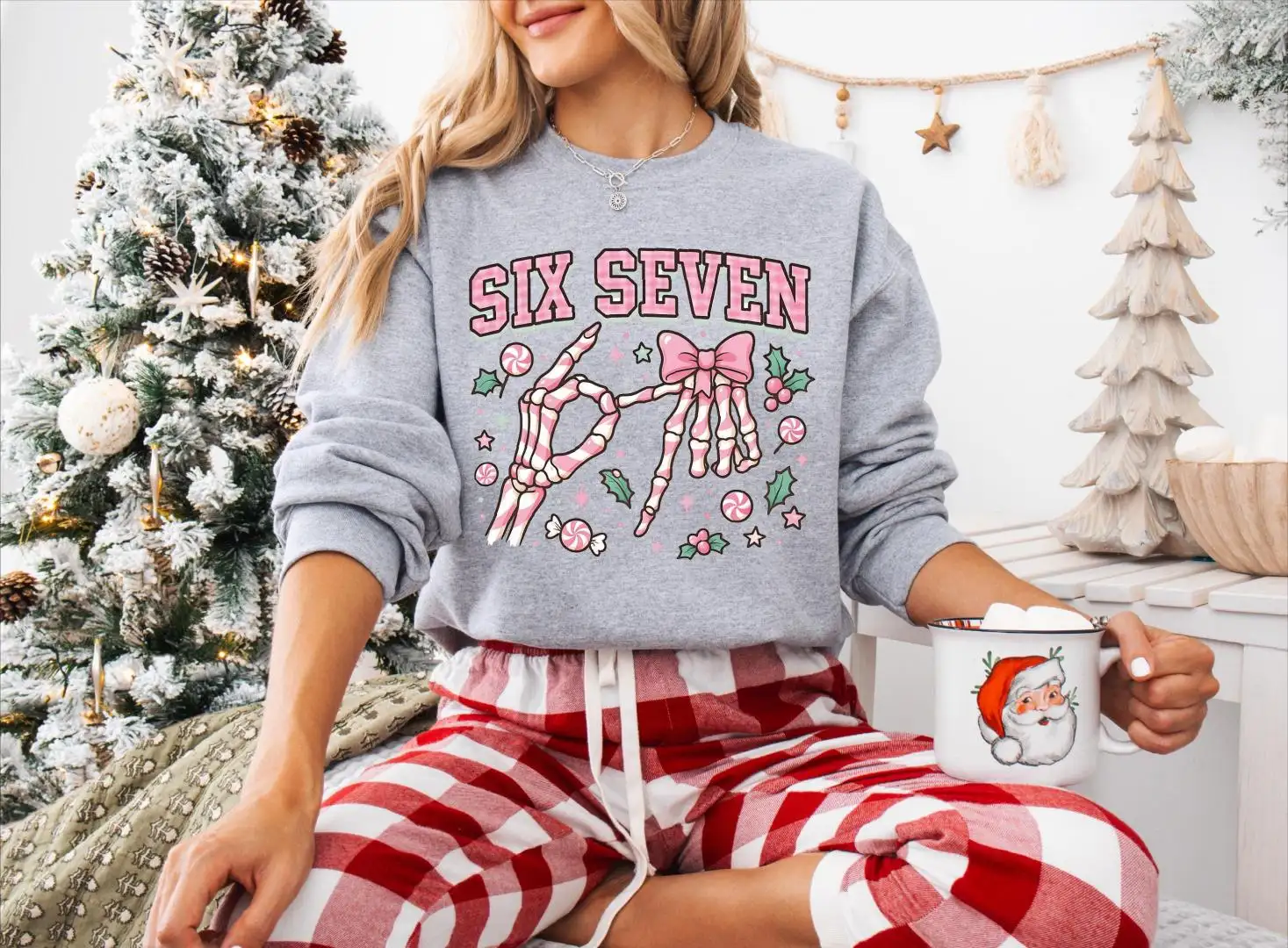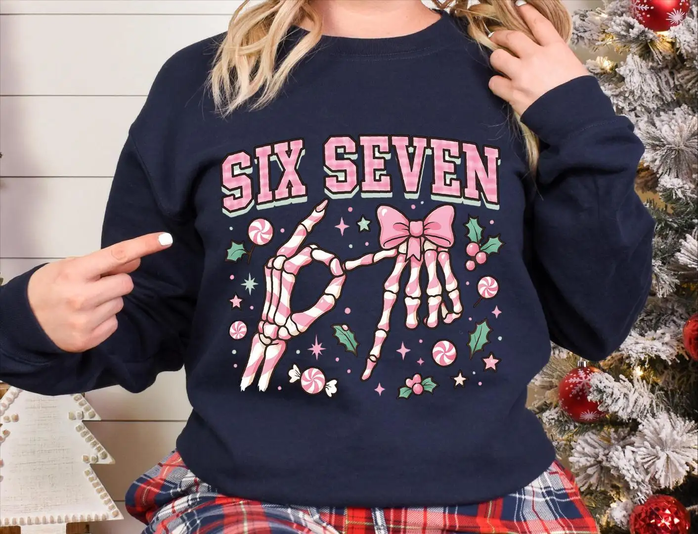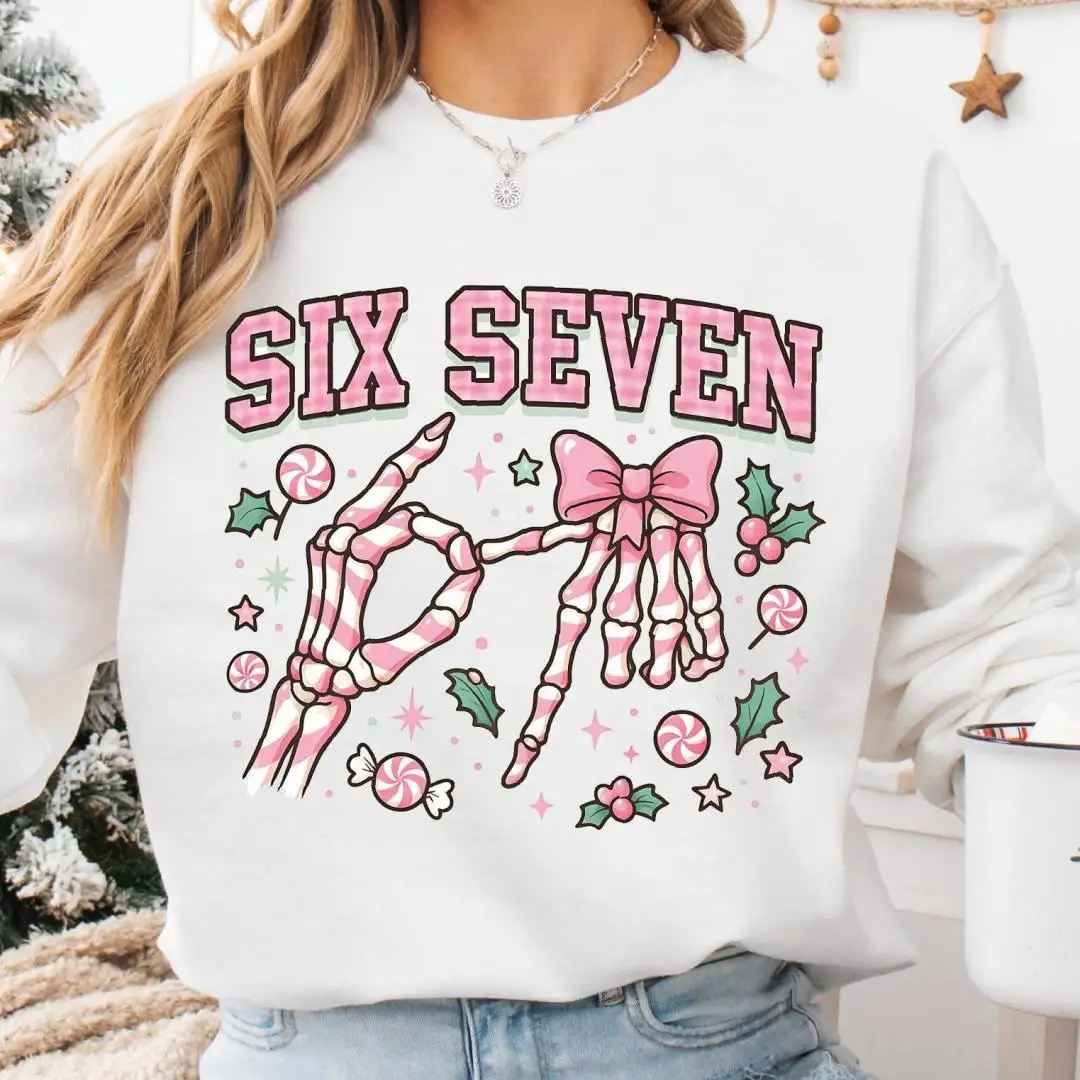Six Seven Skeleton Hands Christmas Candy Shirt, Six Seven Meme Tee, Merry Christmas Pink 67 Sweatshirt, Funny Christmas Meme Sweater