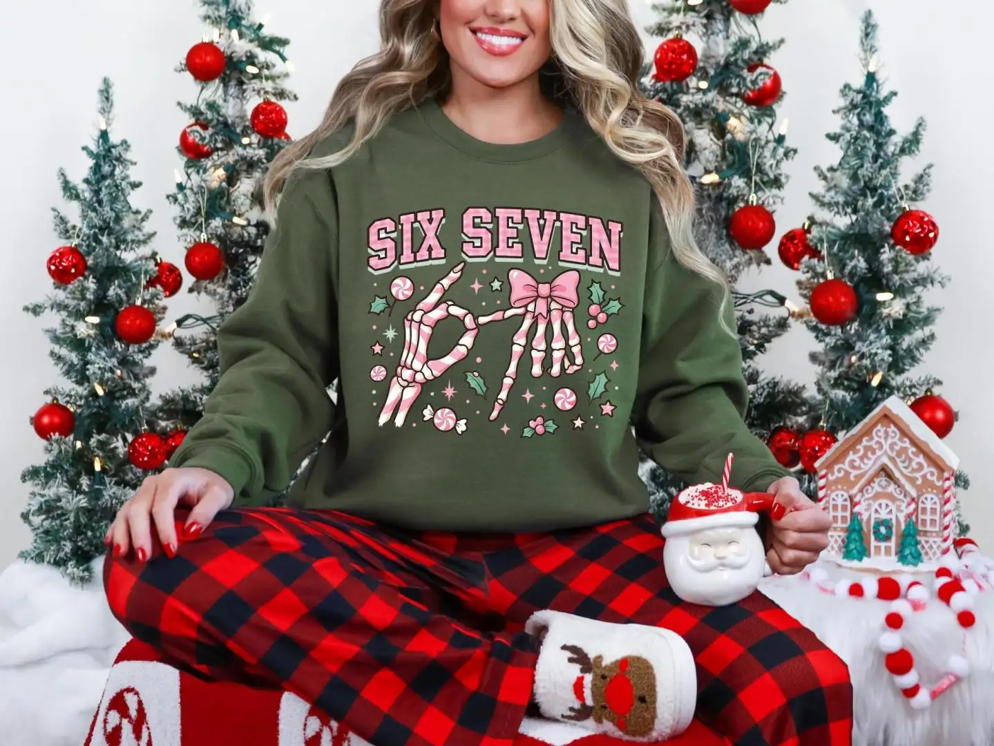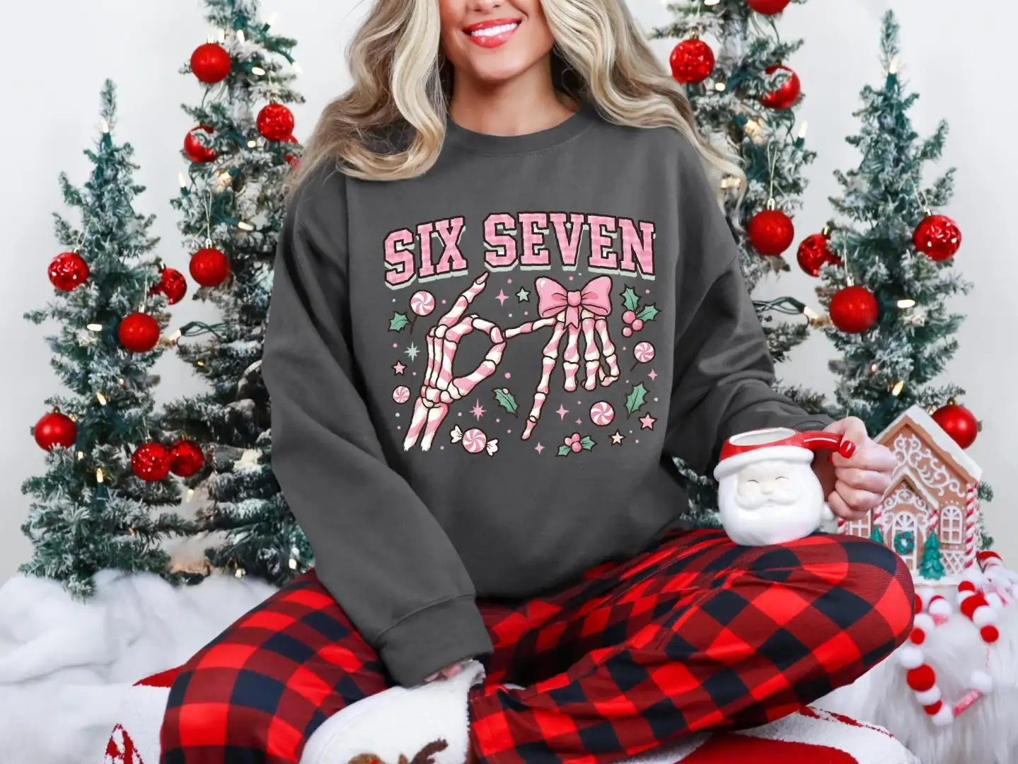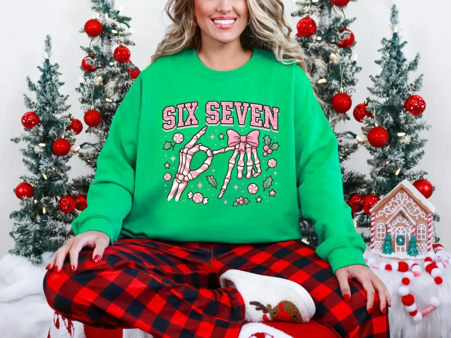 Six Seven Skeleton Hands Christmas Candy Shirt, Six Seven Meme Tee, Merry Christmas Pink 67 Sweatshirt, Funny Christmas Meme Sweater
