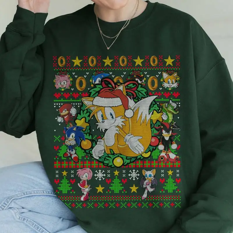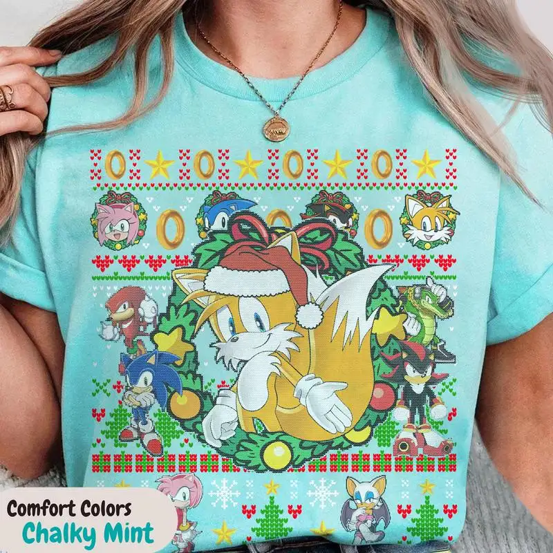 Review Sonic Miles Tails Prower Ugly Christmas Shirt, Sonic Amy Rose Miles Shirt, Family Christmas Shirts 01, Sonic The Hedgehog Christmas Shirt