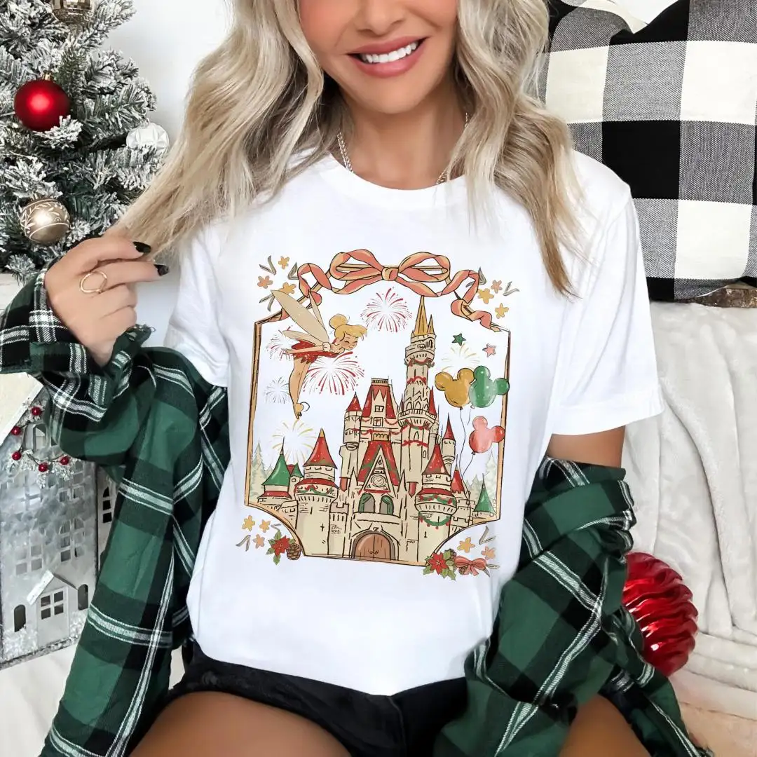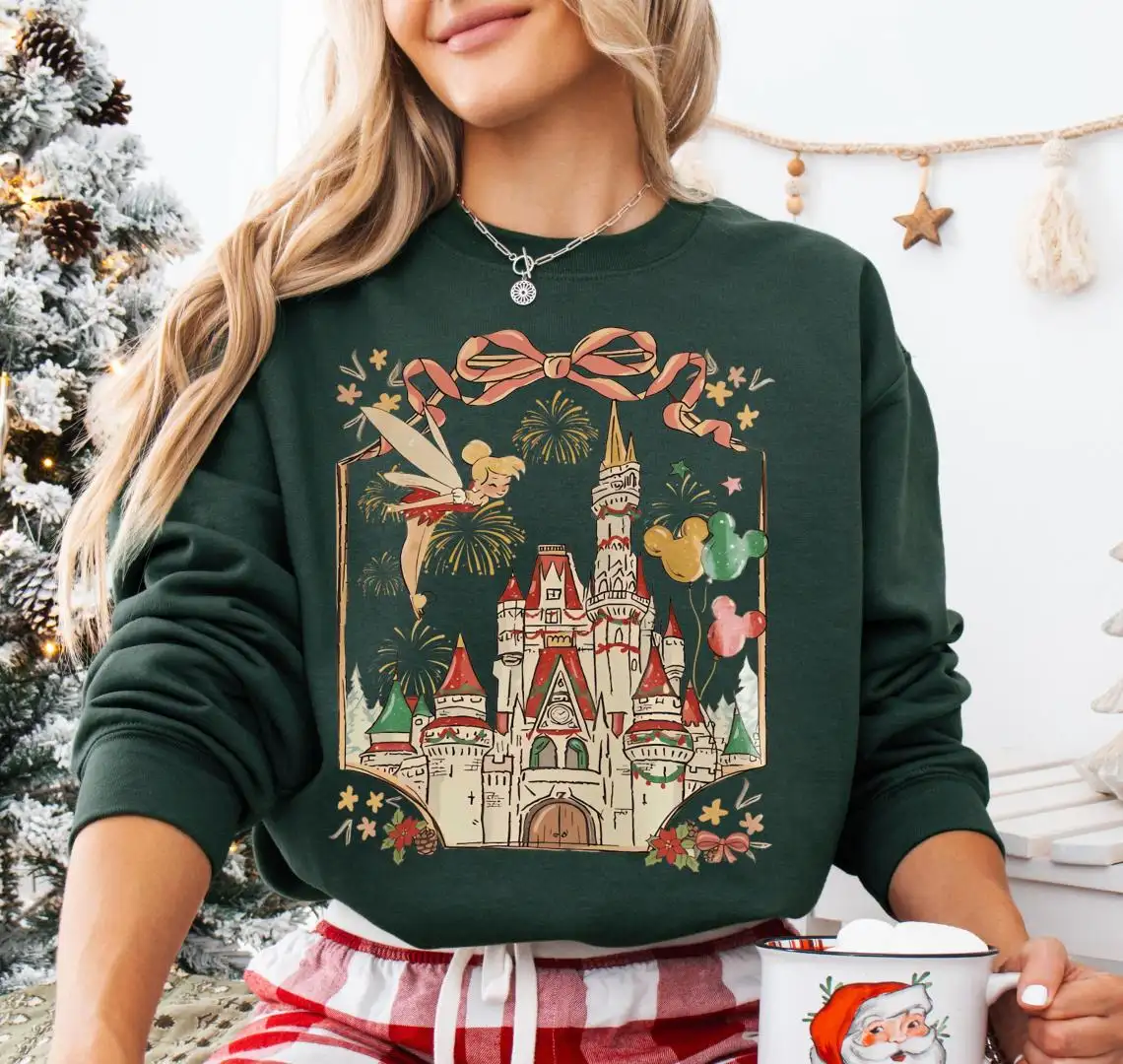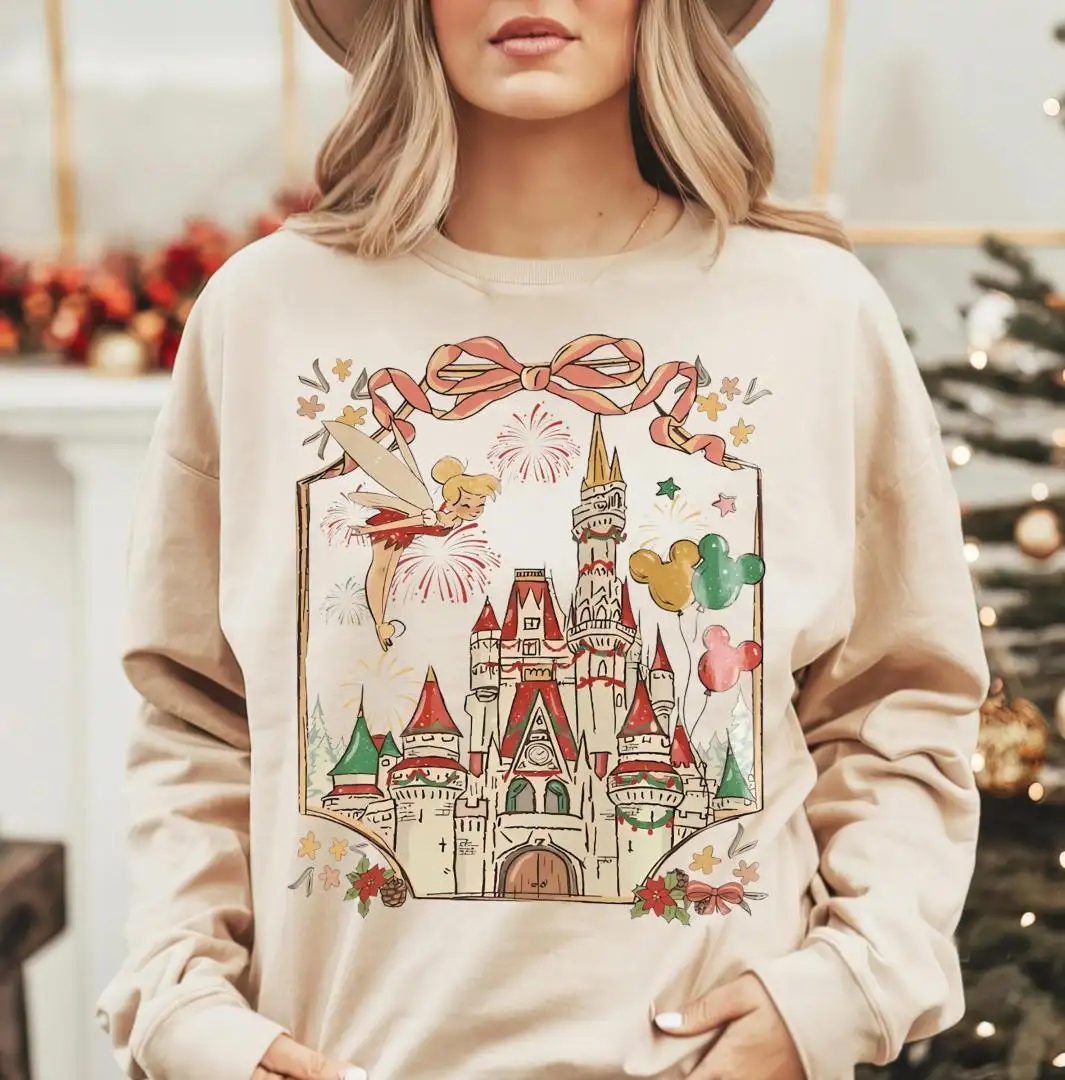 Tinker Bell Christmas Coquette Bow Sweatshirt, Girls Xmas Trip Shirt, Disneyland Castle Christmas Tee, Disney Fairy Neverland Xmas T-Shirt
