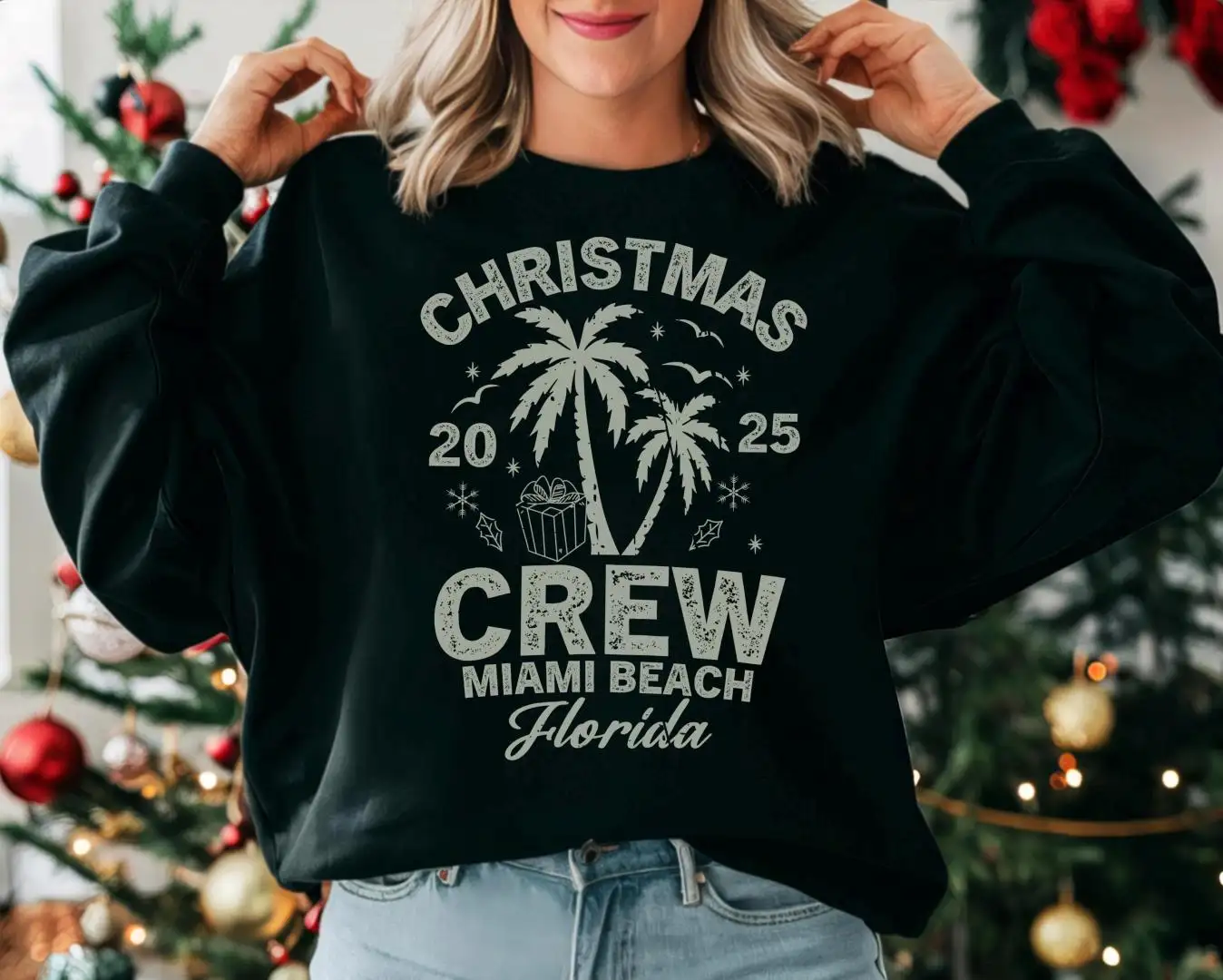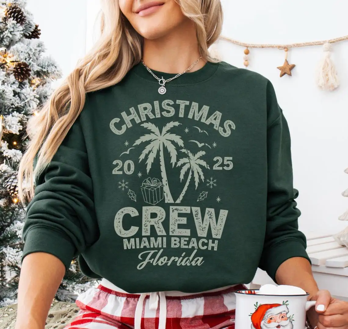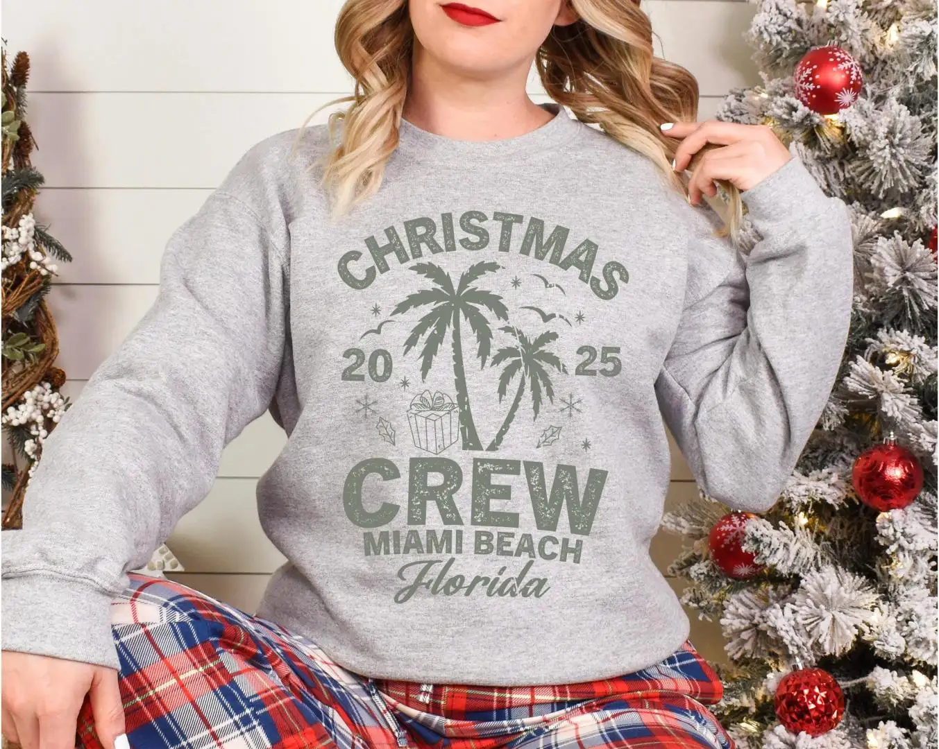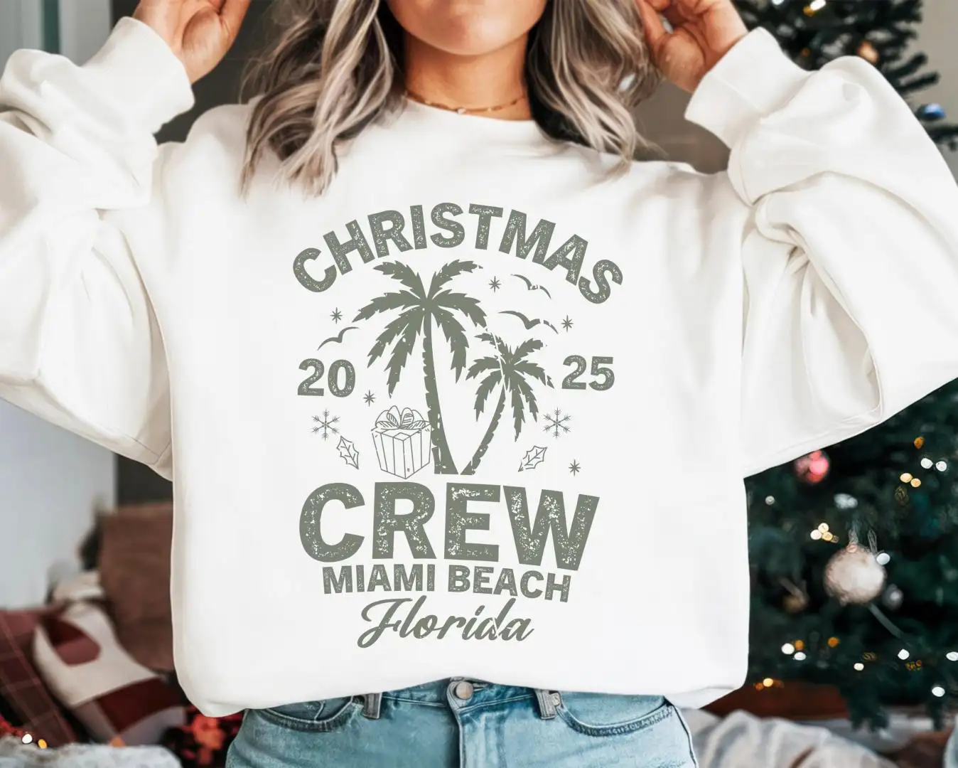 Tropical Christmas Crew 2025 Shirt, Family Holiday Shirt, Beach Christmas Vibes T-Shirt, Miami Beach Xmas T-Shirt, Christmas Tree Sweatshirt