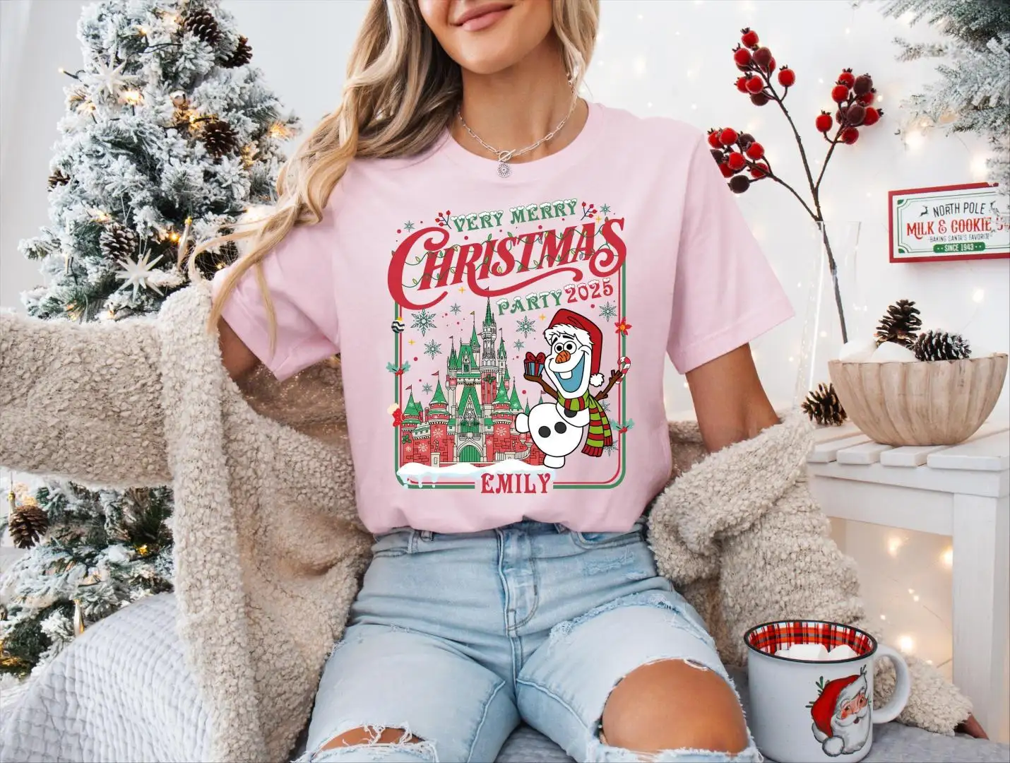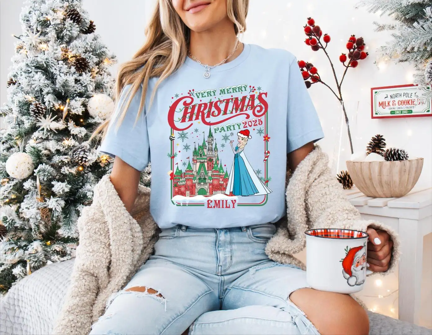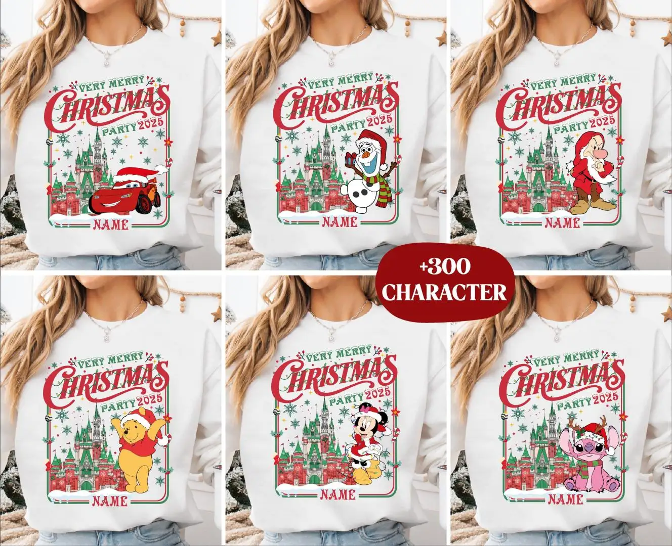 Very Merry Christmas Party 2025 Disney Characters Shirt, Disney World Christmas Castle Custom Tee, Disney Matching Family Xmas Sweater