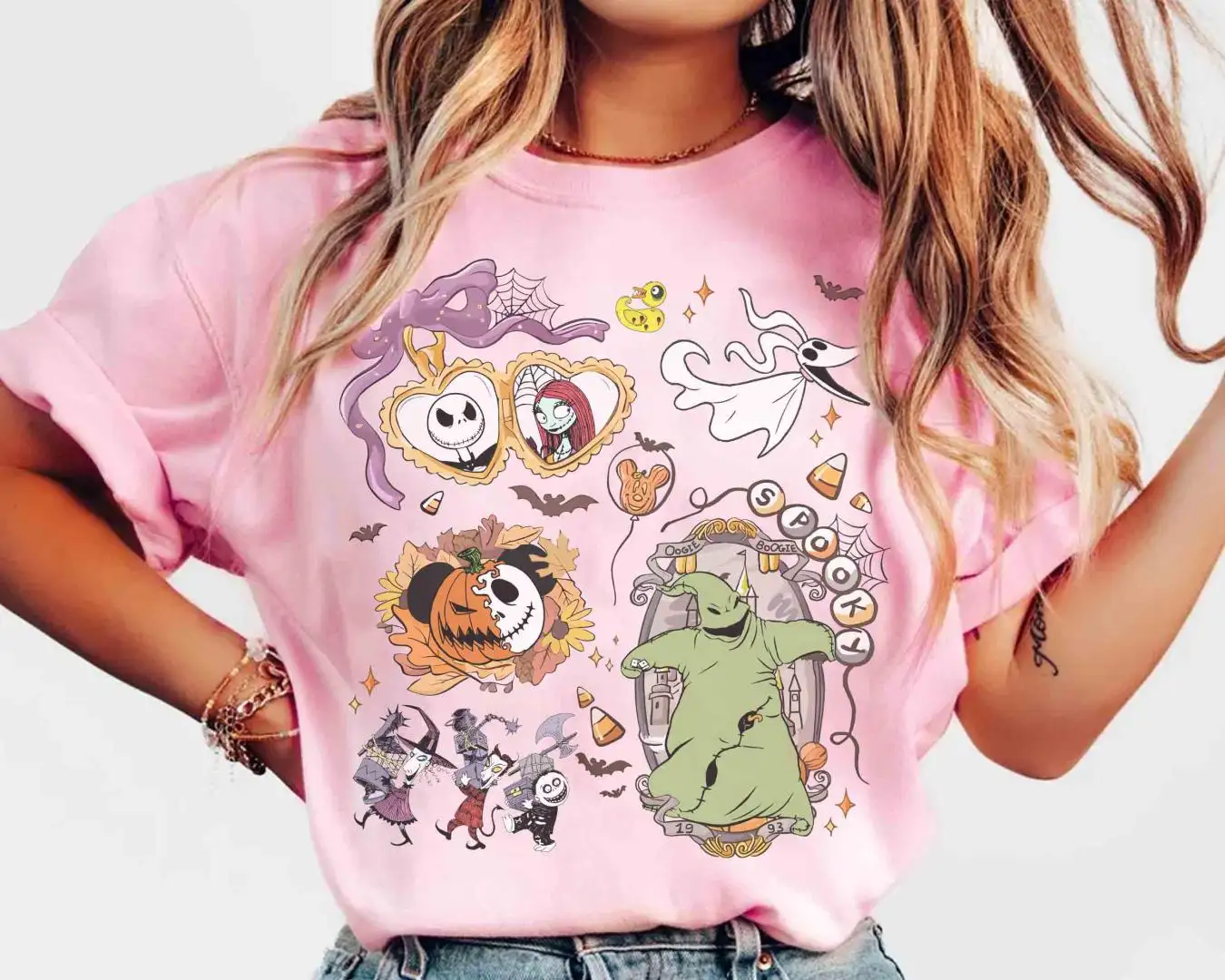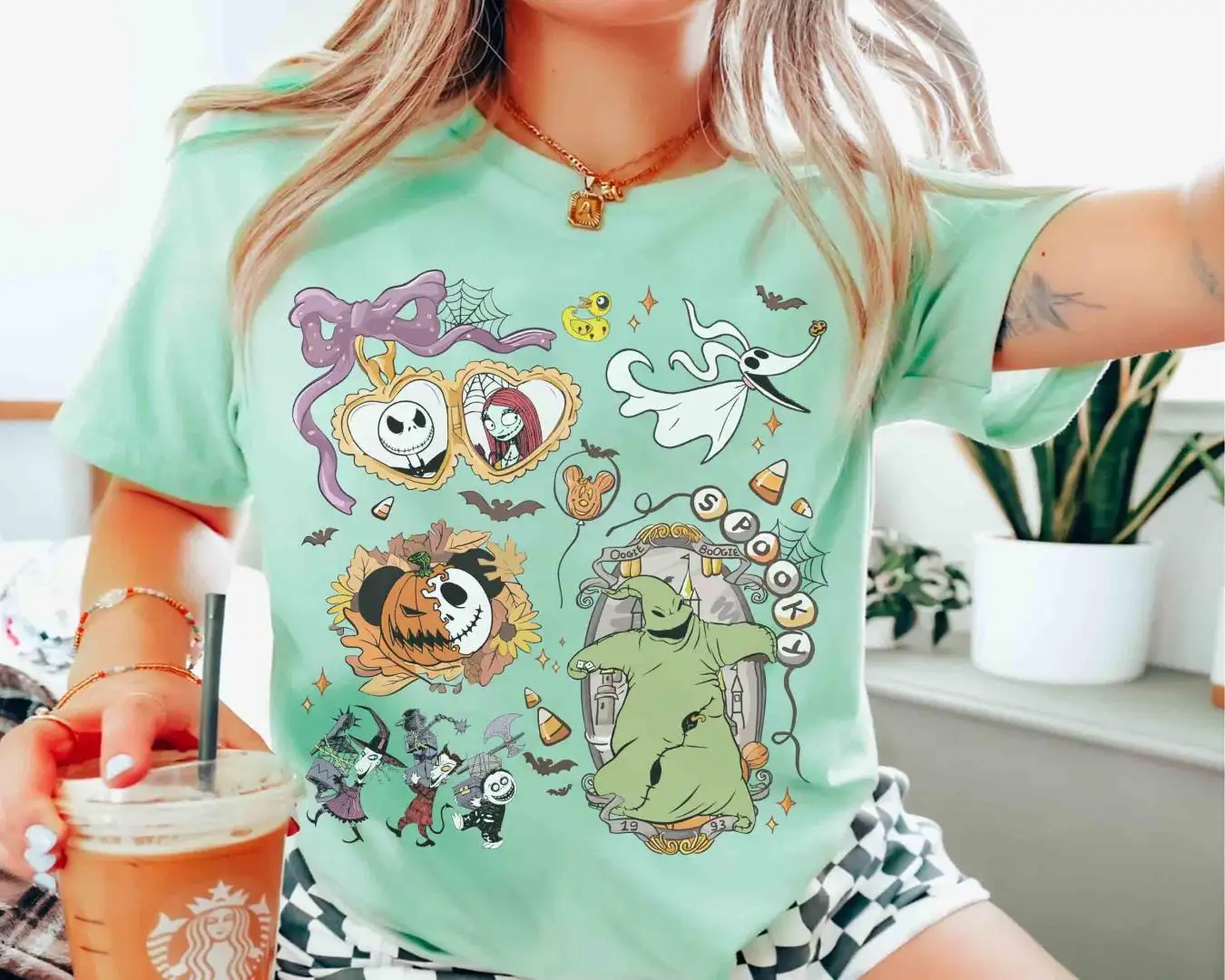 Watercolor Coquette Nightmare Before Christmas T-shirt, WDW Family Trip Tee, Oogie Boogie Bash 2025, Jack Skellington & Sally Halloween Tee
